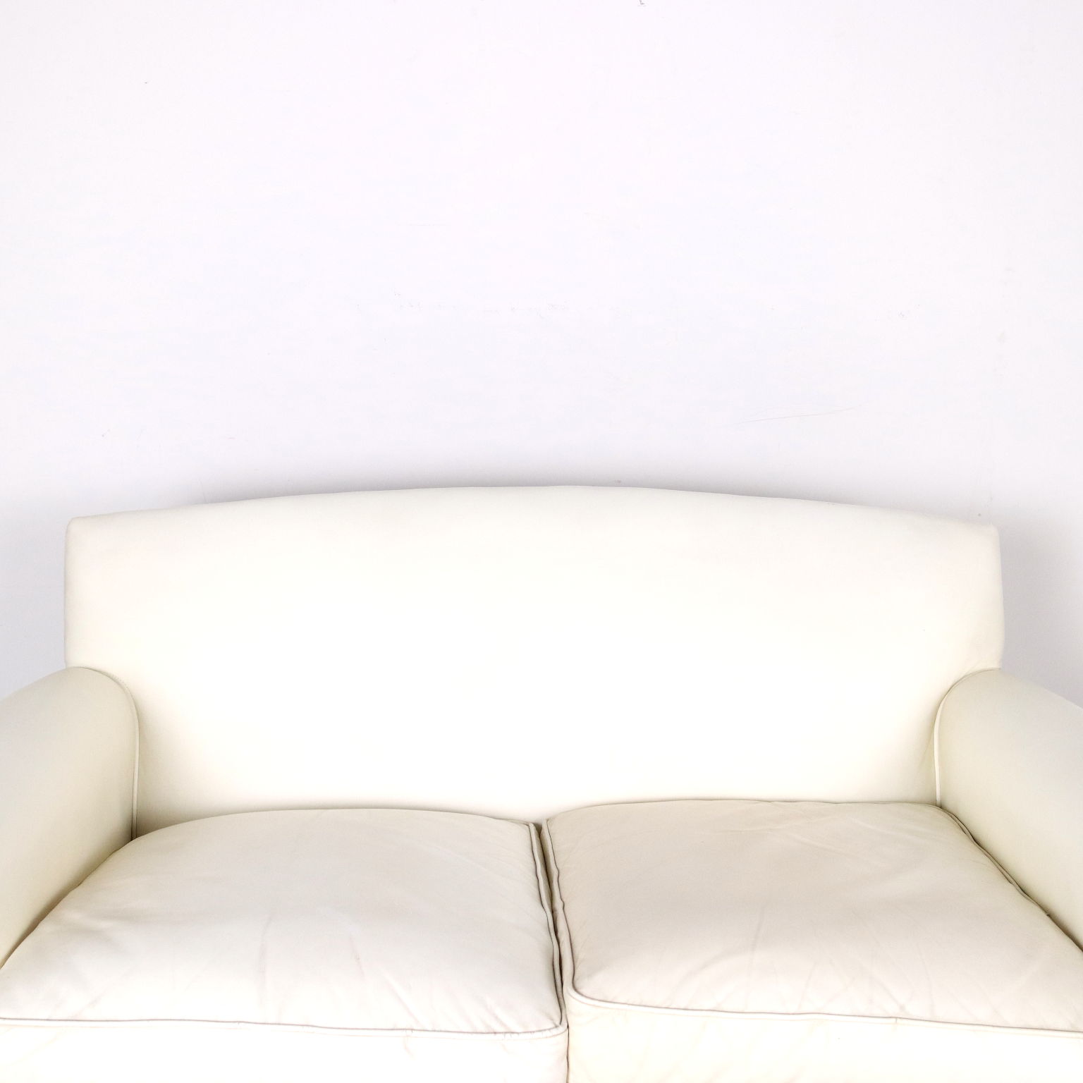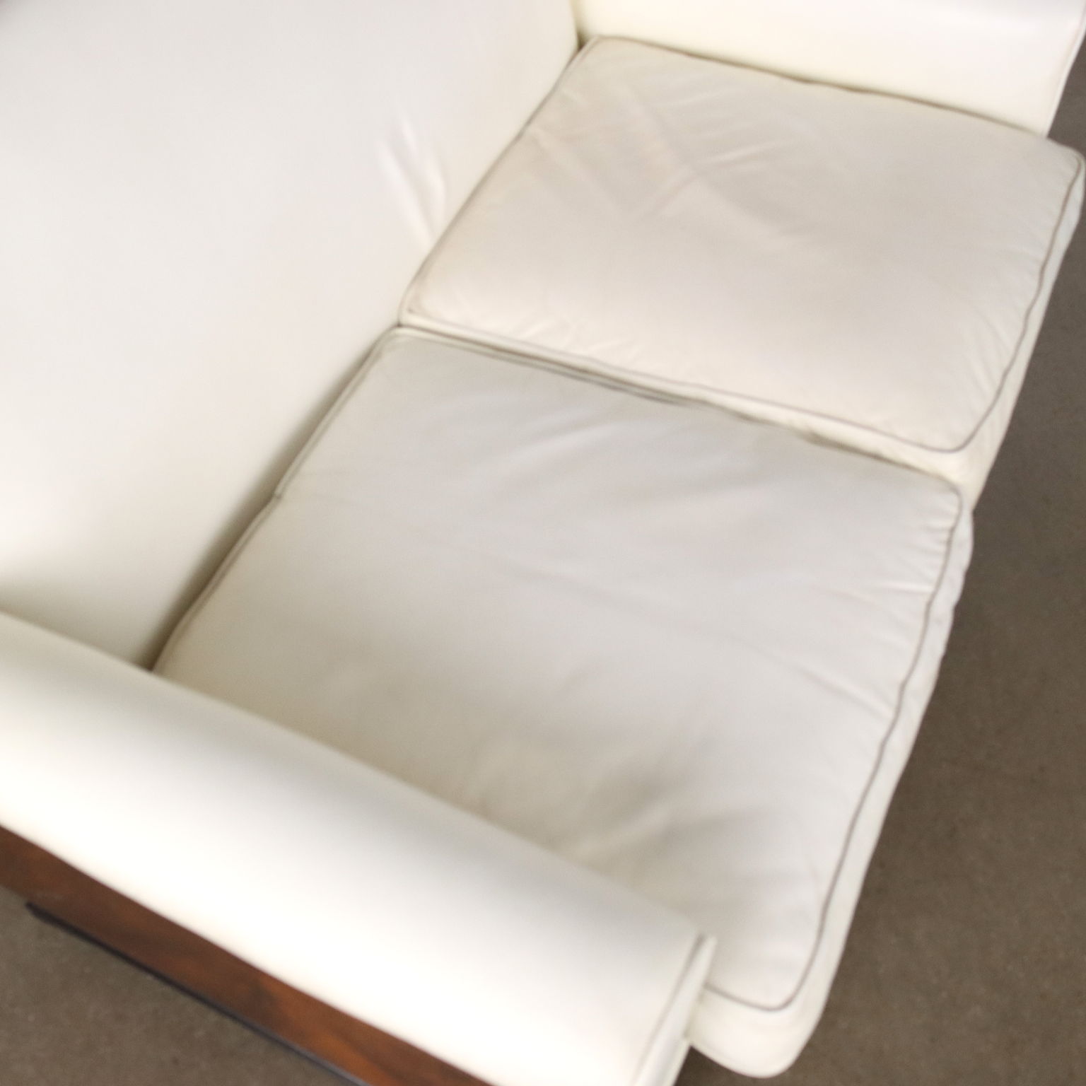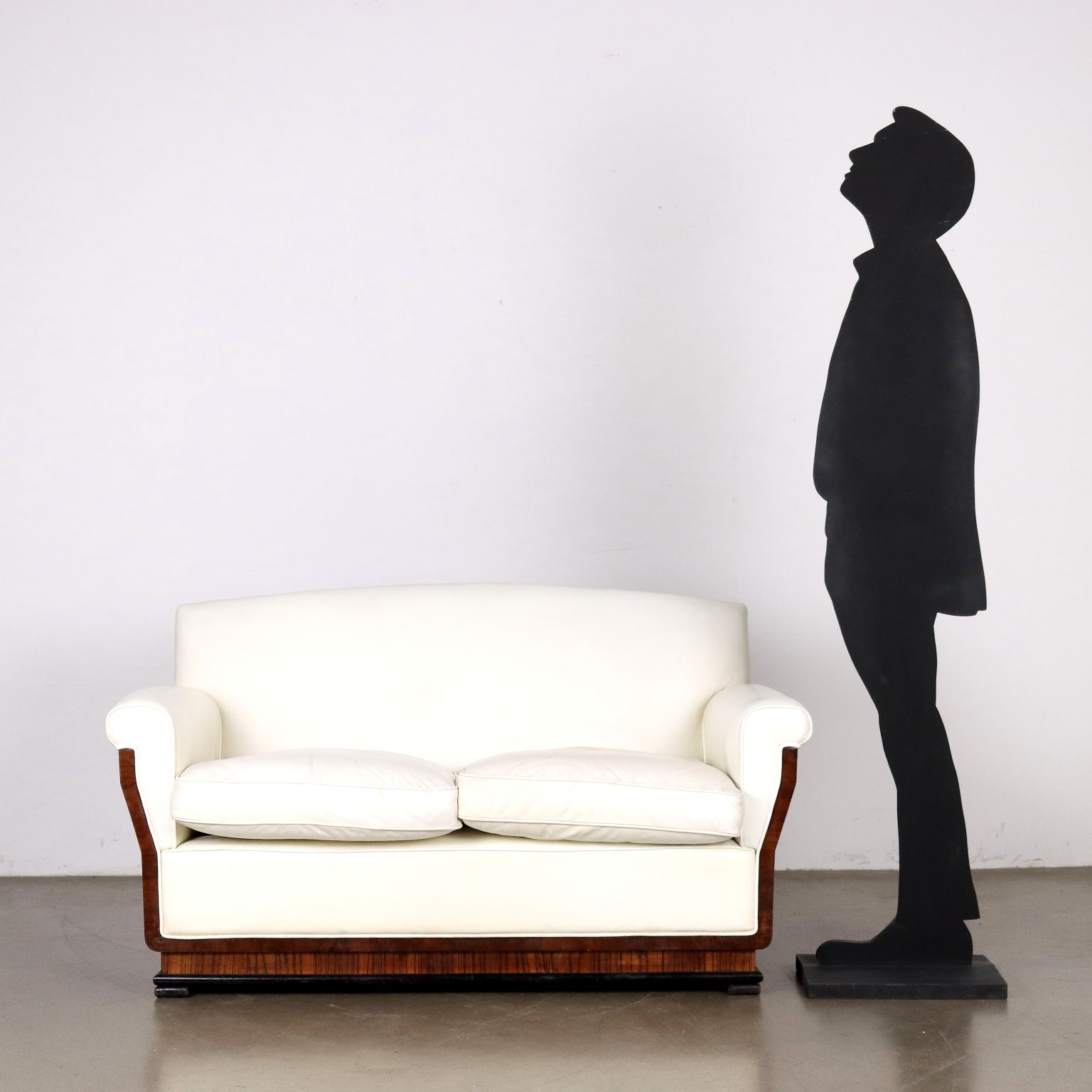 Divano con elegante struttura in legno impiallacciato radica, imbottitura in espanso e rivestimento in pelle, non originali del periodo.