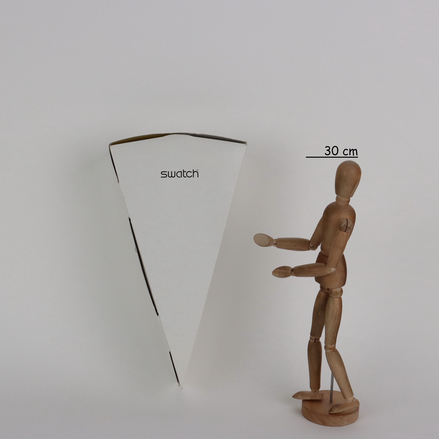 Cofanetto in polistirolo a forma di fetta di groviera contenente orologio.