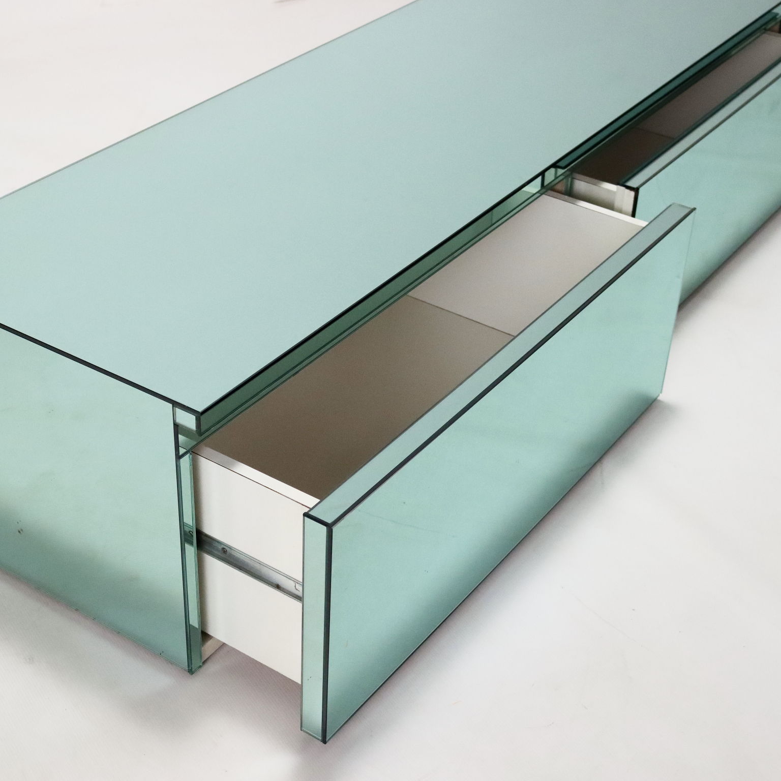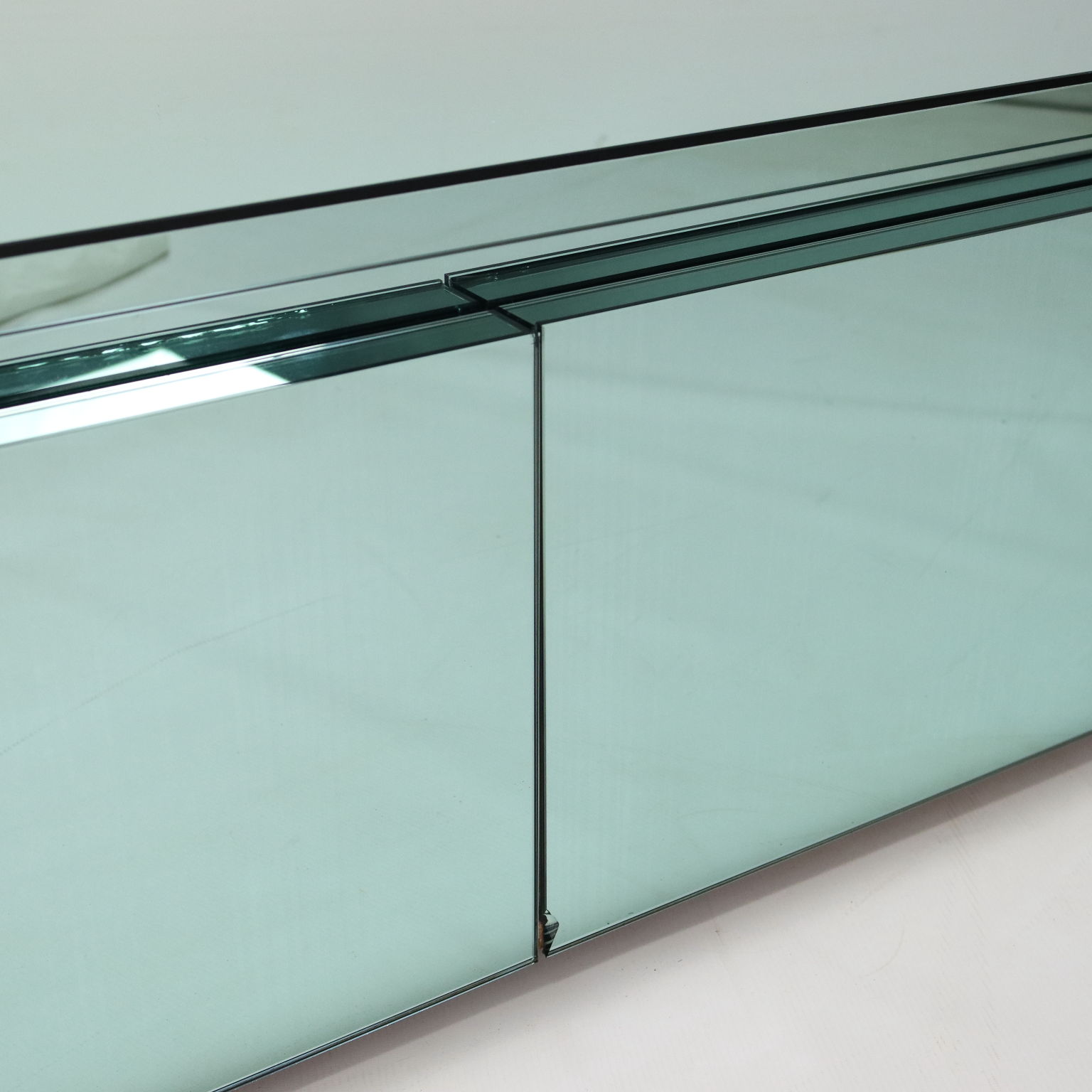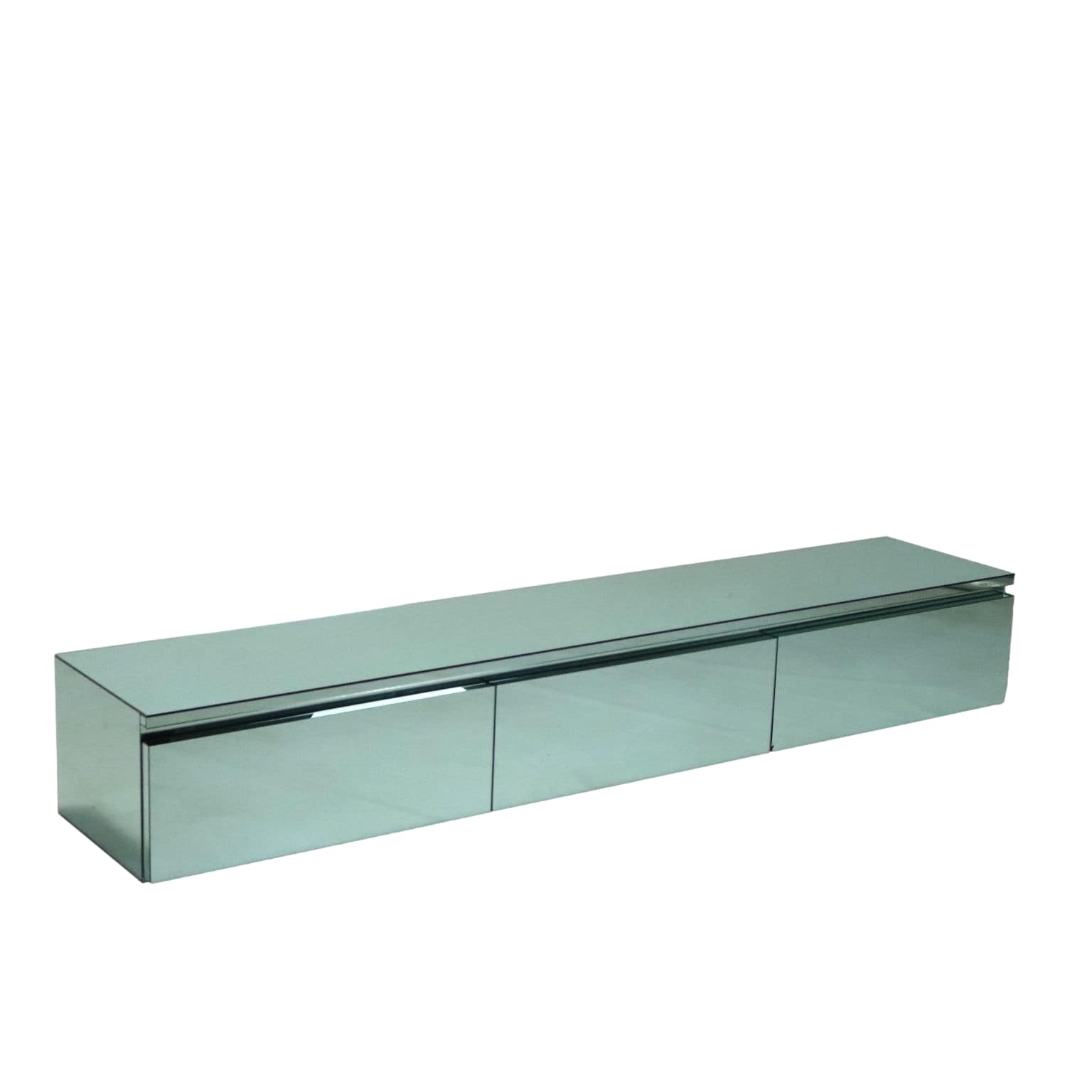 Mobile da soggiorno vintage con struttura in legno e finitura in vetro specchiato color verde acqua. Di dimensioni generose, presenta tre cassetti frontali di cui uno con una piccola sbeccatura visibile in foto. In buone condizioni generali.