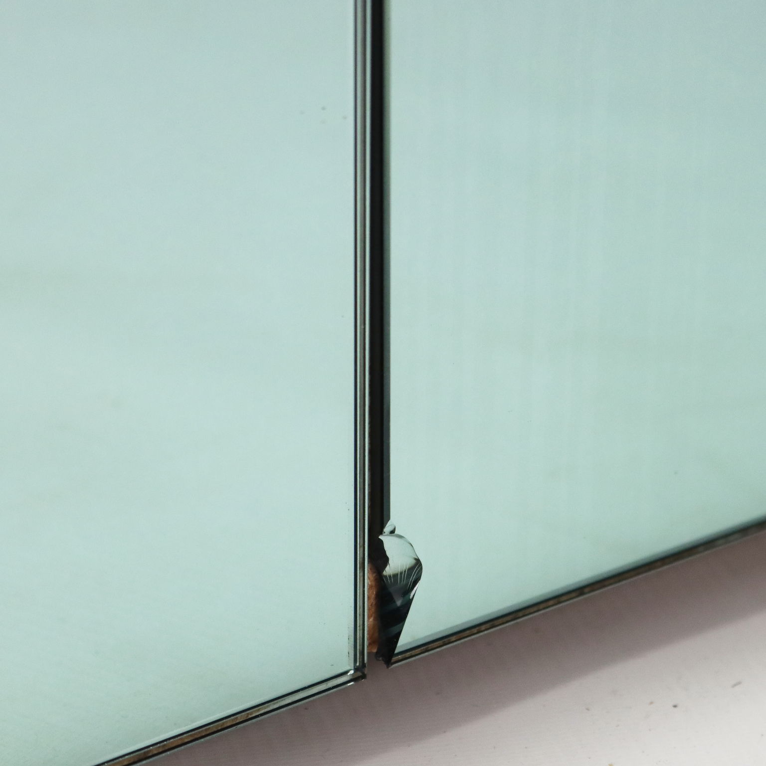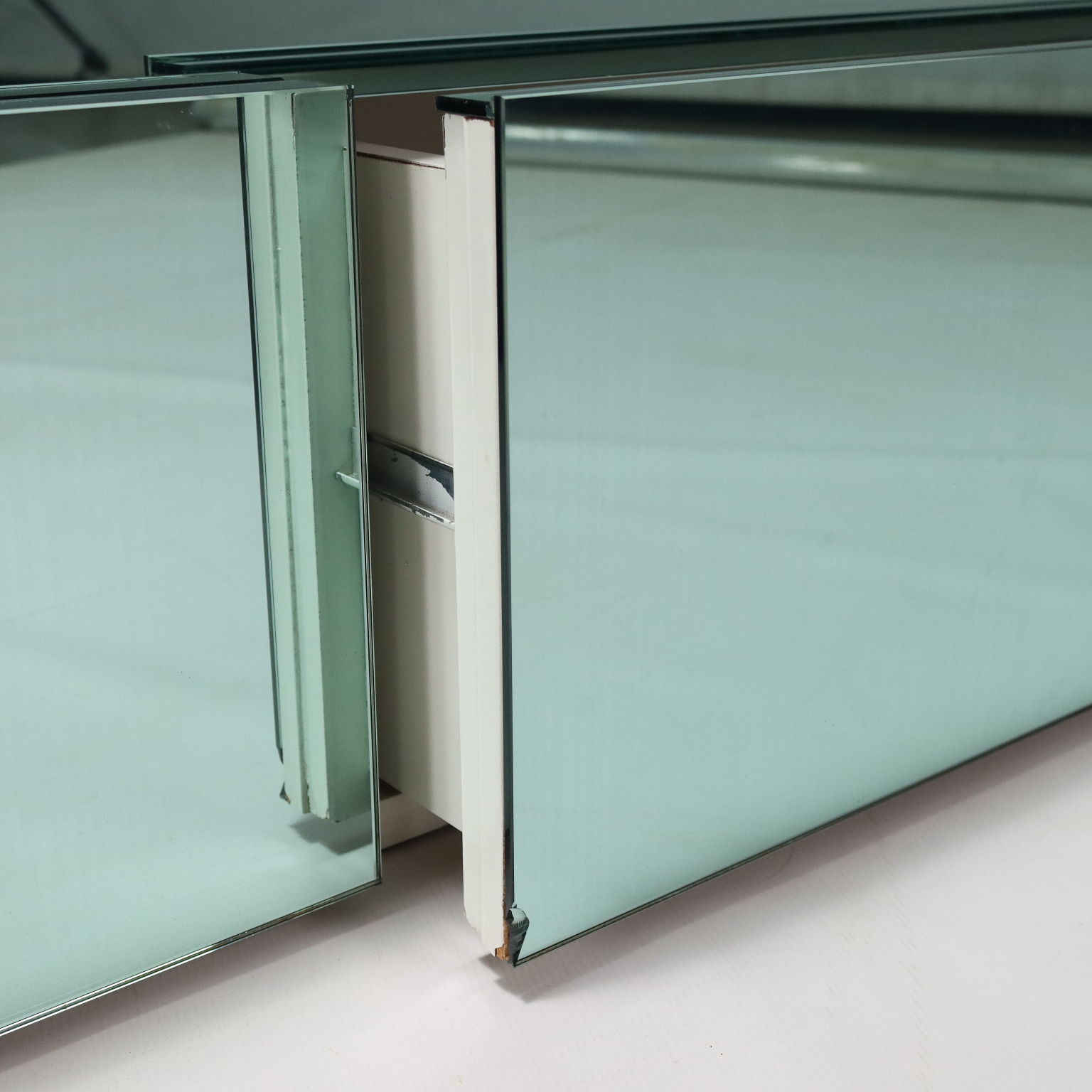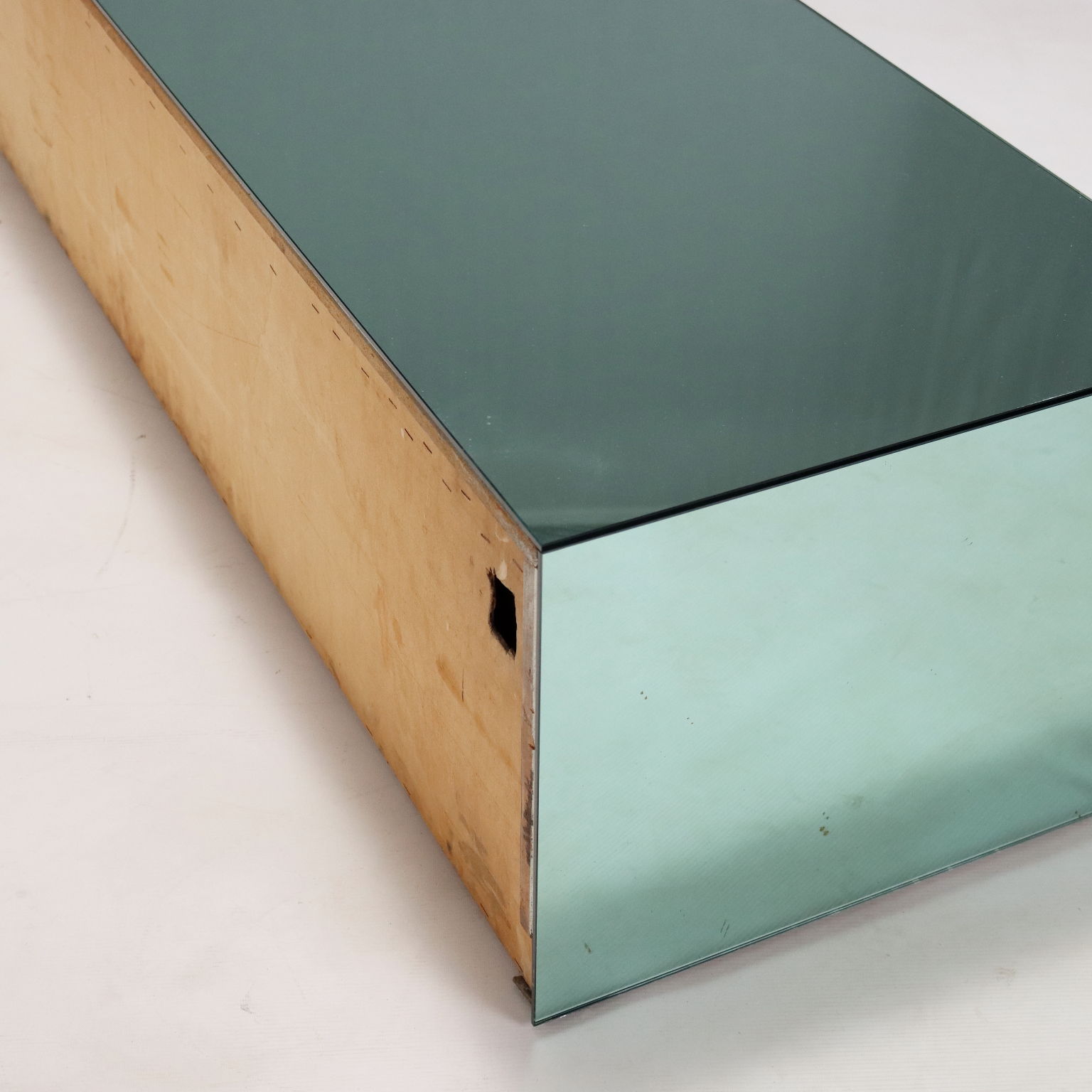 Mobile da soggiorno vintage con struttura in legno e finitura in vetro specchiato color verde acqua. Di dimensioni generose, presenta tre cassetti frontali di cui uno con una piccola sbeccatura visibile in foto. In buone condizioni generali.