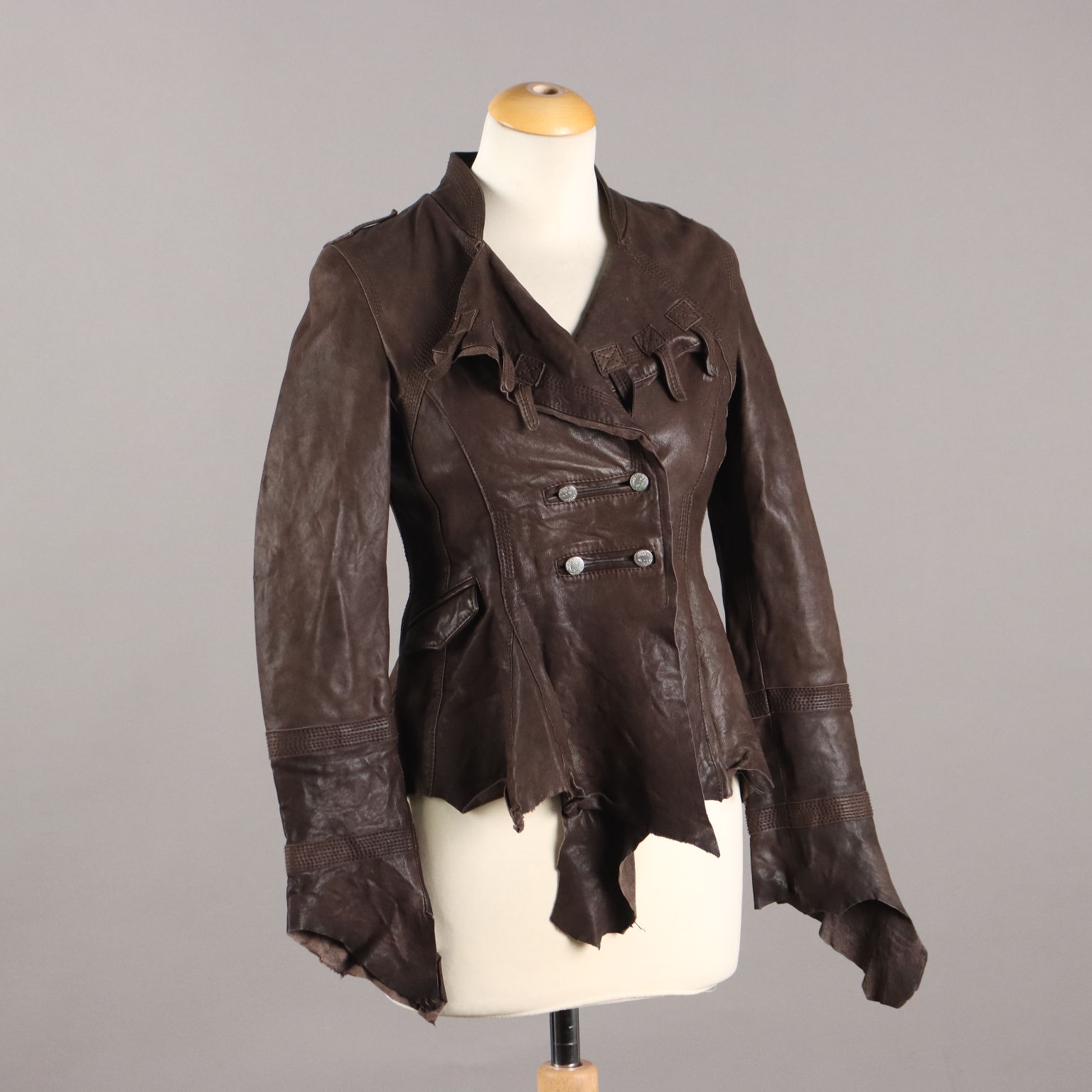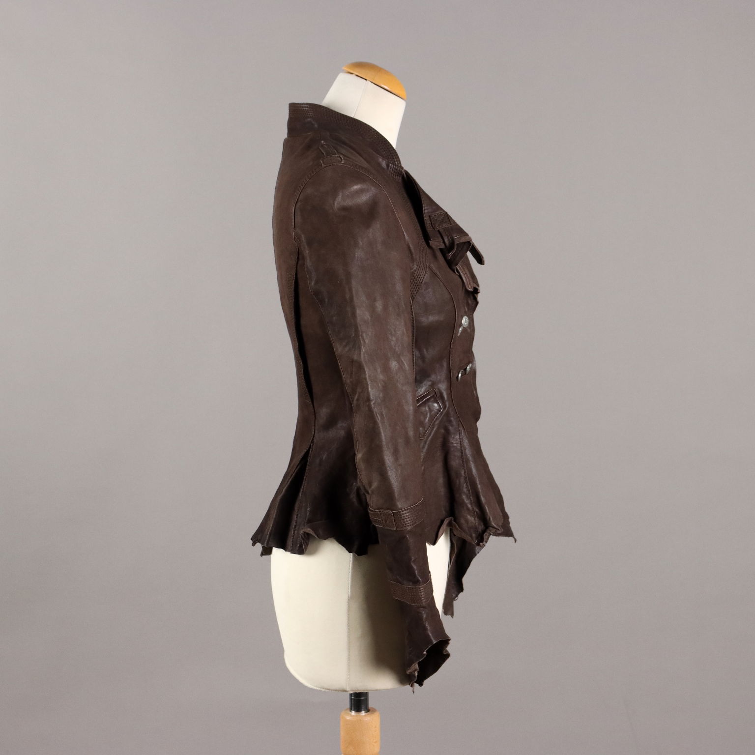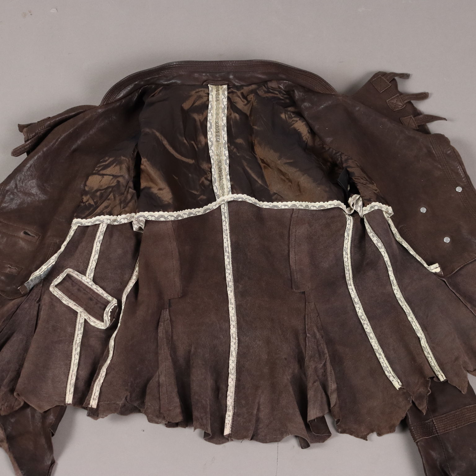 Giacca in vera pelle marrone, marchiata Sonia Villa. Modello molto originale e studiato nei minimi dettagli. Abbottonatura doppiopetto, revers con laccetti applicati, cuciture decorative e fondo irregolare a taglio vivo.