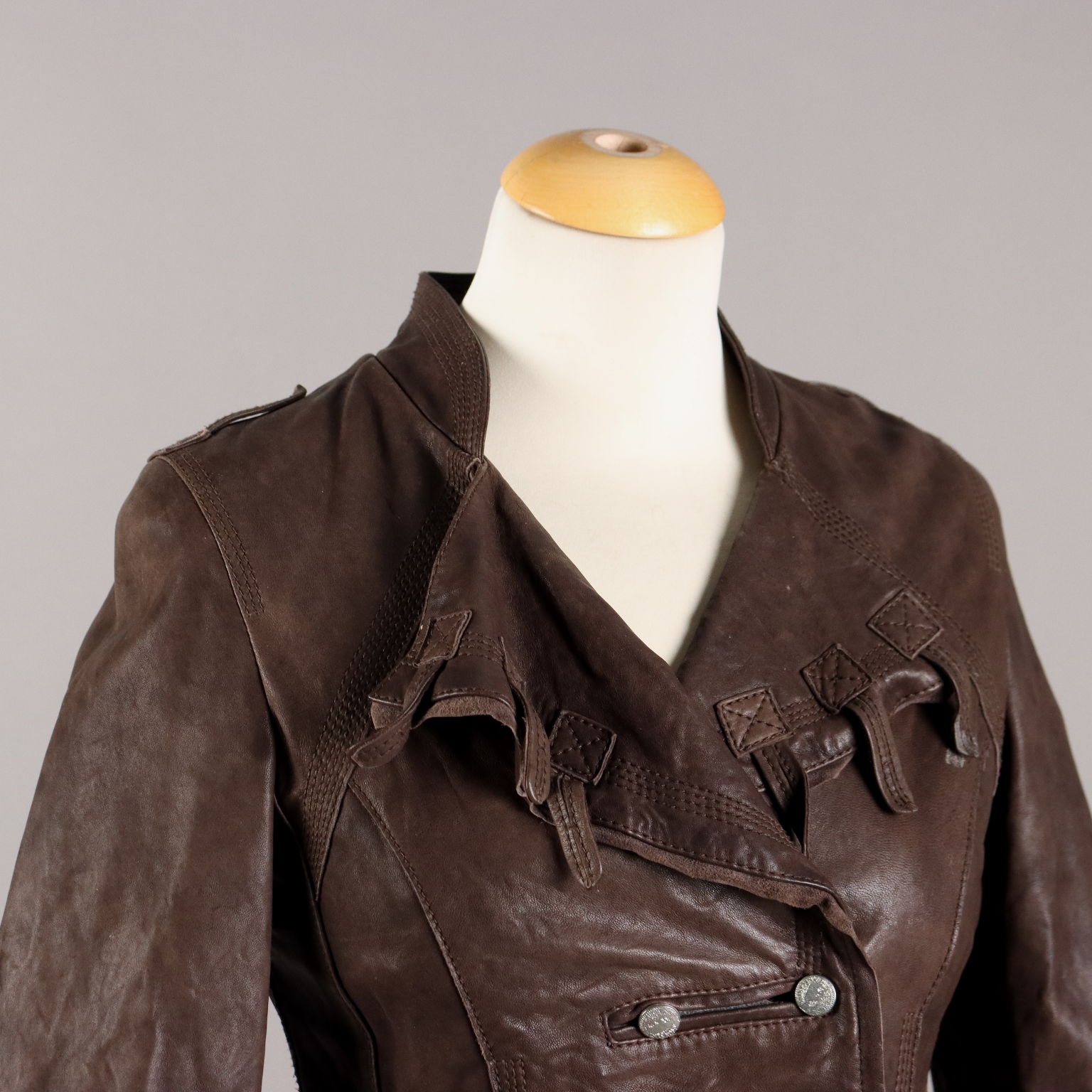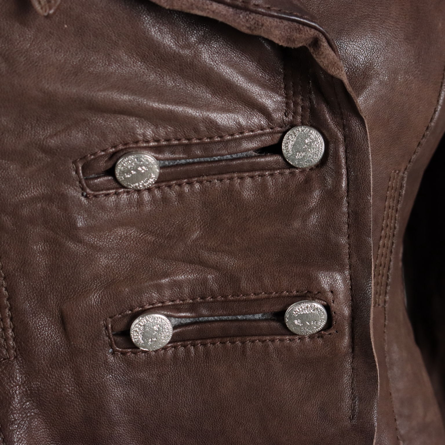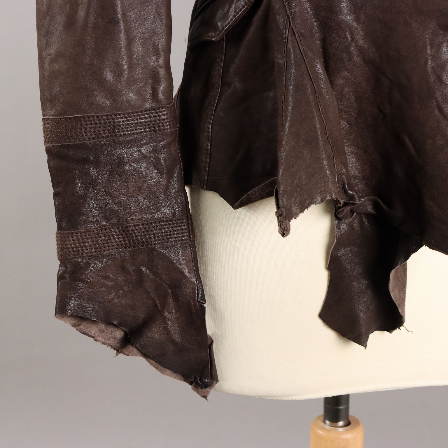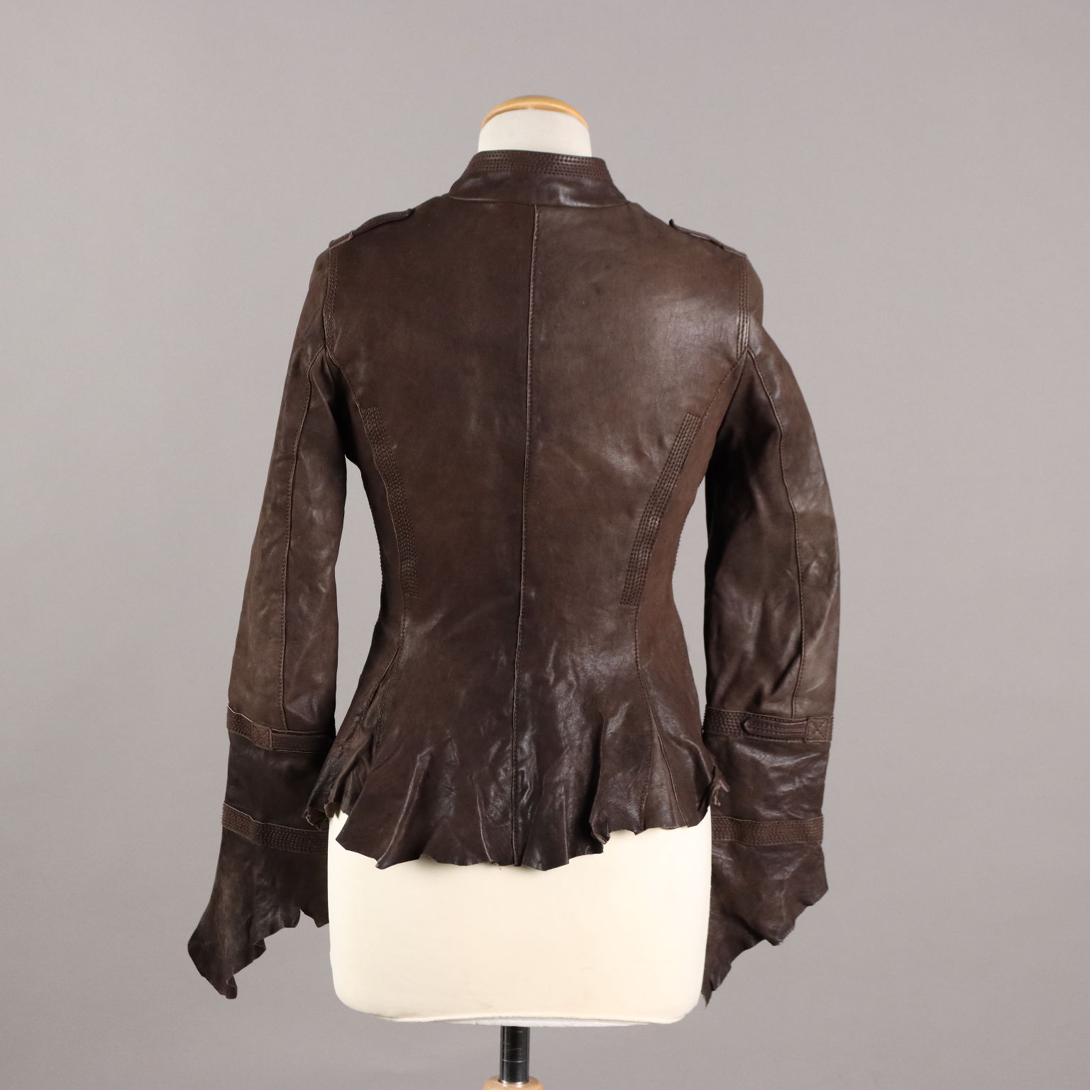 Giacca in vera pelle marrone, marchiata Sonia Villa. Modello molto originale e studiato nei minimi dettagli. Abbottonatura doppiopetto, revers con laccetti applicati, cuciture decorative e fondo irregolare a taglio vivo.