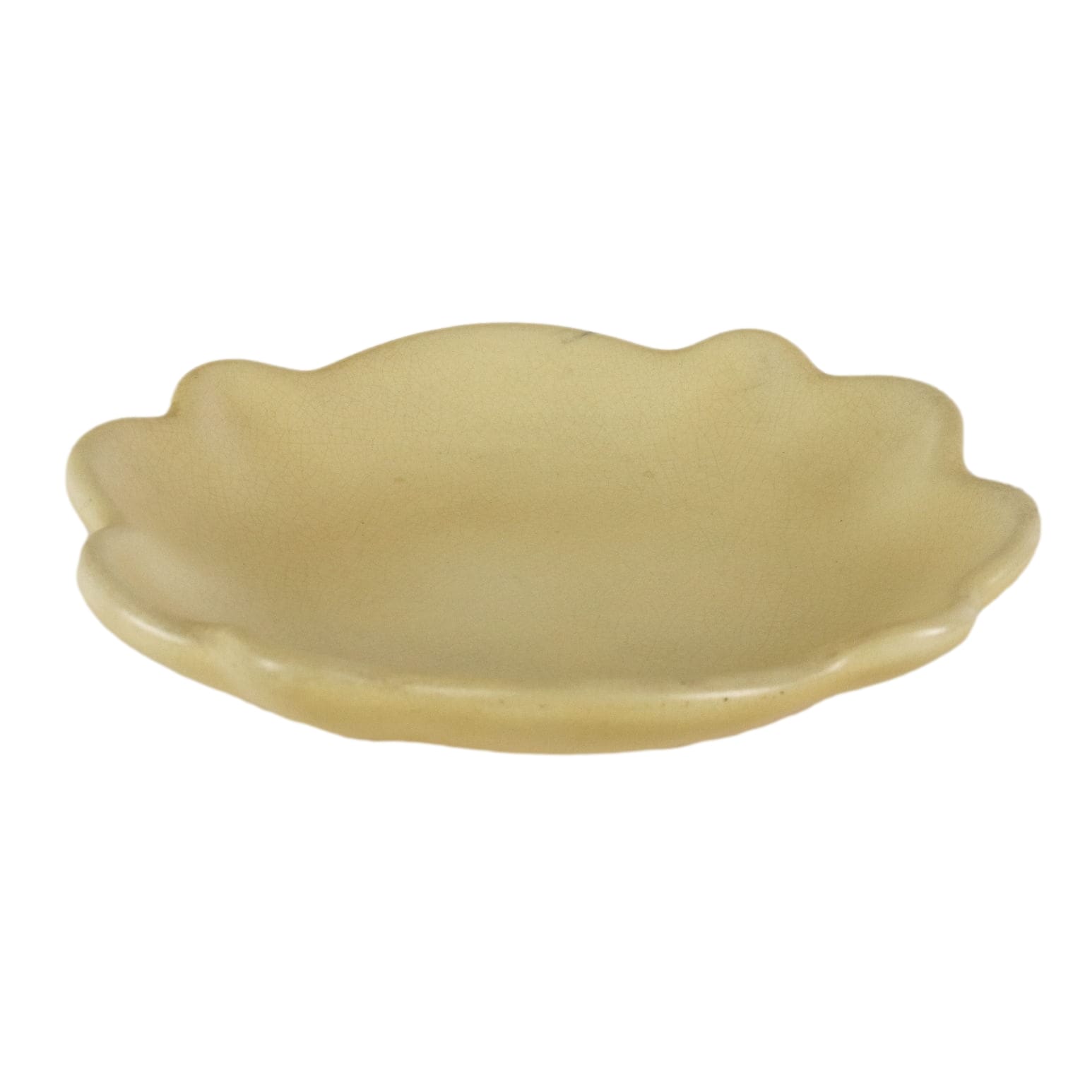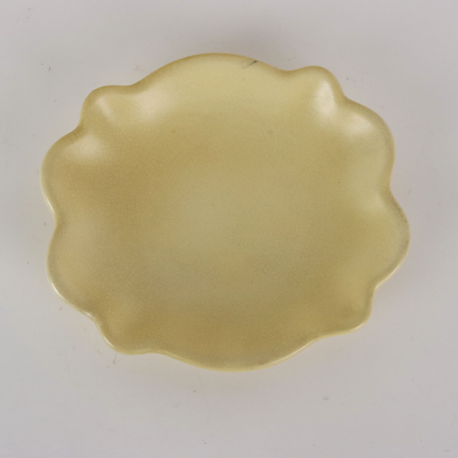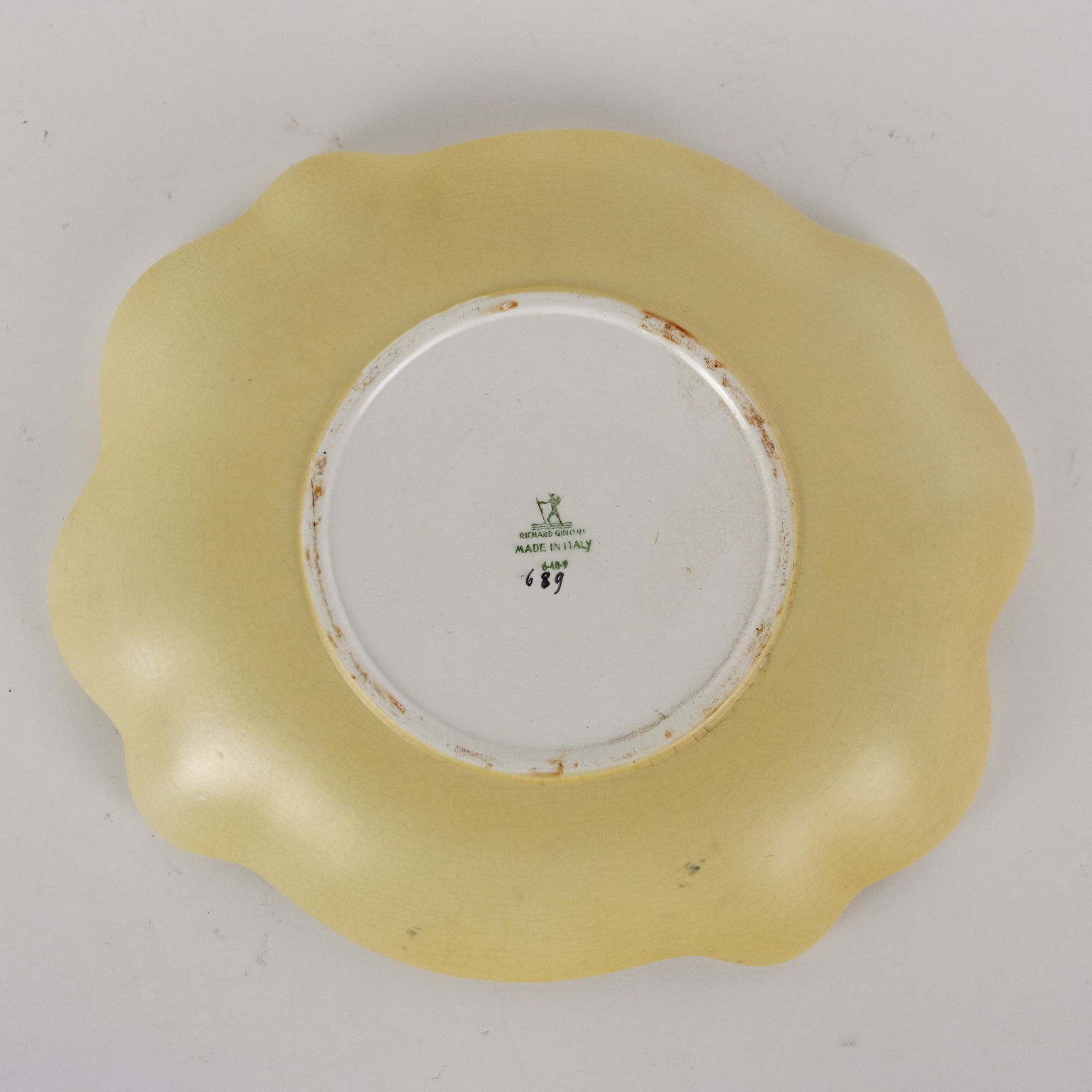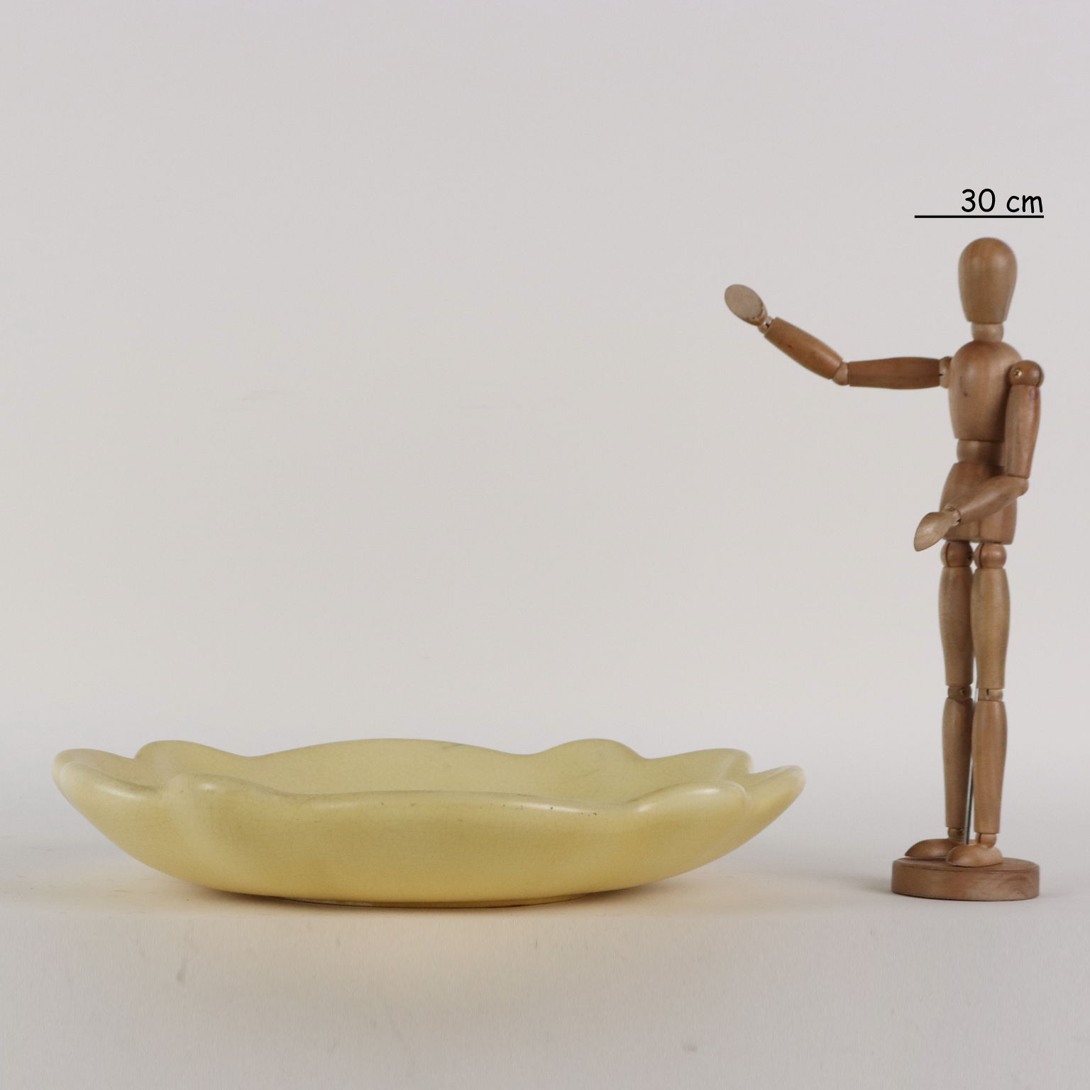 Centrotavola in ceramica smaltata color giallo a bordo lobato. Sotto la base marchio della manifattura.