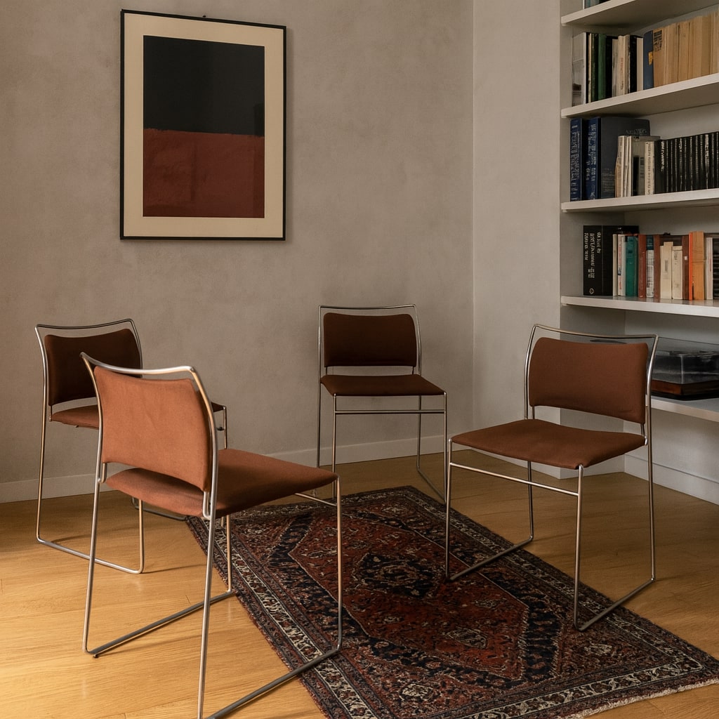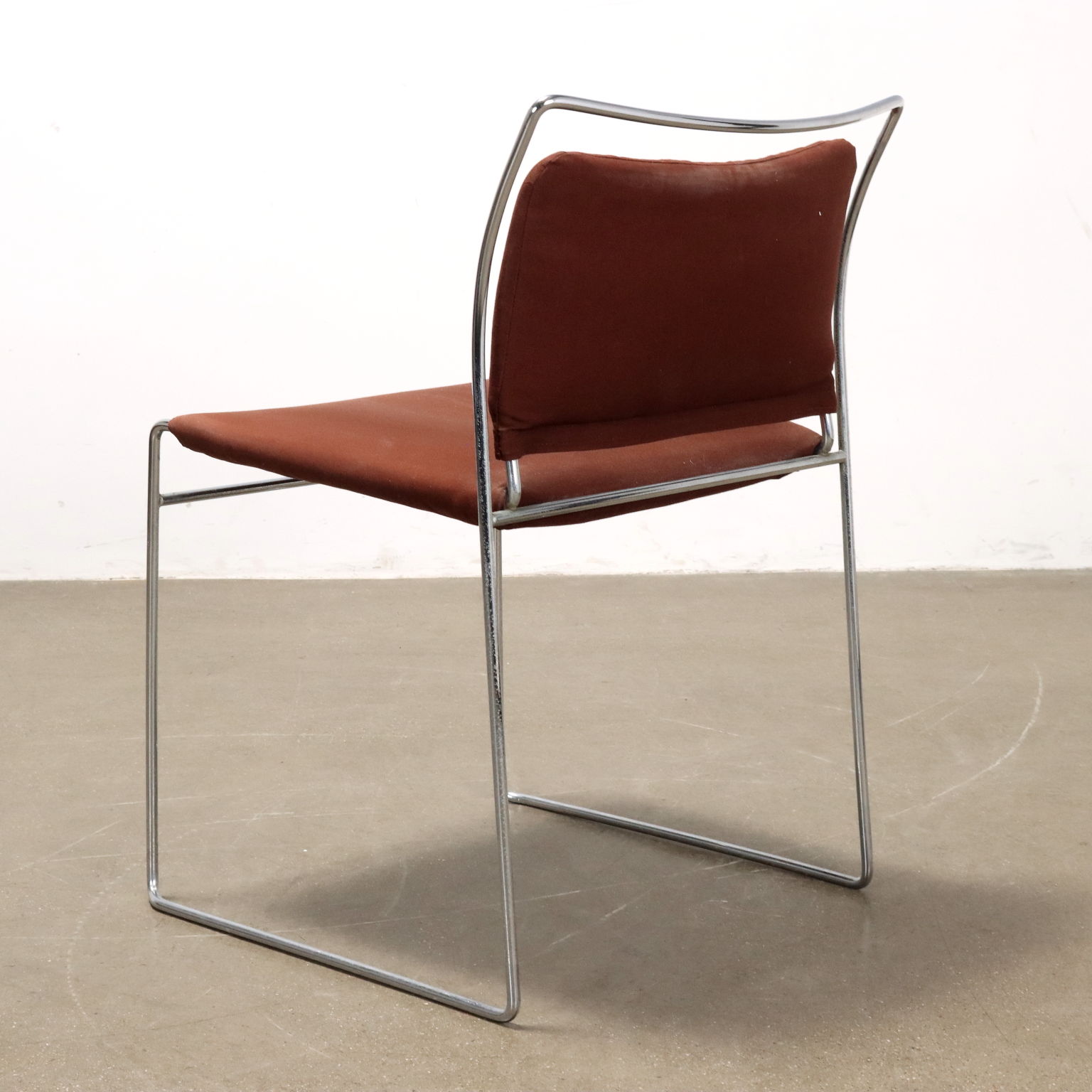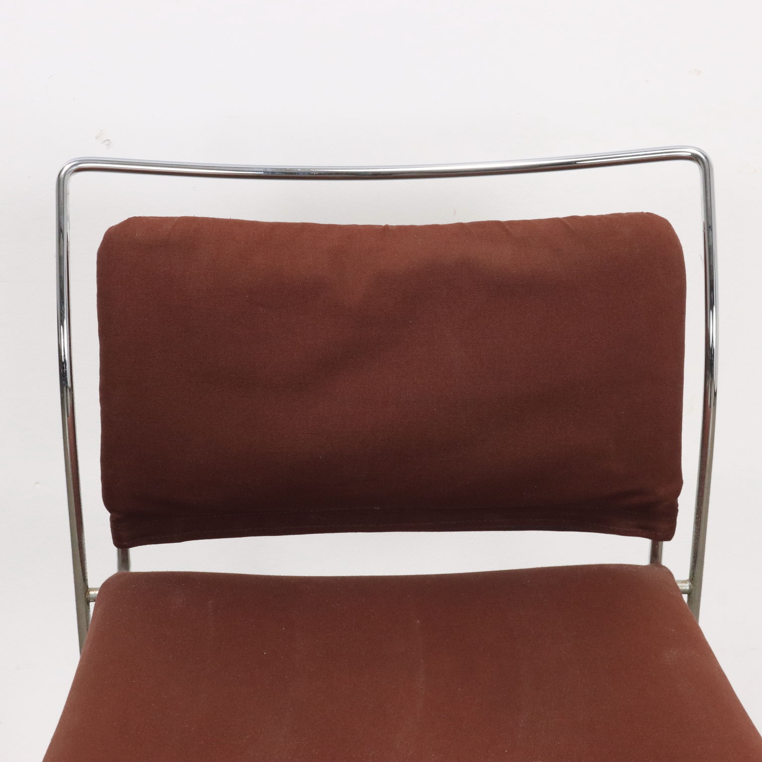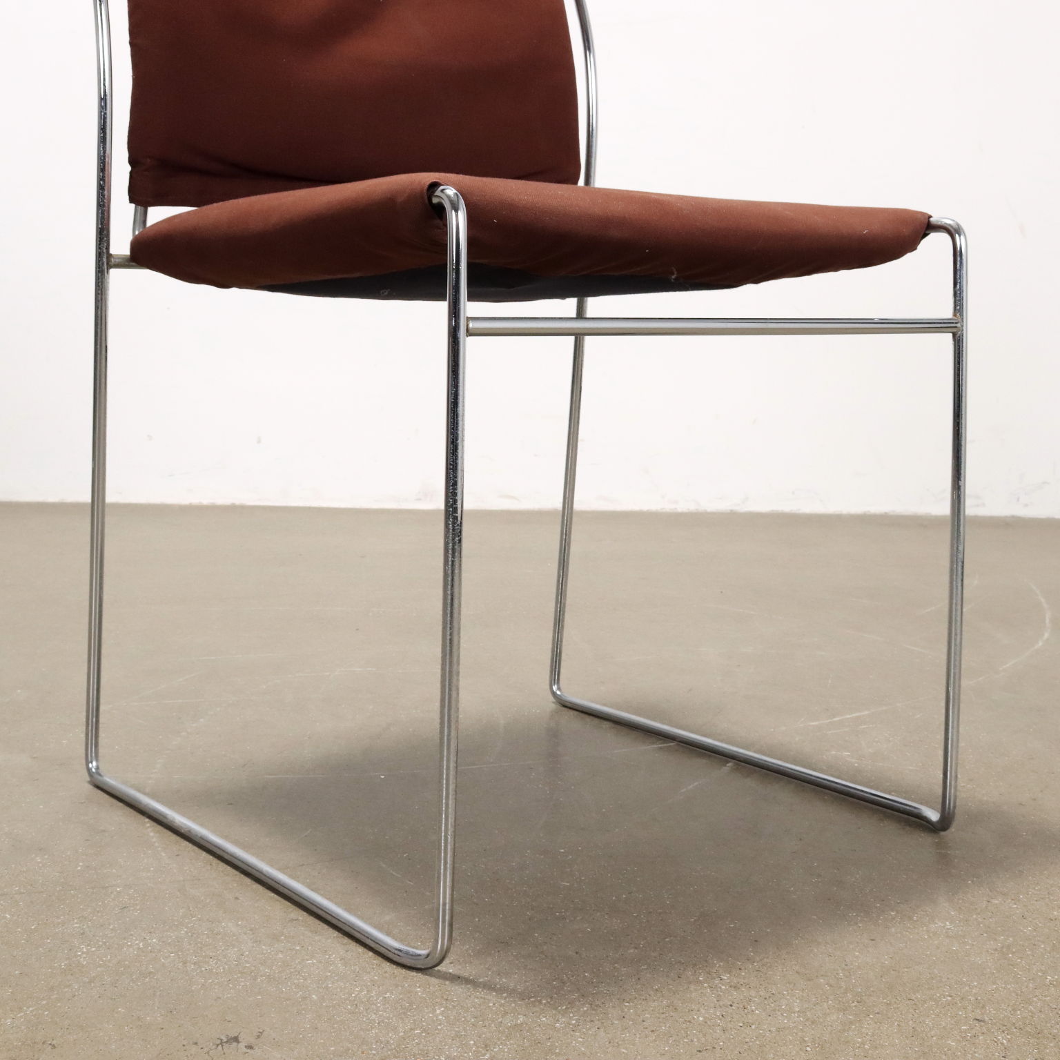 Set di sedie da pranzo con struttura in metallo cromato, seduta e schienale con imbottitura in espanso e rivestimento originale del periodo in tessuto nei toni del marrone.