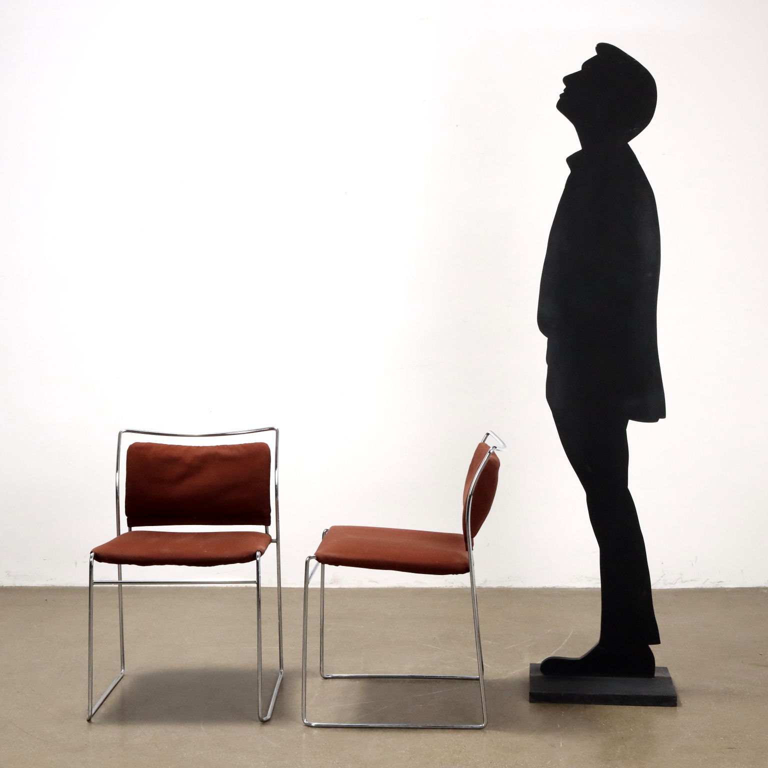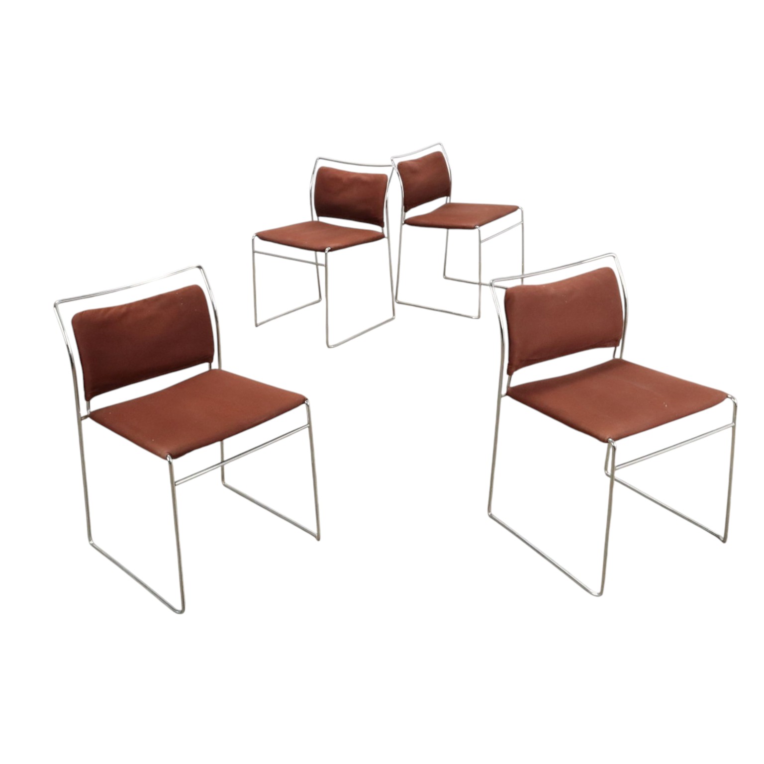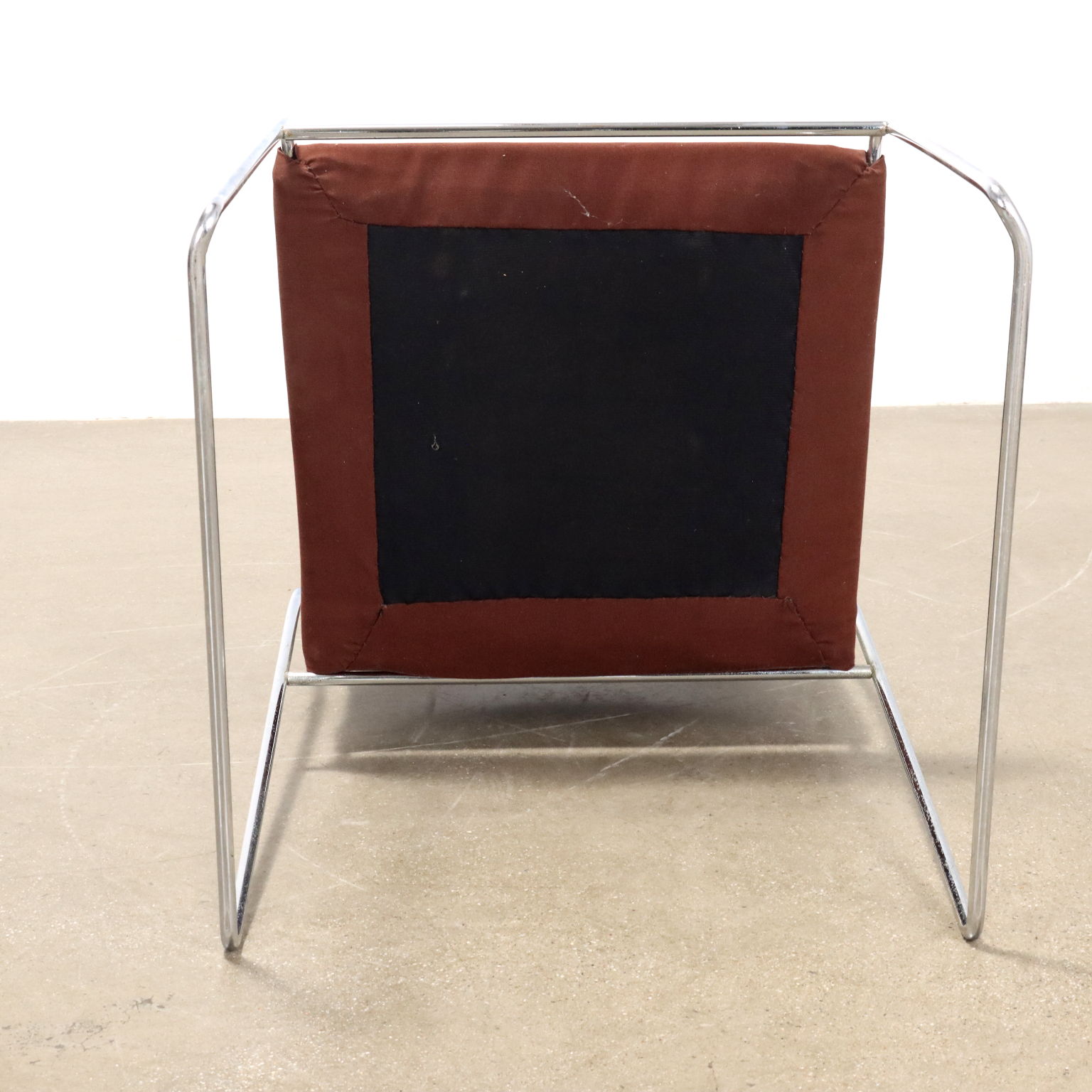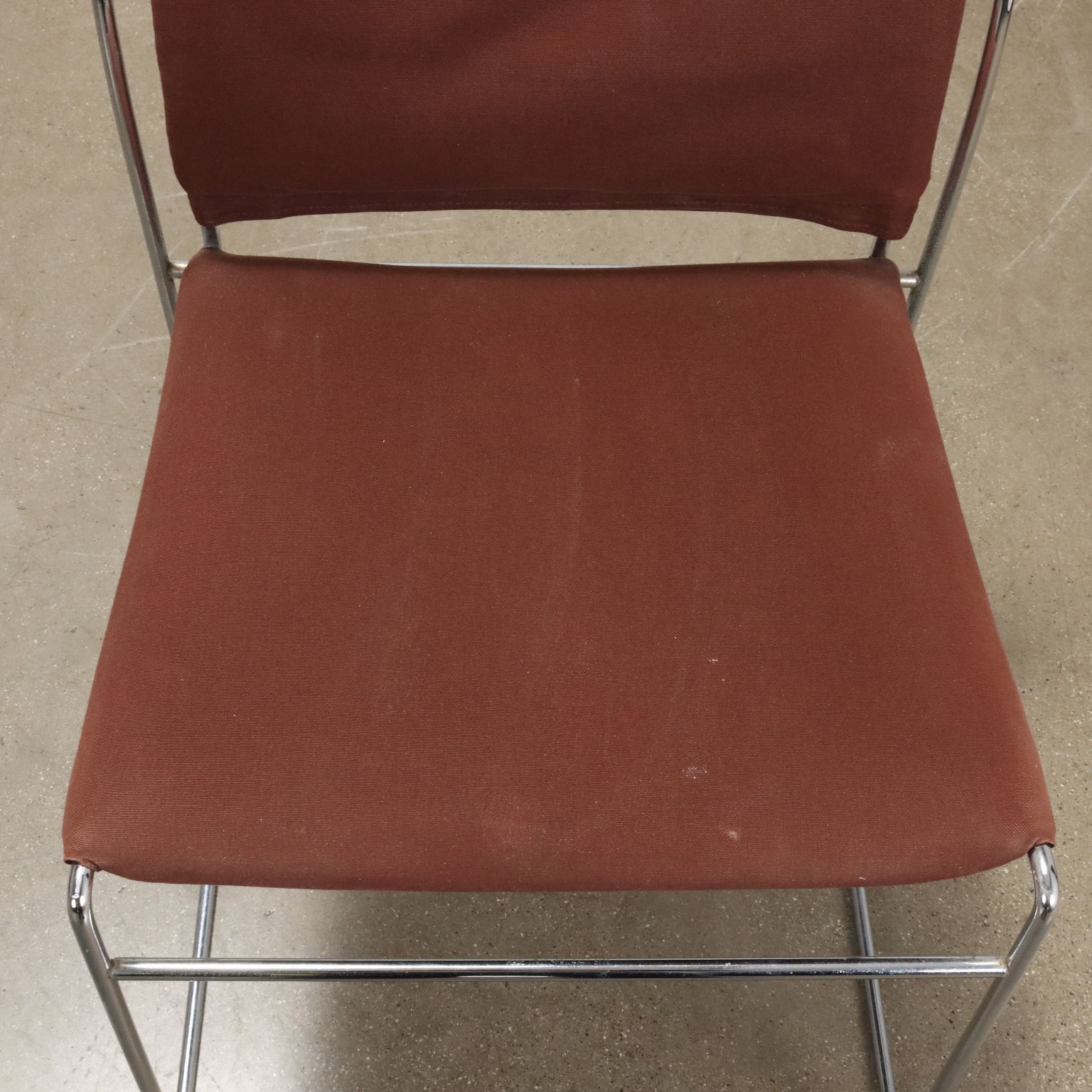 Set di sedie da pranzo con struttura in metallo cromato, seduta e schienale con imbottitura in espanso e rivestimento originale del periodo in tessuto nei toni del marrone.