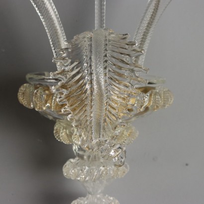 Coppia di appliques in vetro soffiato Veneziano, due luci, adornate con foglie, fiore e pendente. Murano, XX Secolo.