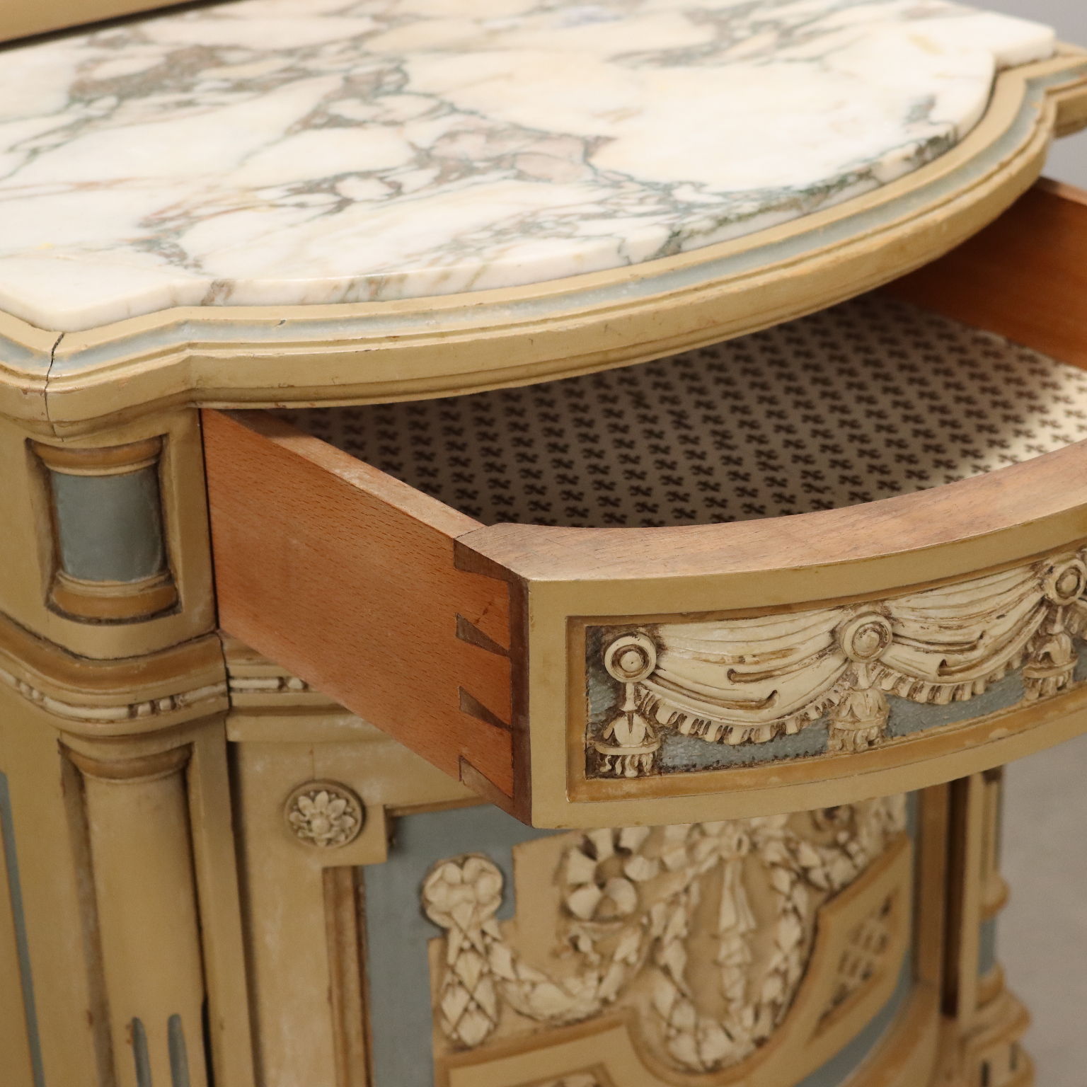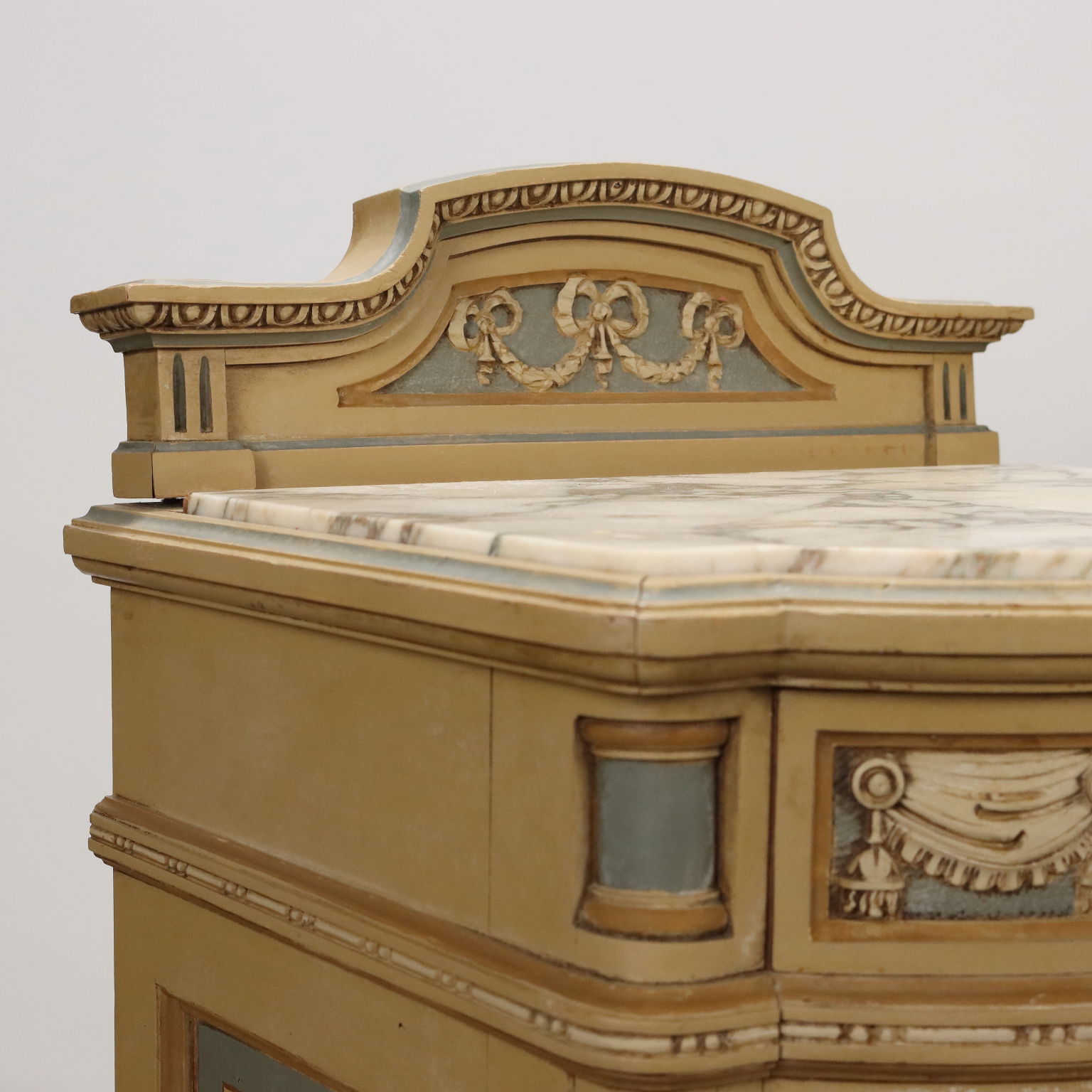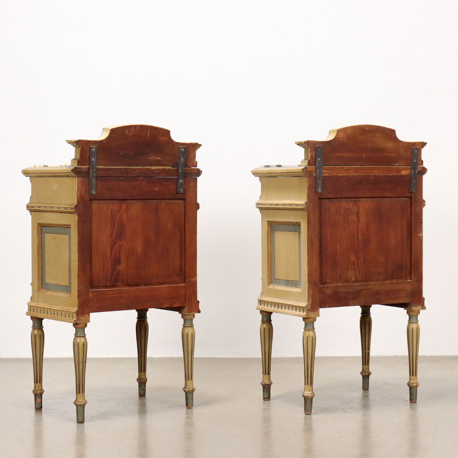 Coppia di comodini in stile neoclassico piemontese, gambe tronco coniche sgorbiate reggono i mobiletti, curvi sul fronte con un'anta trattenuta da lesene a semi colonna e cassetto sotto piano, sul piano in marmo poggia una piccola alzatina; tutta la superficie è intagliata con fiori, festoni, tendaggi e nastri secondo il gusto dell'epoca e laccata nei toni dell'ocra e azzurro.