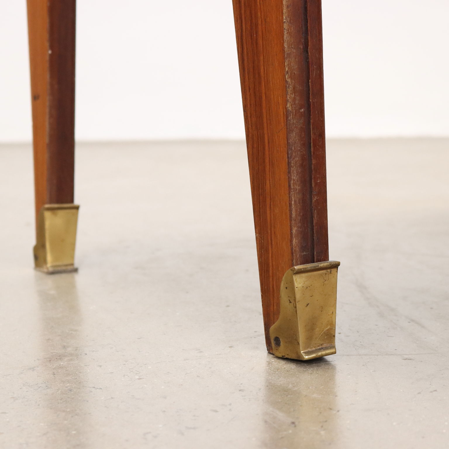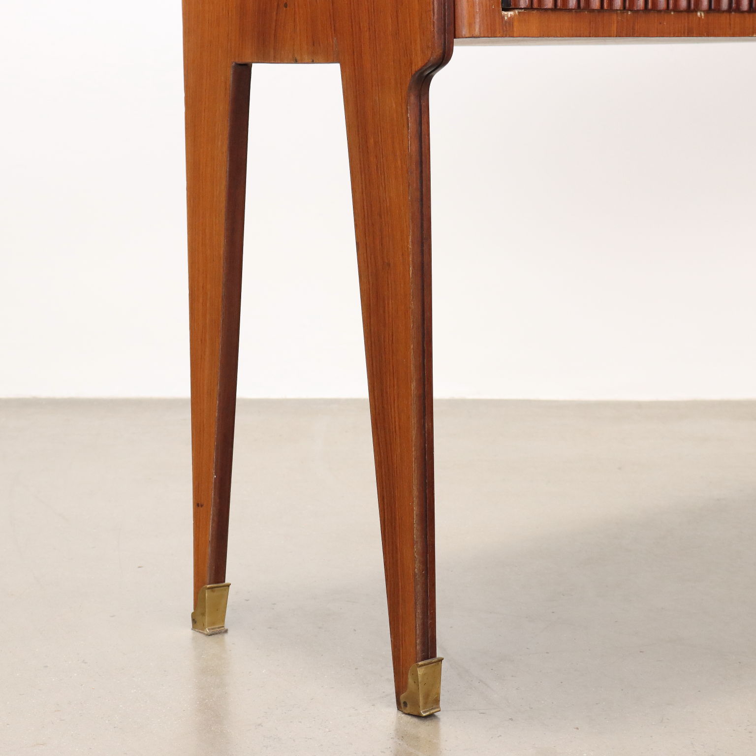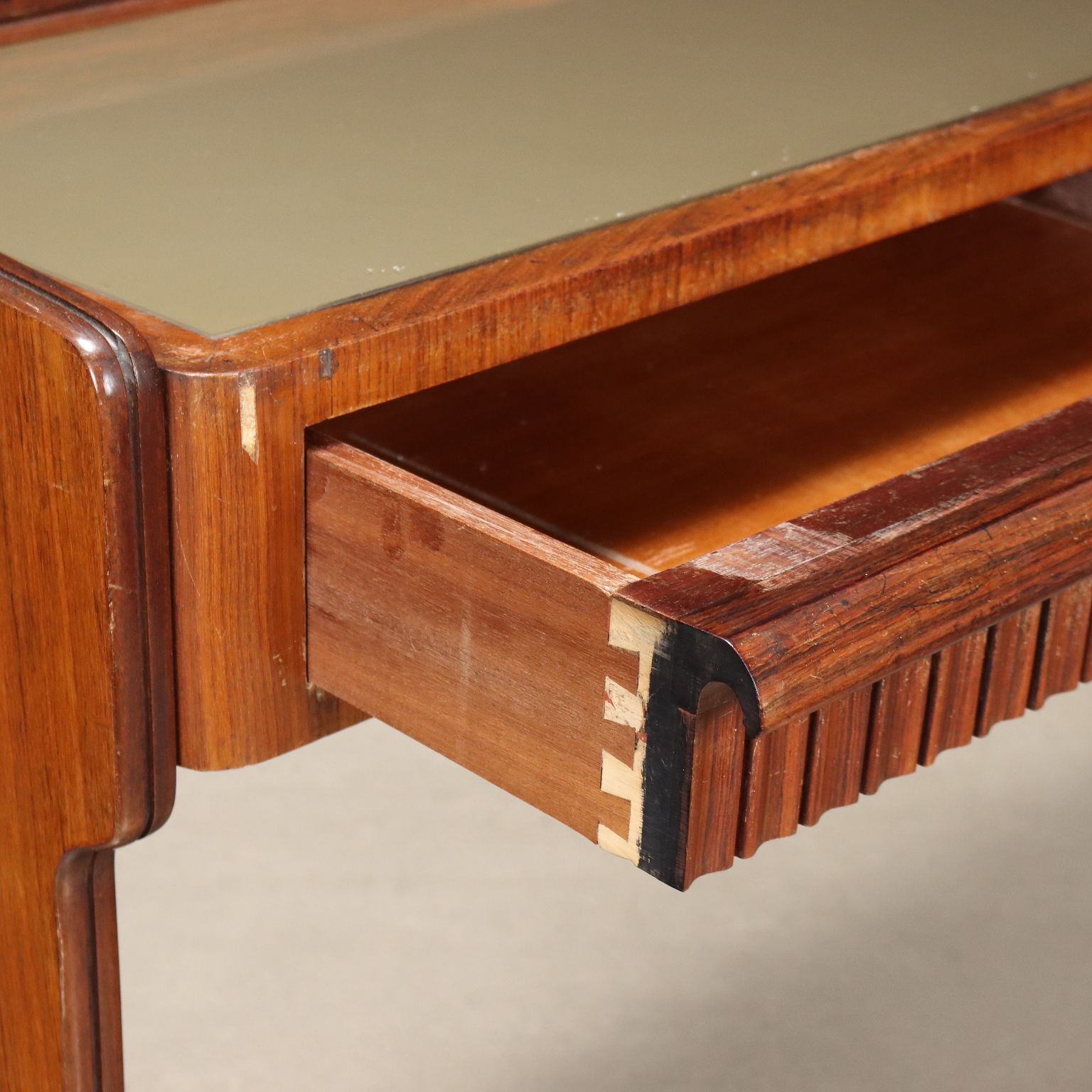 Consolle da parete in legno con piano in vetro retro trattato nei toni dell'ocra, due cassetti sotto piano con fronte grissinato, puntali in ottone. In legno impiallacciato legno esotico e legno tinto.