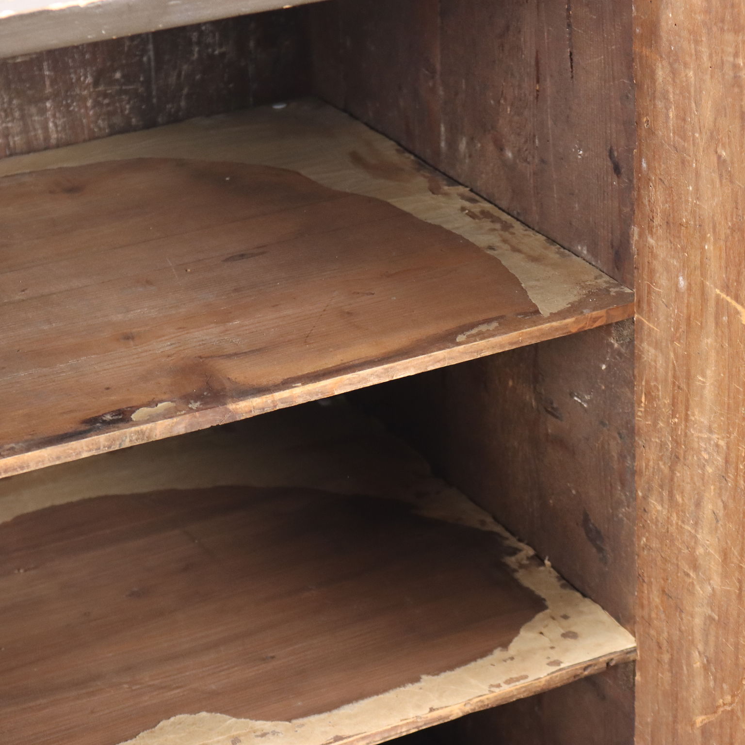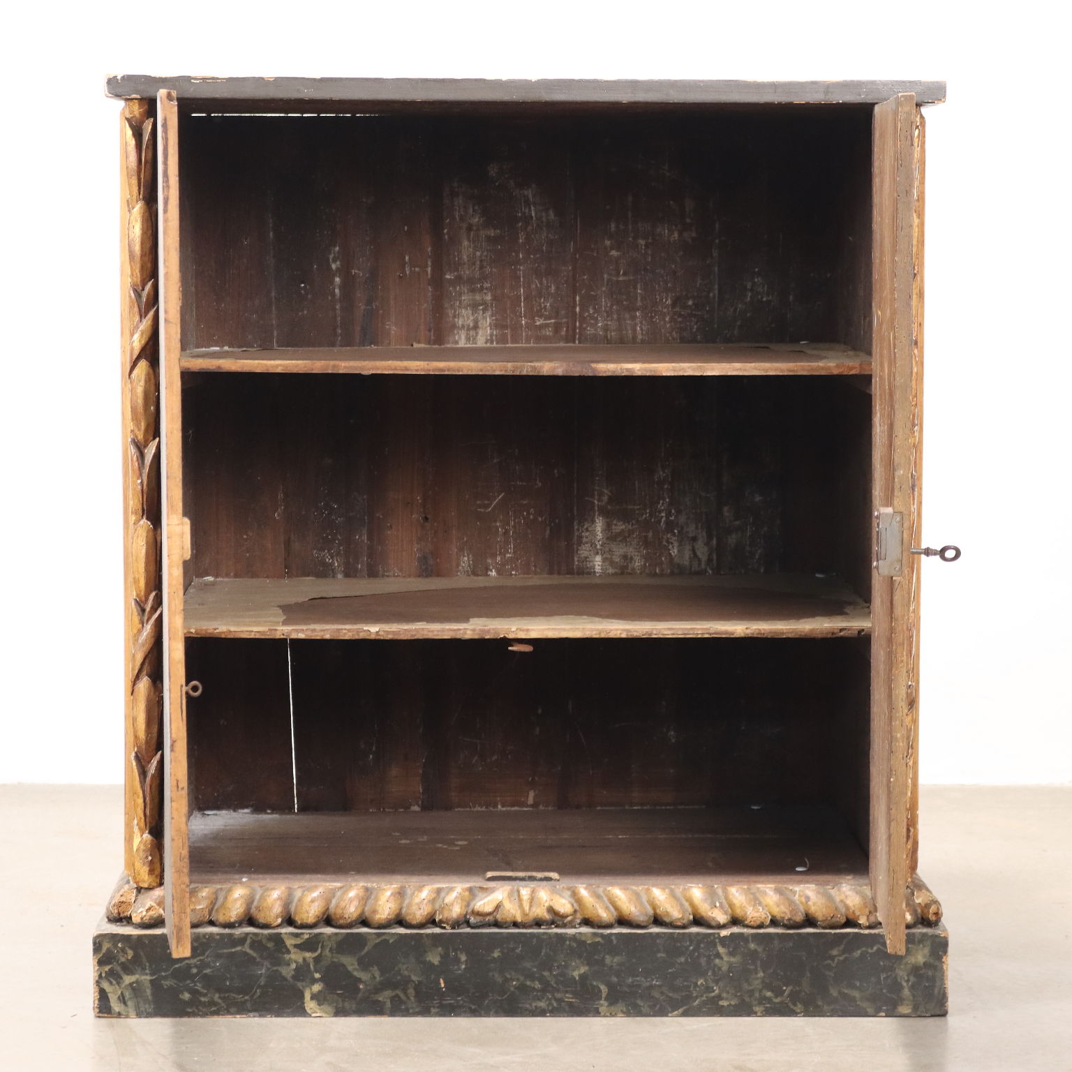 Mobile realizzato con parti antiche, le due ante della credenza sono realizzate a partire da un dipinto su tavola dei primi dell'800, molto probabilmente una Crocifissione da cui sono stati tolti la Madonna ed il San Giovanni evangelista ai piedi della croce, e usati indipendentemente per realizzare questo mobile della metà dell'800. La cornice dorata che decora il fronte e incornicia i dipinti è barocca, sempre un recupero dall'antico, intagliata e dorata.