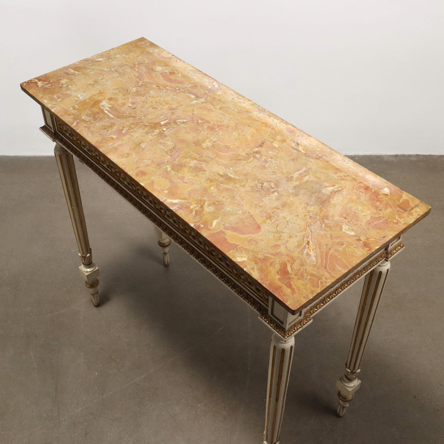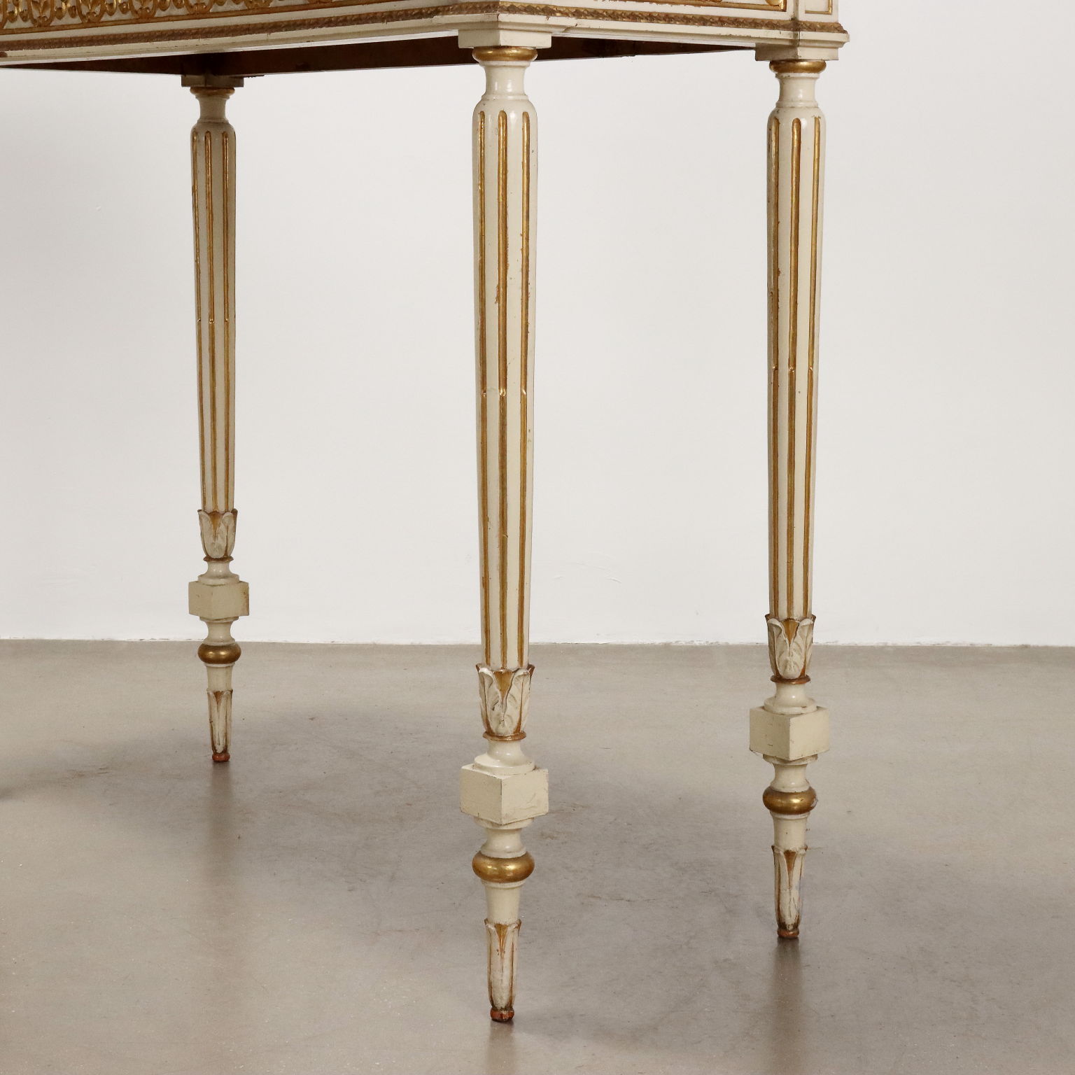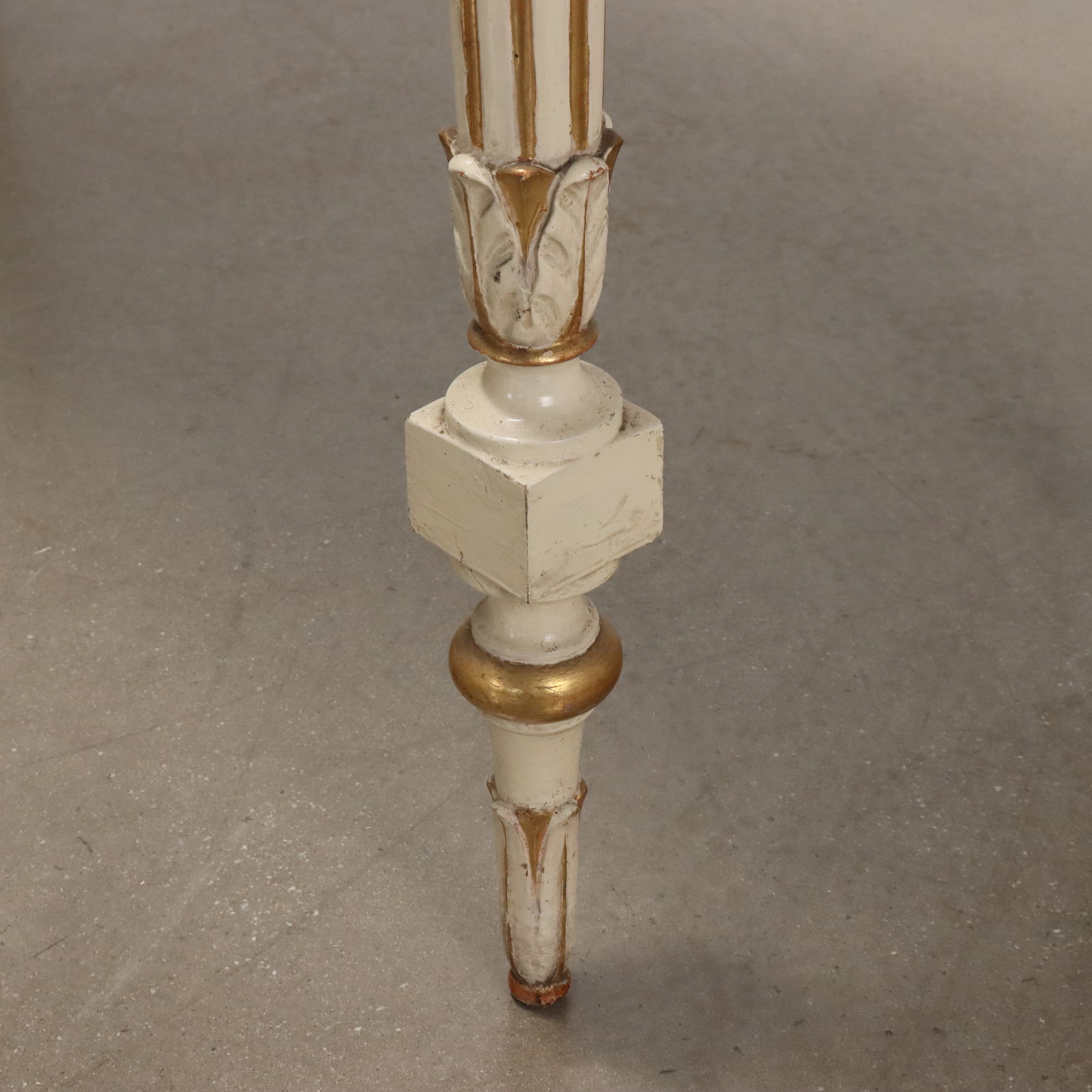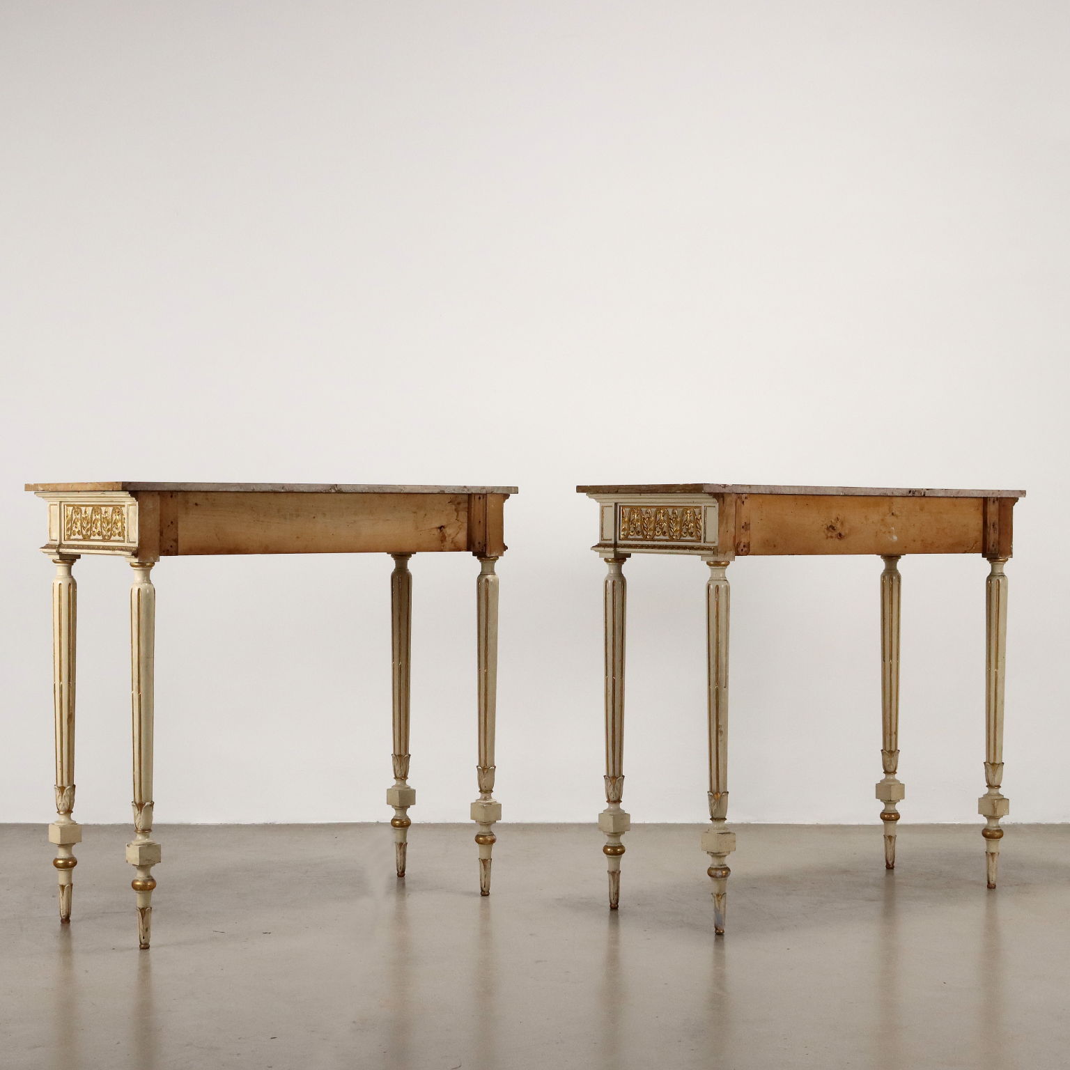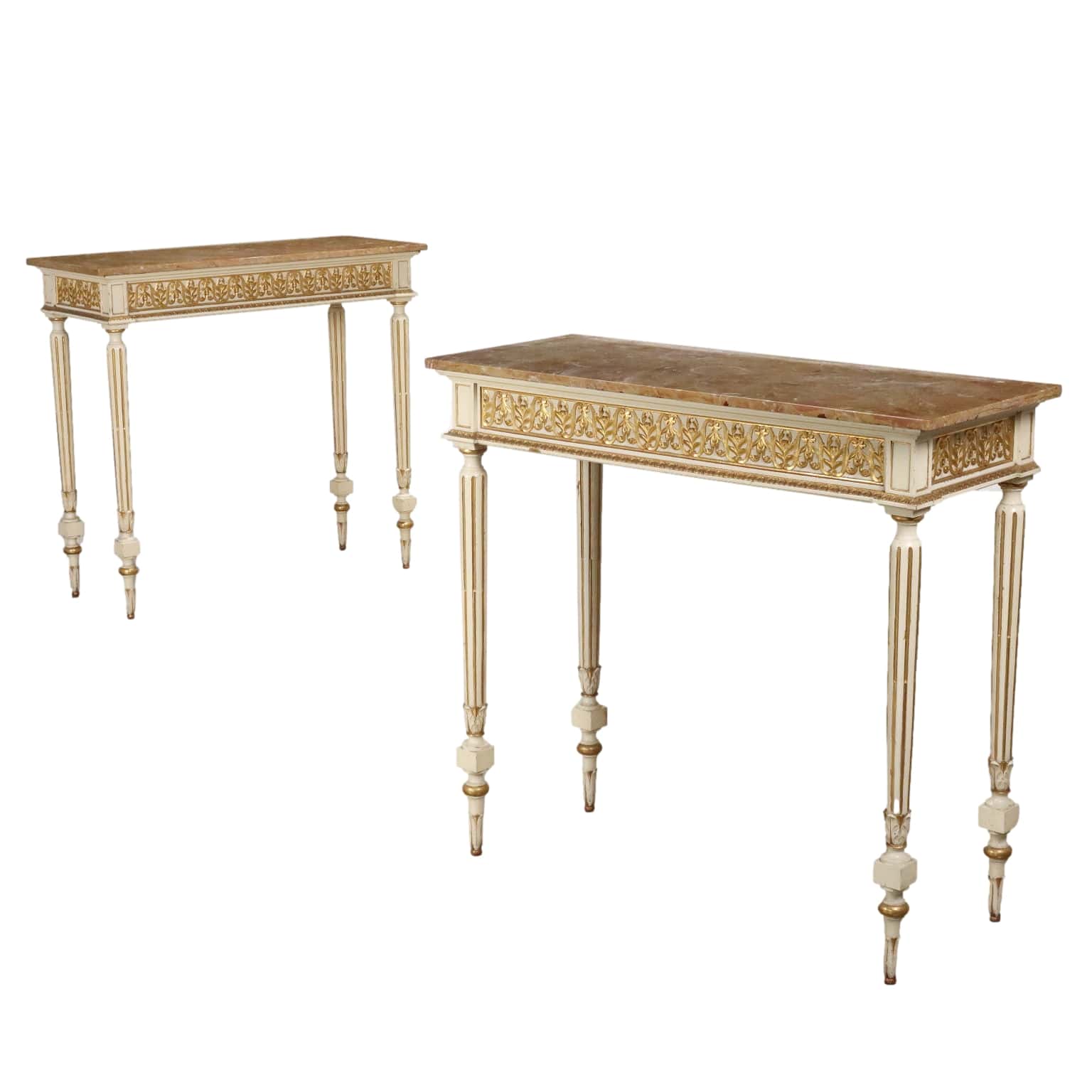 Coppia di consolle in stile neoclassico inizi '900. Quattro gambe tronco coniche tornite e intagliate reggono un piano in marmo poggiante su fascia intagliata coi tipici motivi a palmette e antemi, gli intagli sono dorati a guazzo su un fondo laccato avorio