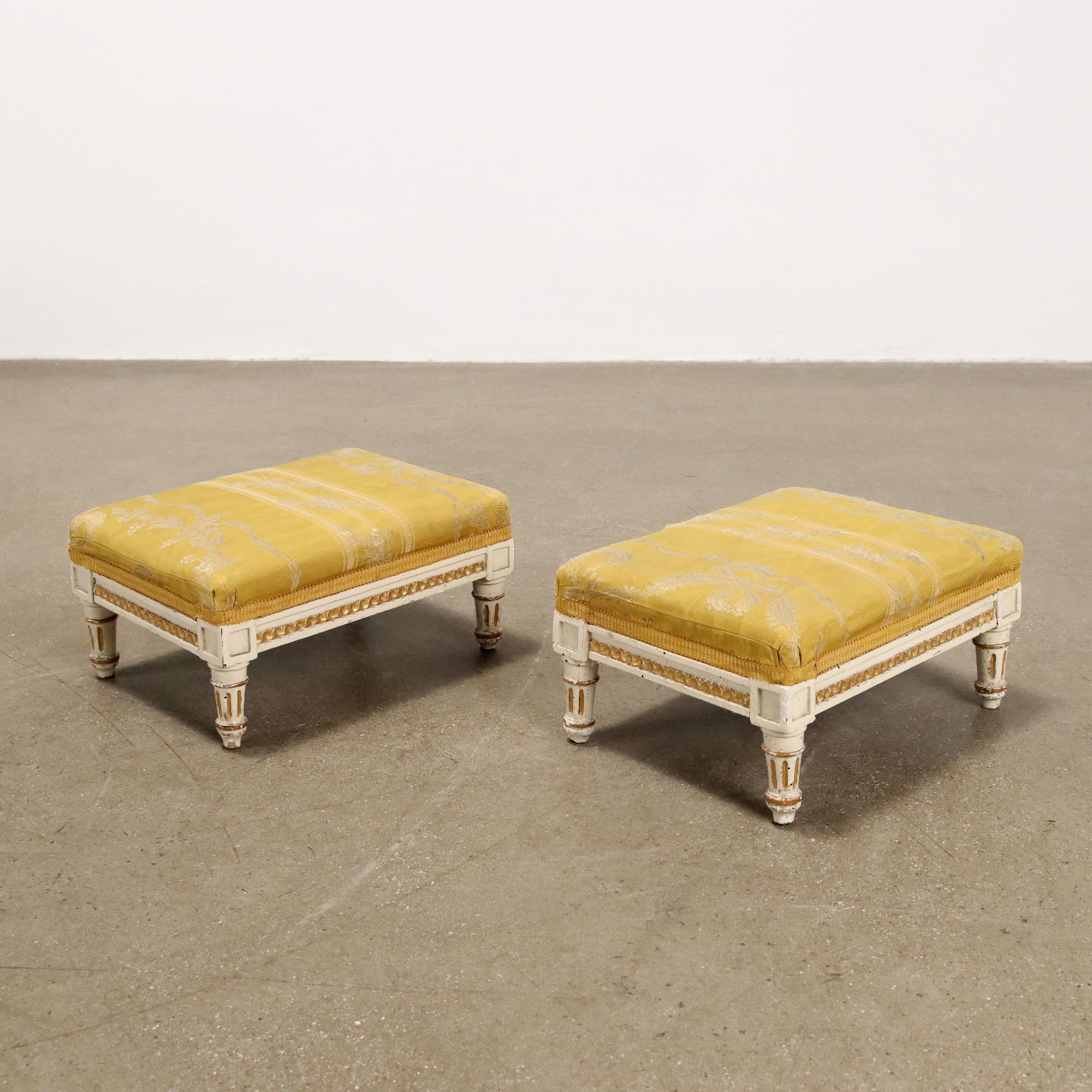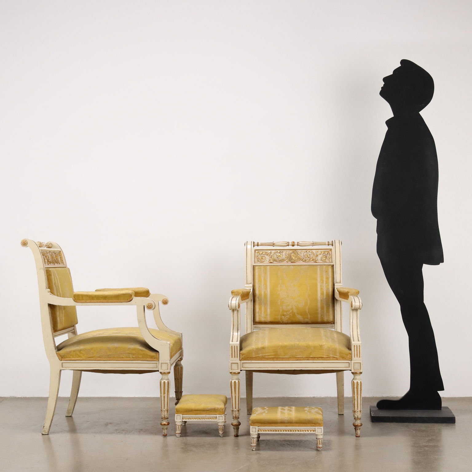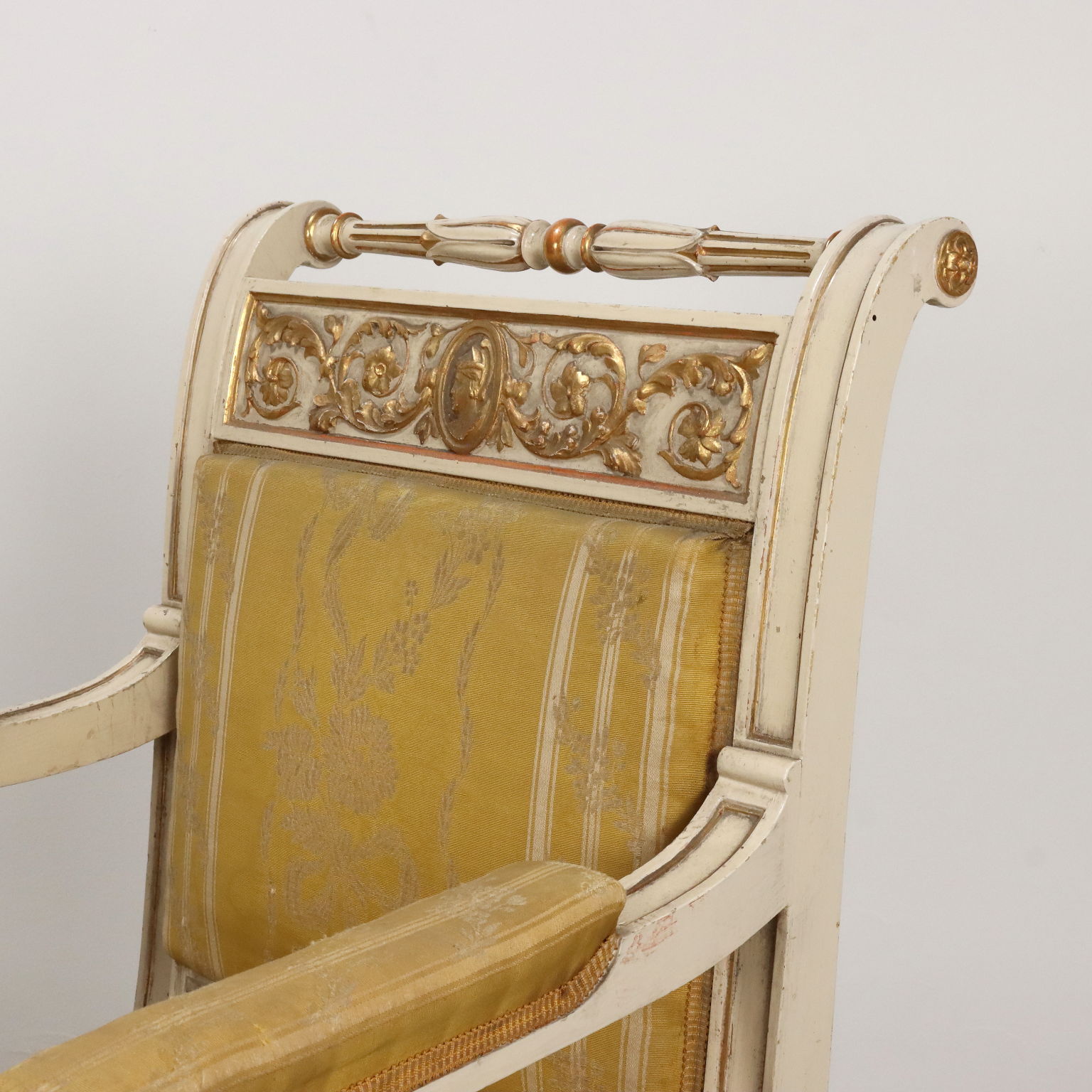 Coppia di poltrone con poggia piedi, in stile neoclassico. Piedi frontali torniti e posteriori a sciabola, schienale mosso con presa tornita e fascia intagliata con cammeo centrale affrontato da girali fogliacee. I motivi ad intaglio sono dorati a guazzo su fondo laccato avorio., stoffa originale.