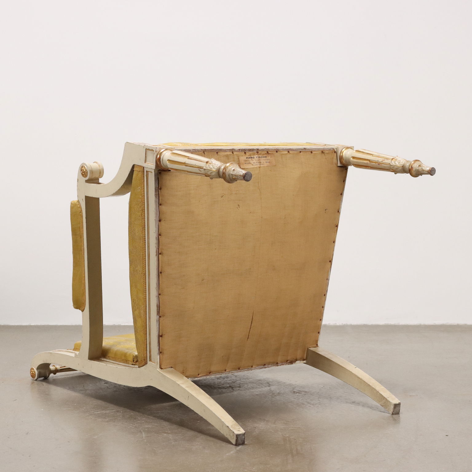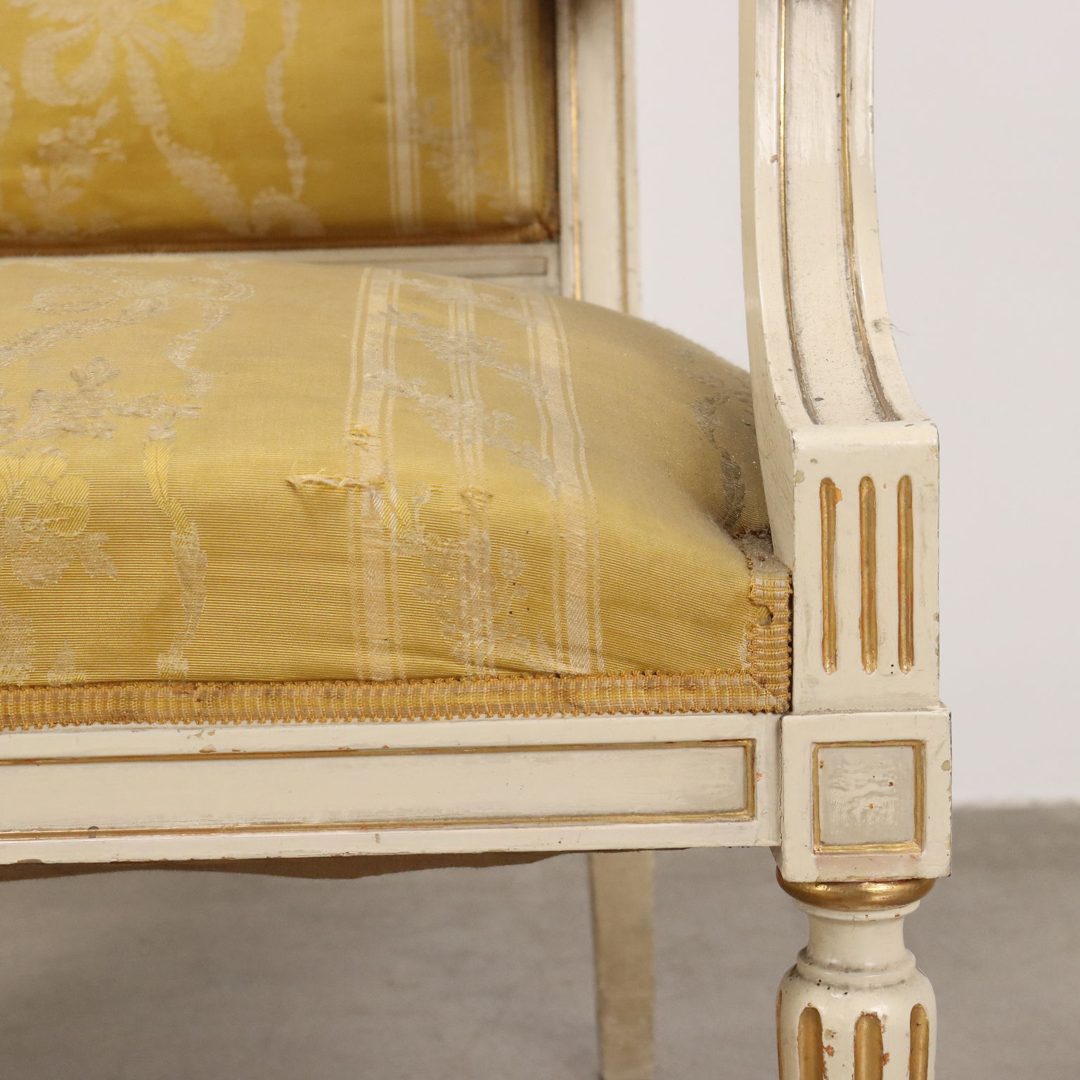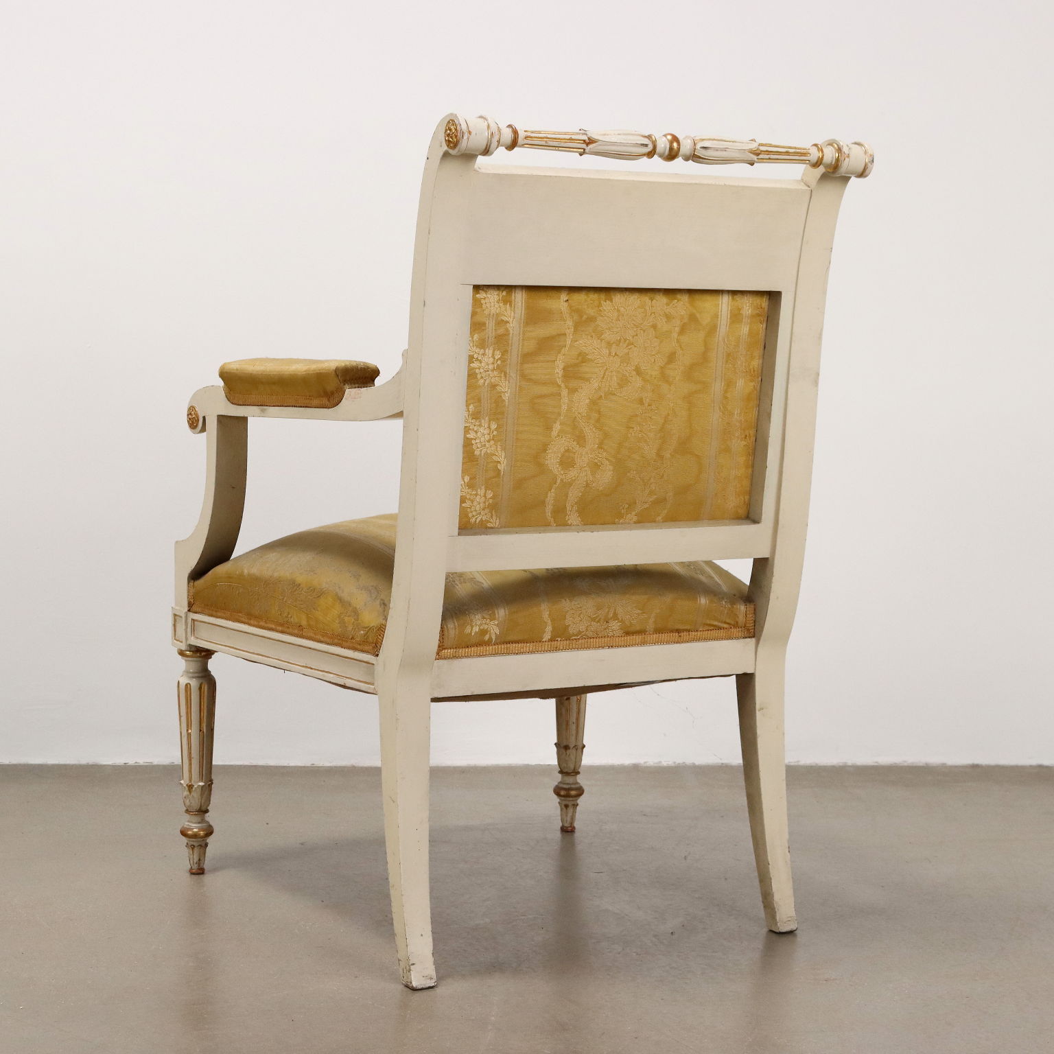 Coppia di poltrone con poggia piedi, in stile neoclassico. Piedi frontali torniti e posteriori a sciabola, schienale mosso con presa tornita e fascia intagliata con cammeo centrale affrontato da girali fogliacee. I motivi ad intaglio sono dorati a guazzo su fondo laccato avorio., stoffa originale.