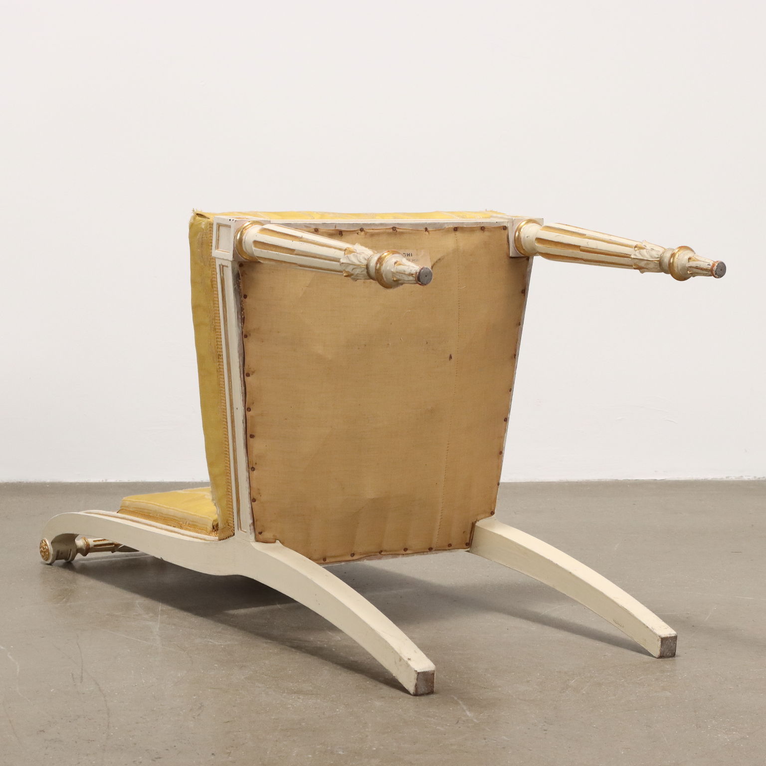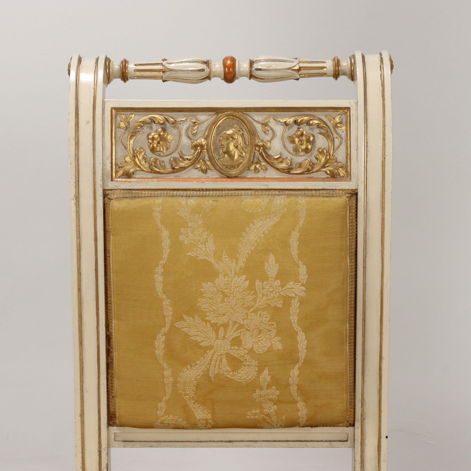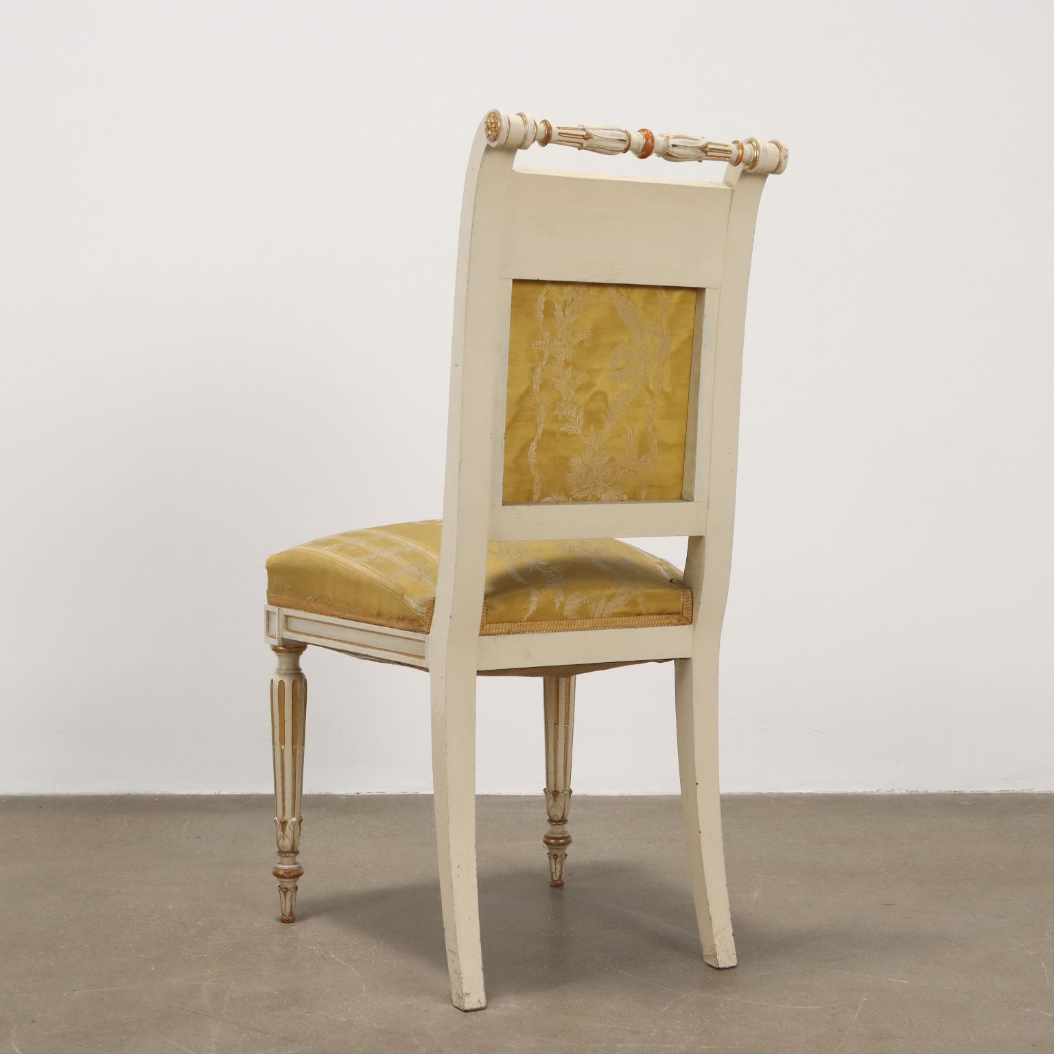 Coppia di sedie in stile neoclassico, gambe frontali tornite e intagliate, a sciabola le posteriori, schienale reclinato con presa tornita e intaglio a cammeo con girali fogliacee affrontate; intagli dorati su fondo laccato avorio, stoffa originale.