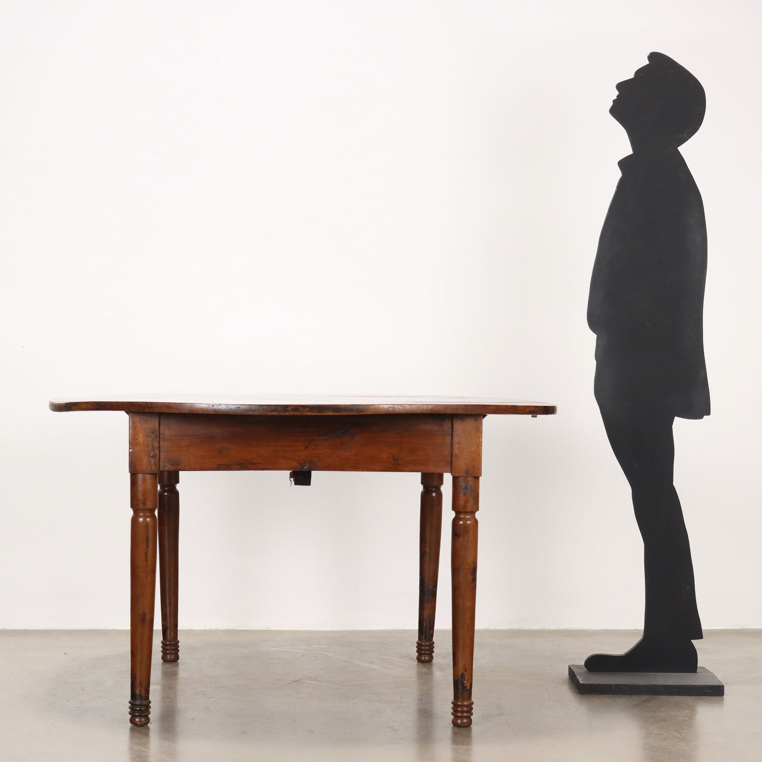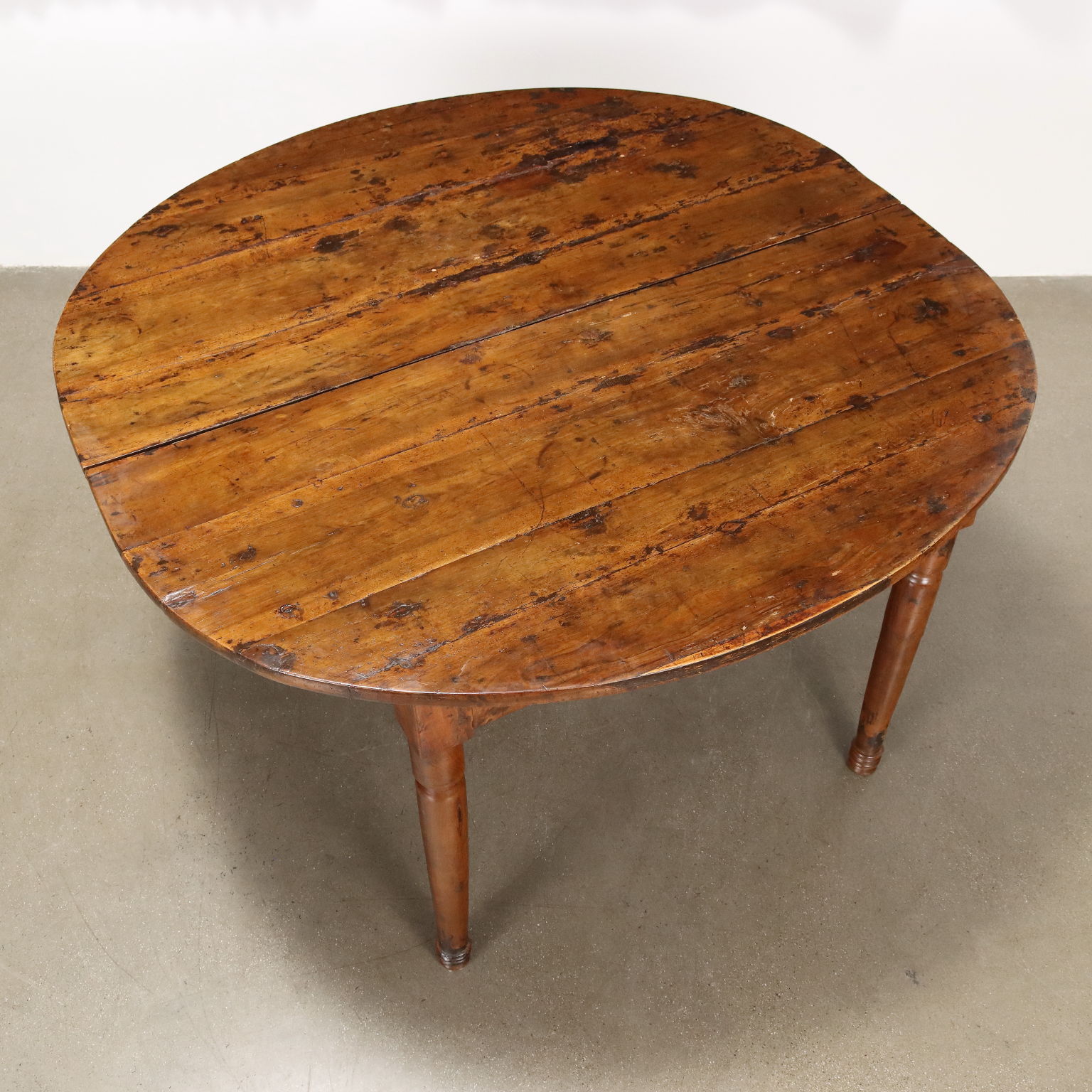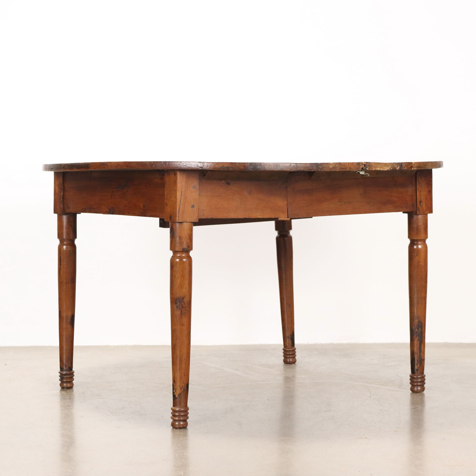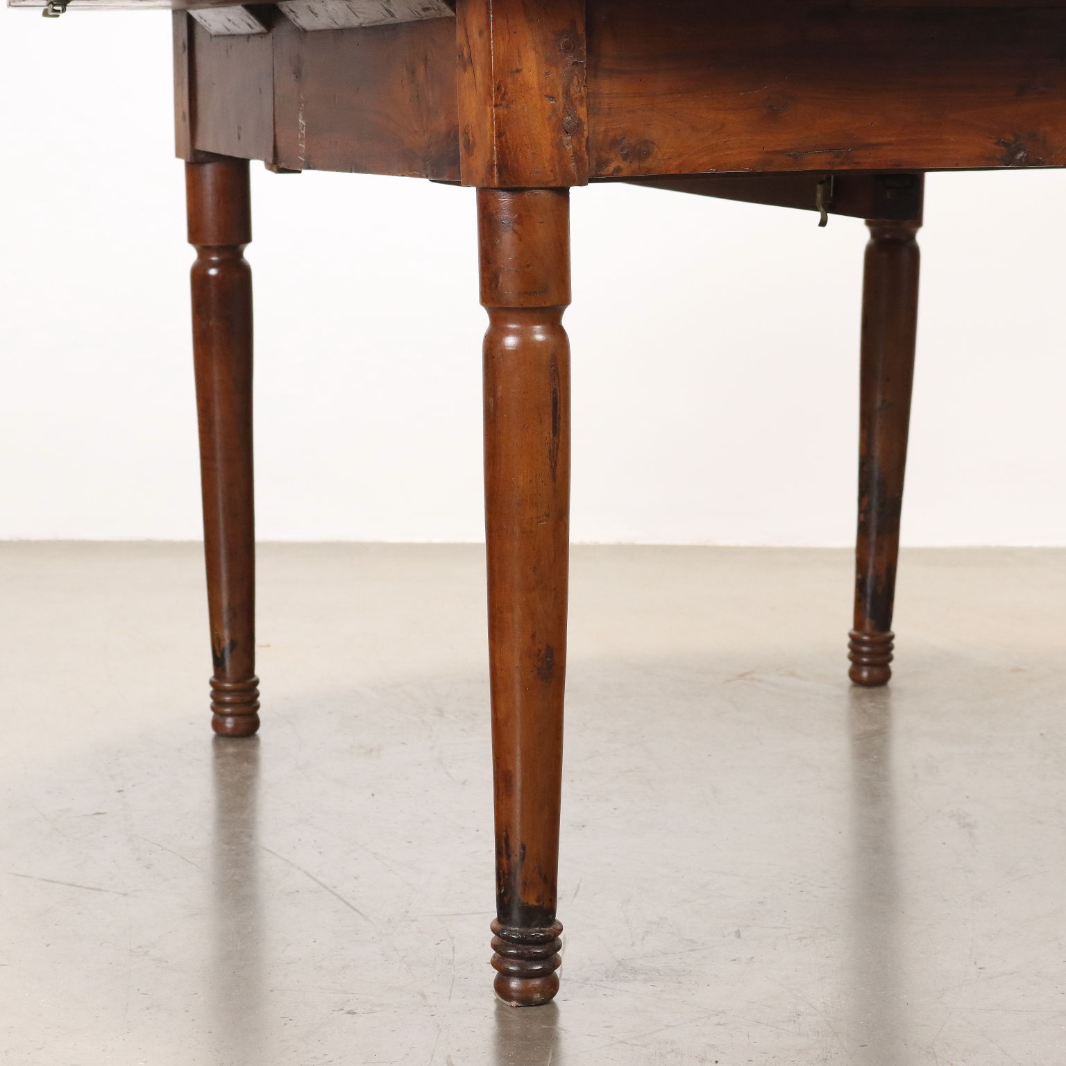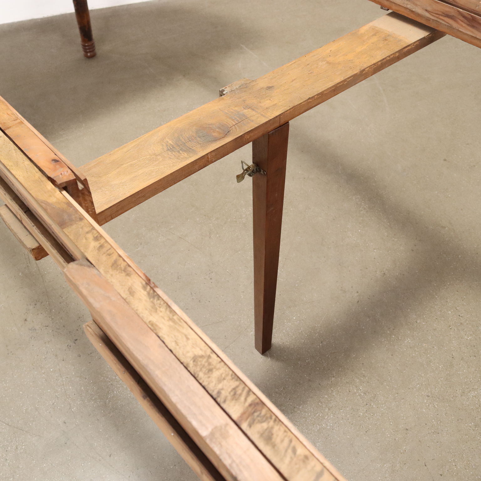 Tavolo in noce allungabile, gambe tornite. Prolunghe mancanti. Italia, XIX Secolo.