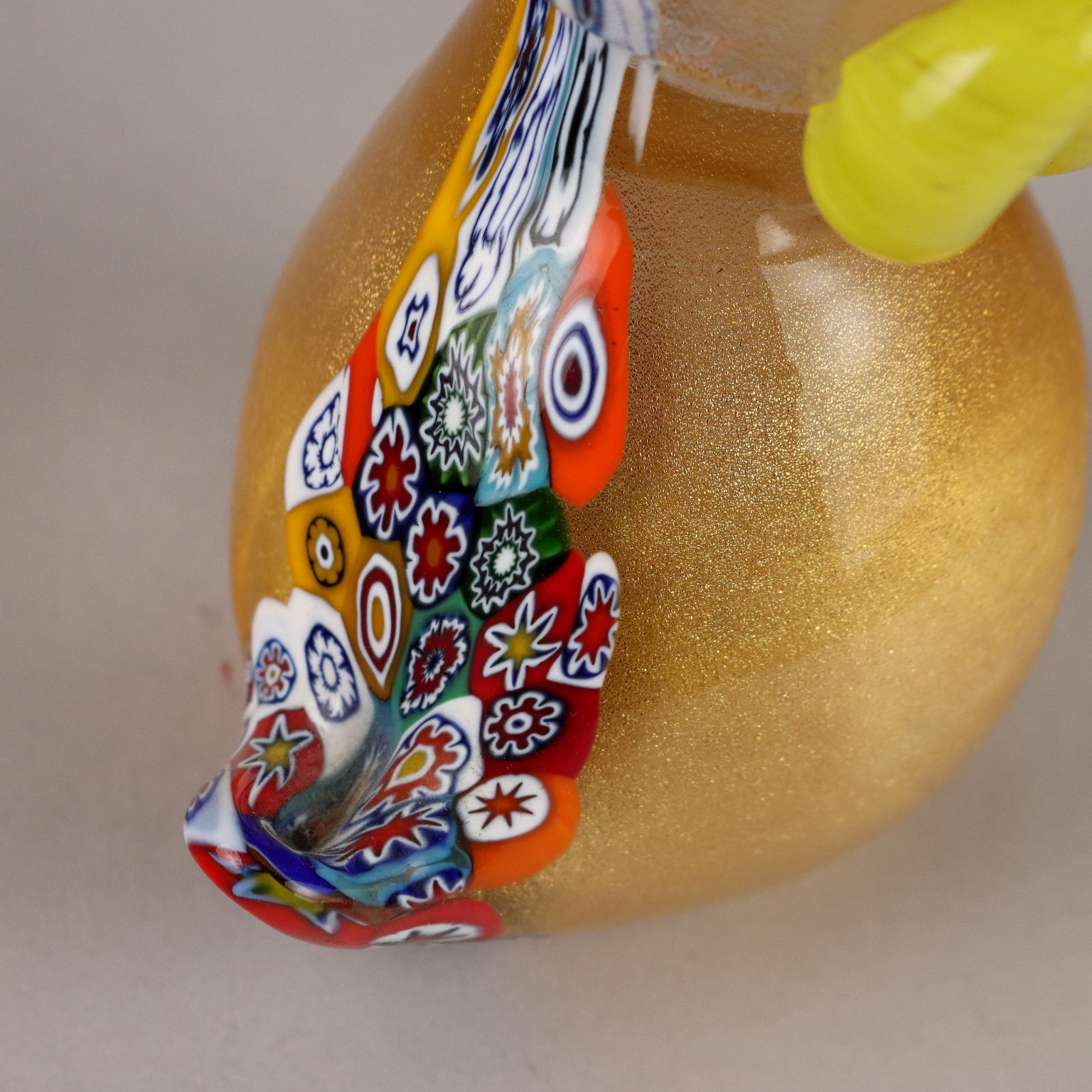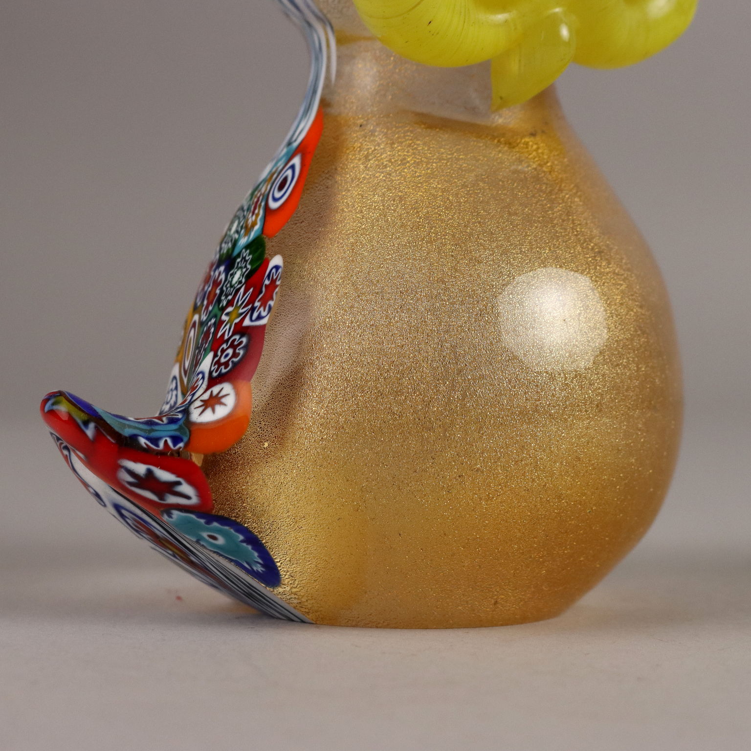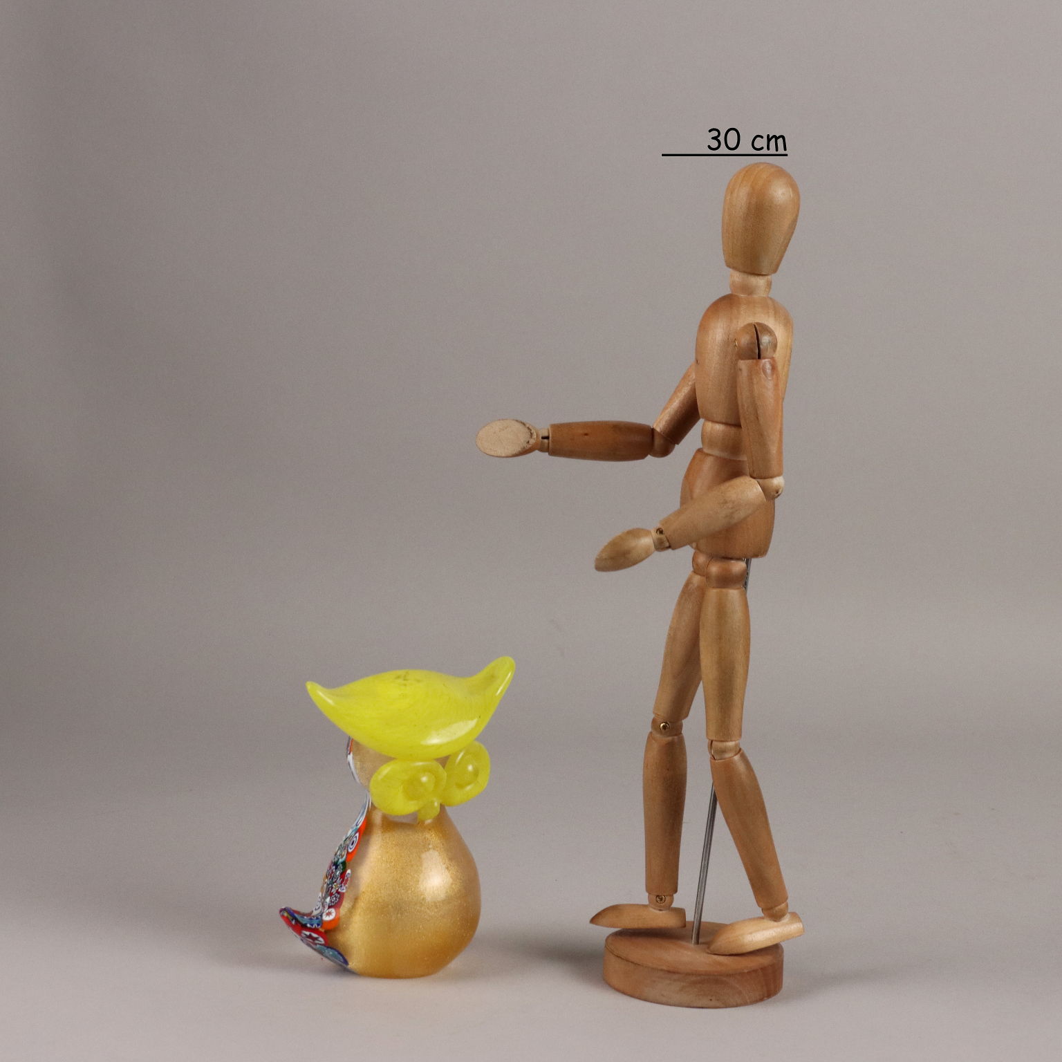 Gufo in vetro giallo e trasparente con inclusioni in oro e murrine policrome. Sotto la base marchio della manifattura.