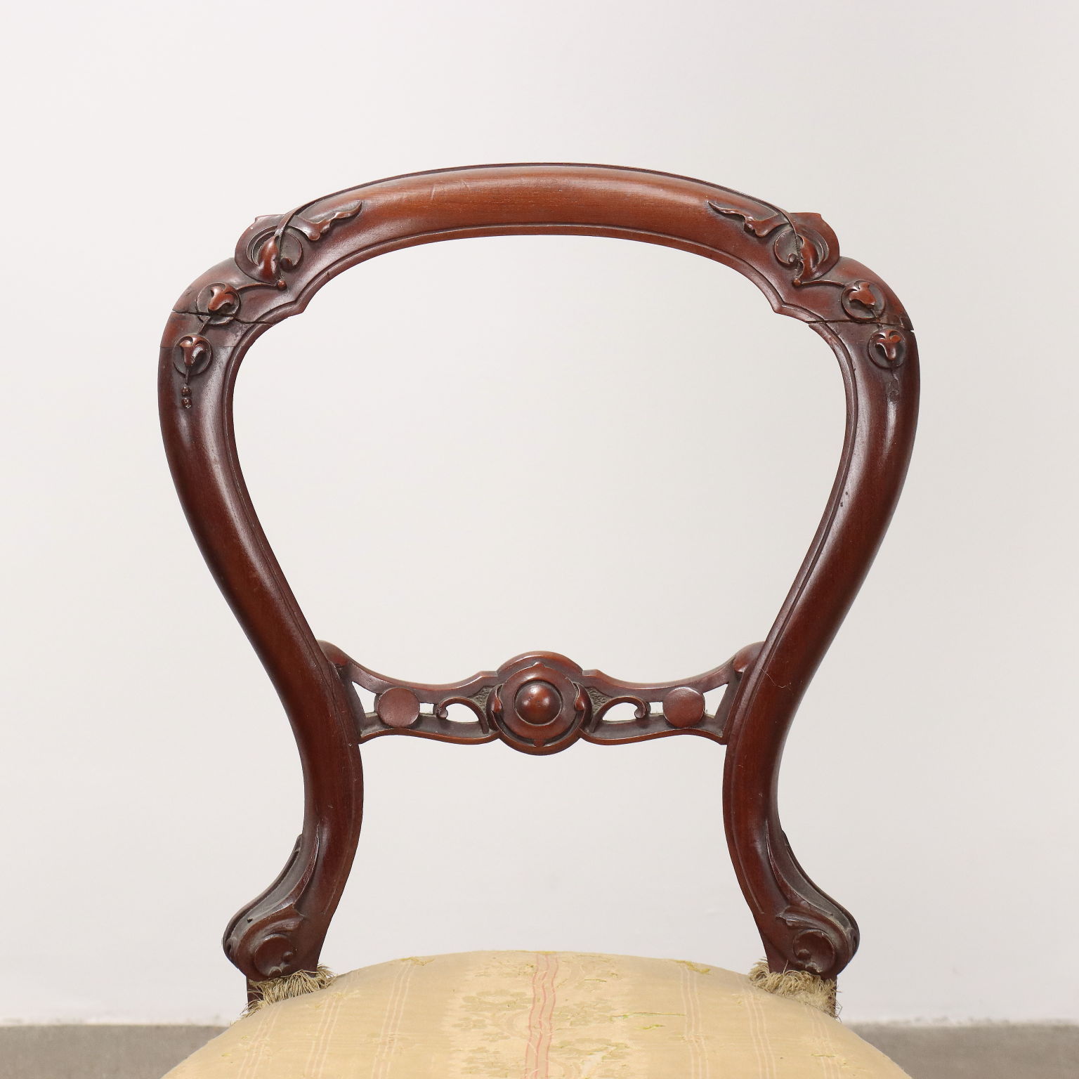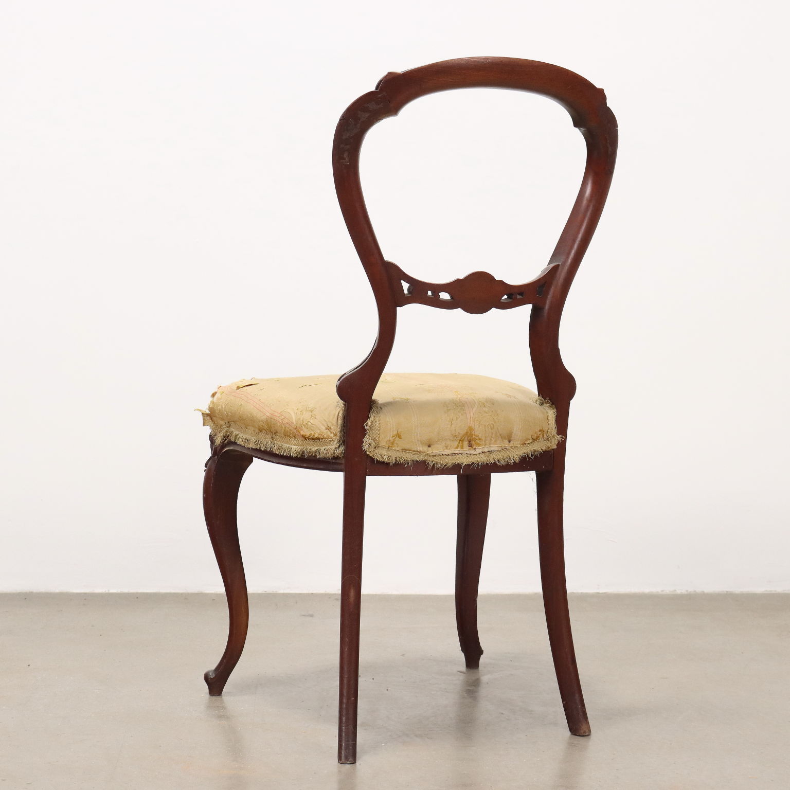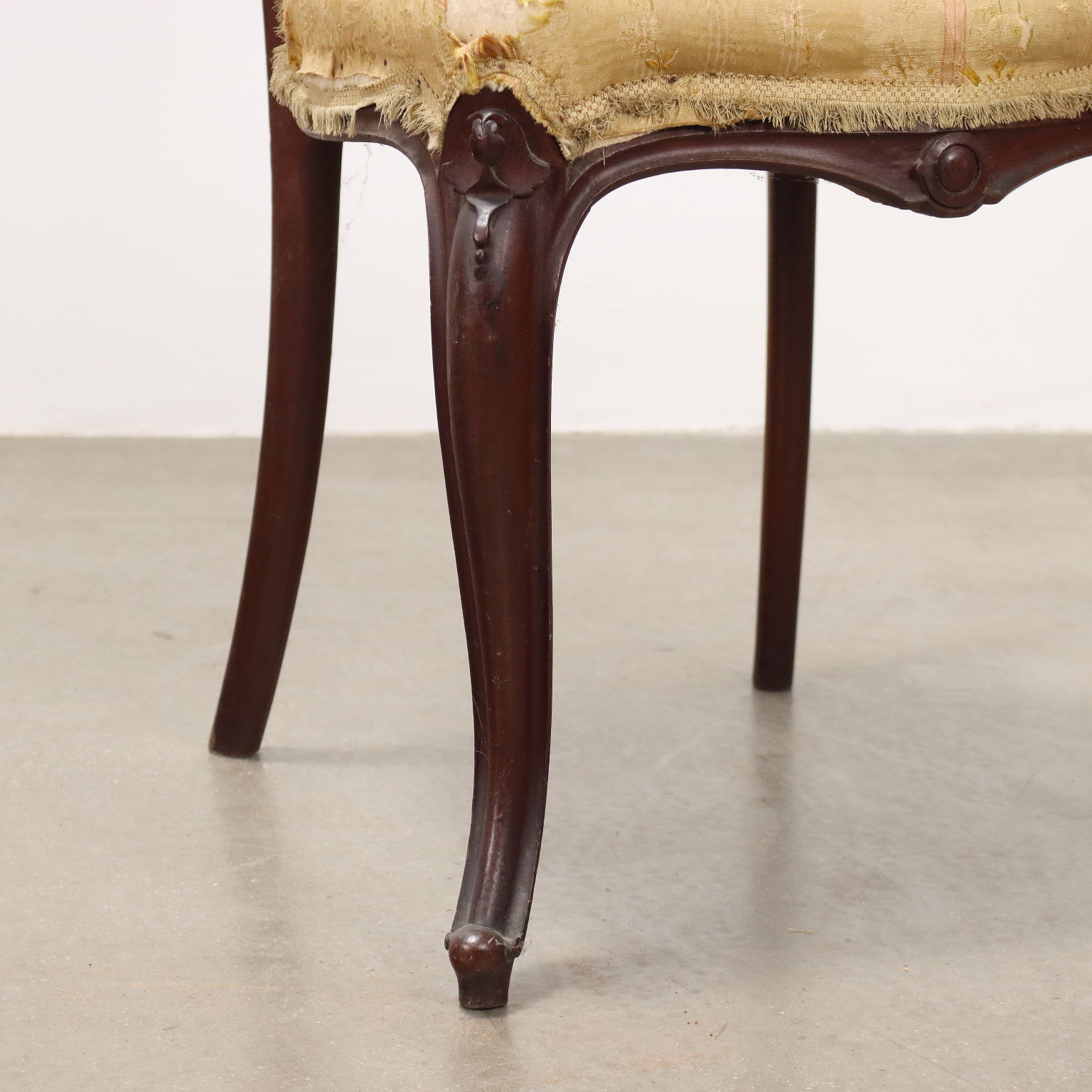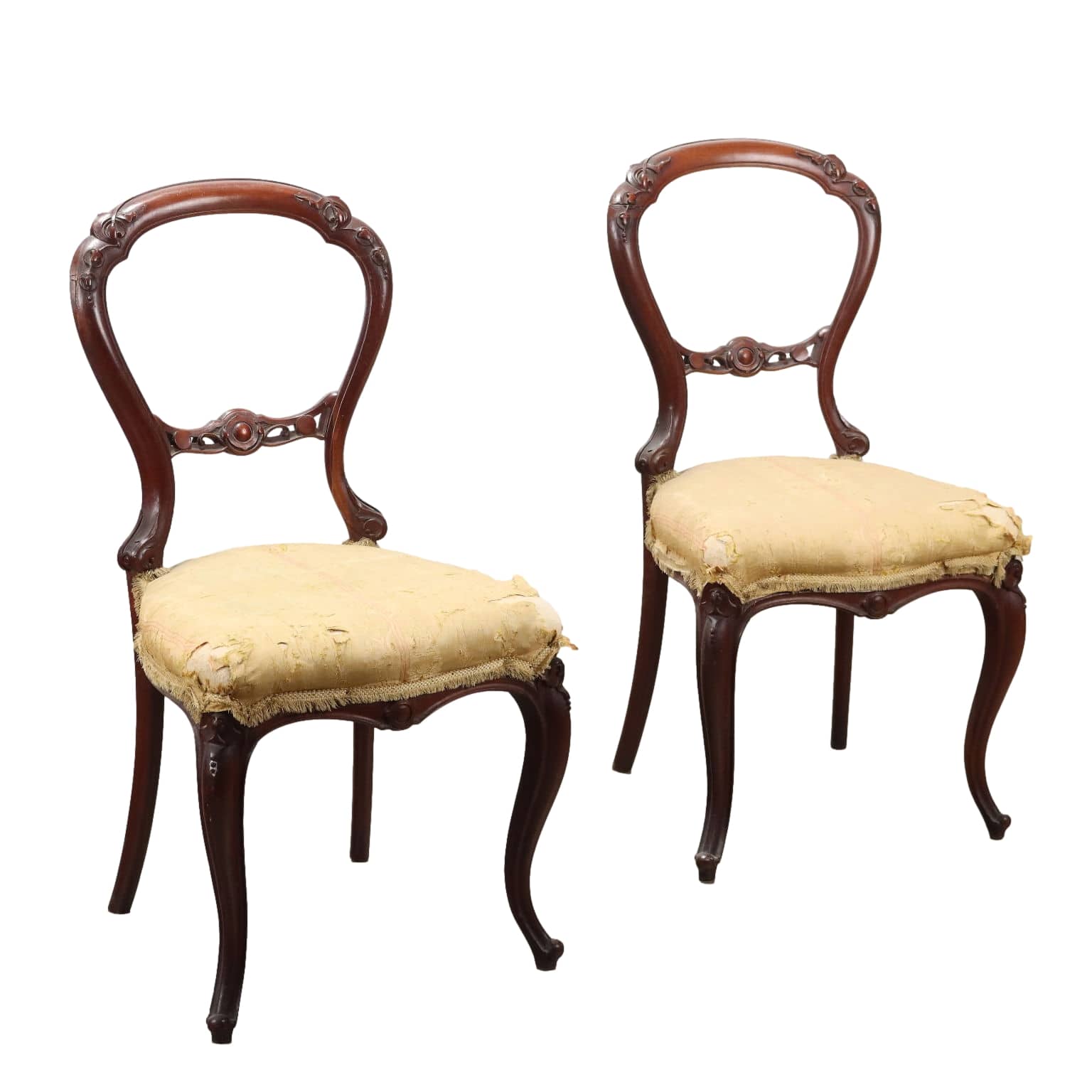 Coppia di sedie Liberty in mogano, schienale a giorno con intagli a volute e foglie che riprendono nelle gambe e nella fascia. Seduta imbottita, gambe mosse. Italia, fine XIX Secolo.