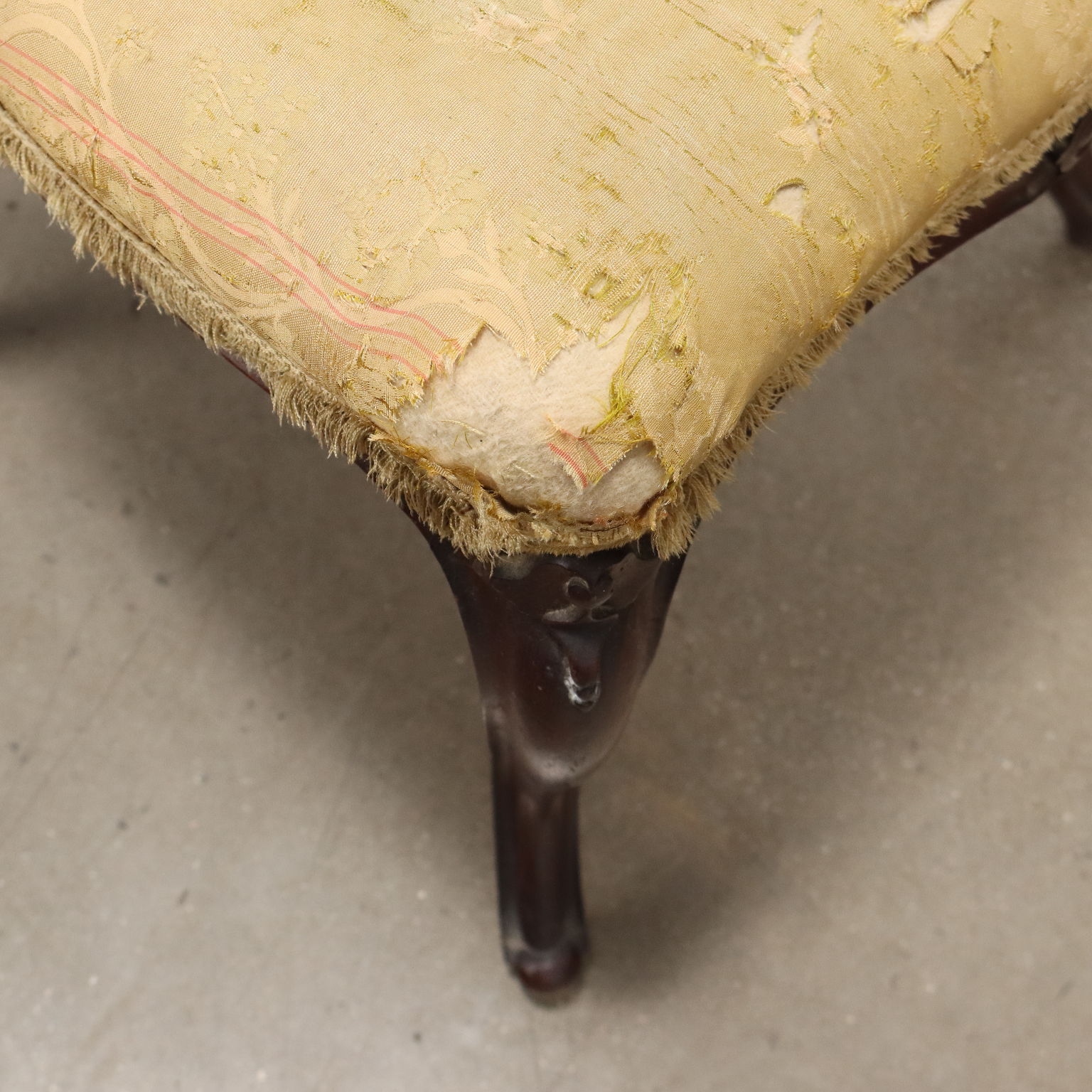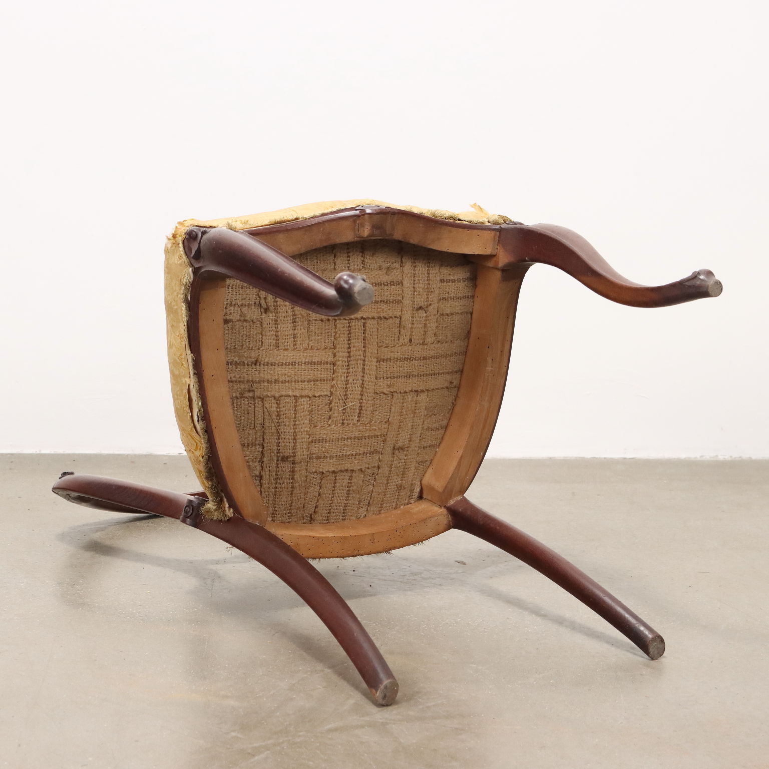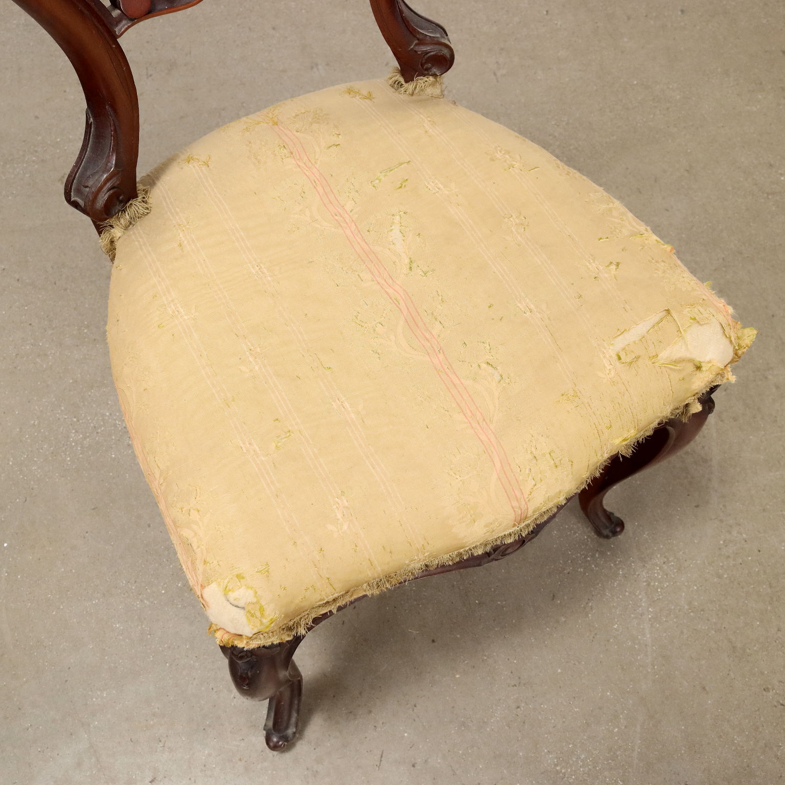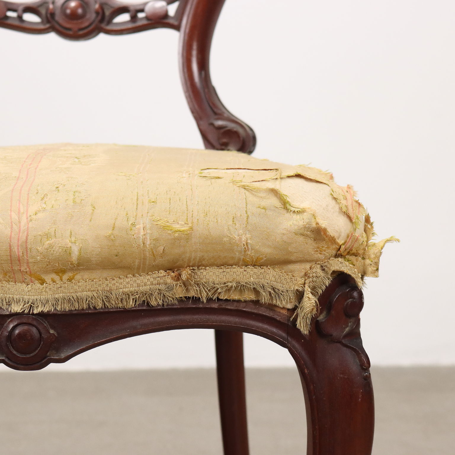 Coppia di sedie Liberty in mogano, schienale a giorno con intagli a volute e foglie che riprendono nelle gambe e nella fascia. Seduta imbottita, gambe mosse. Italia, fine XIX Secolo.