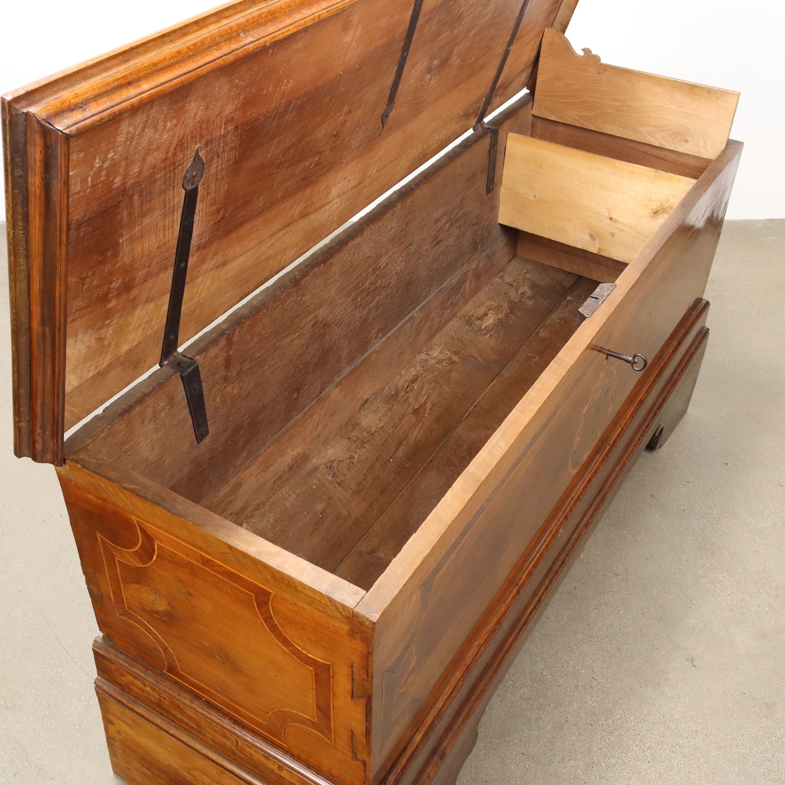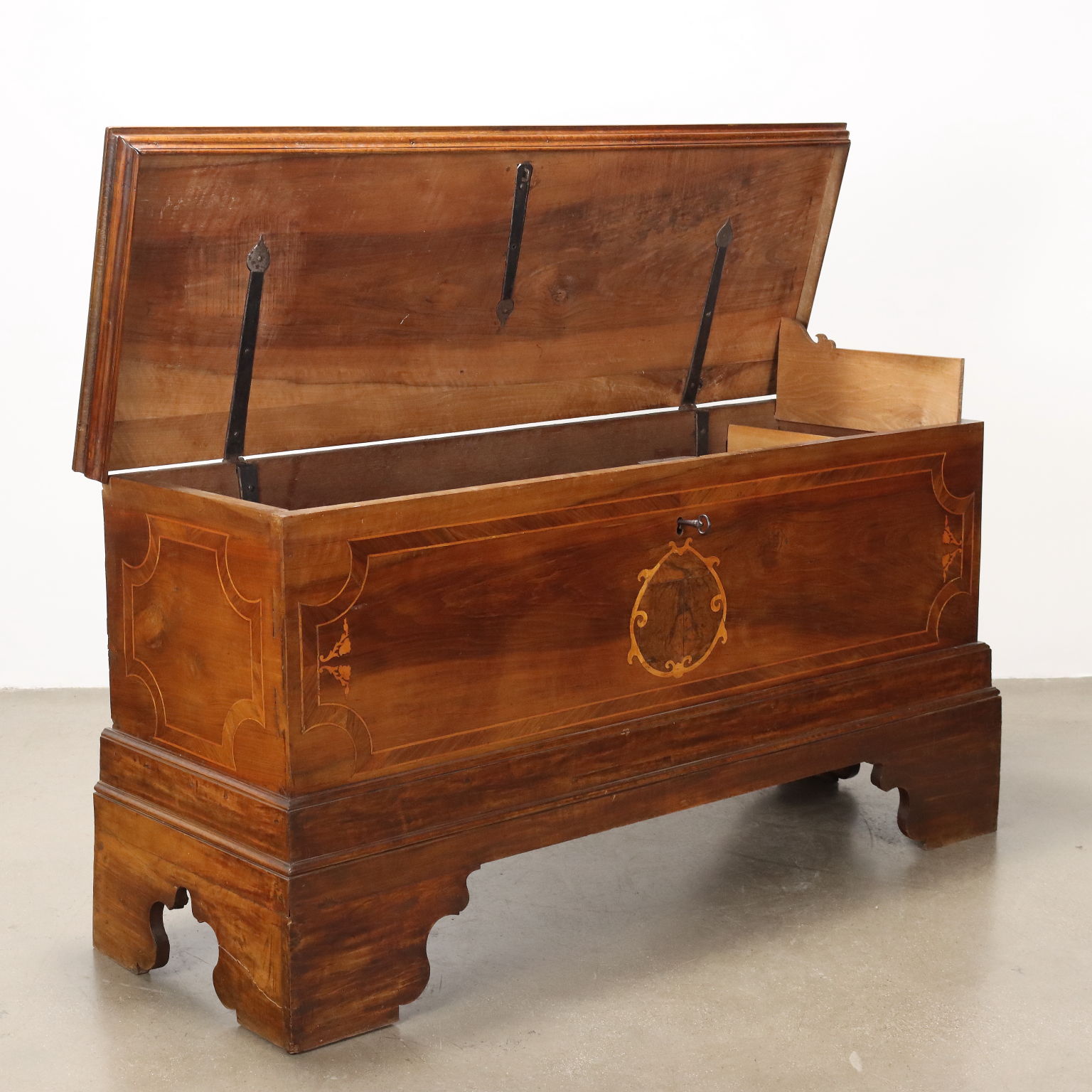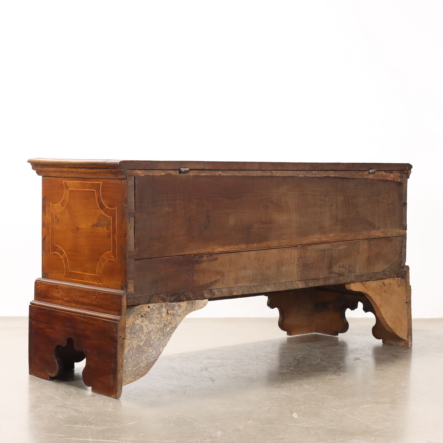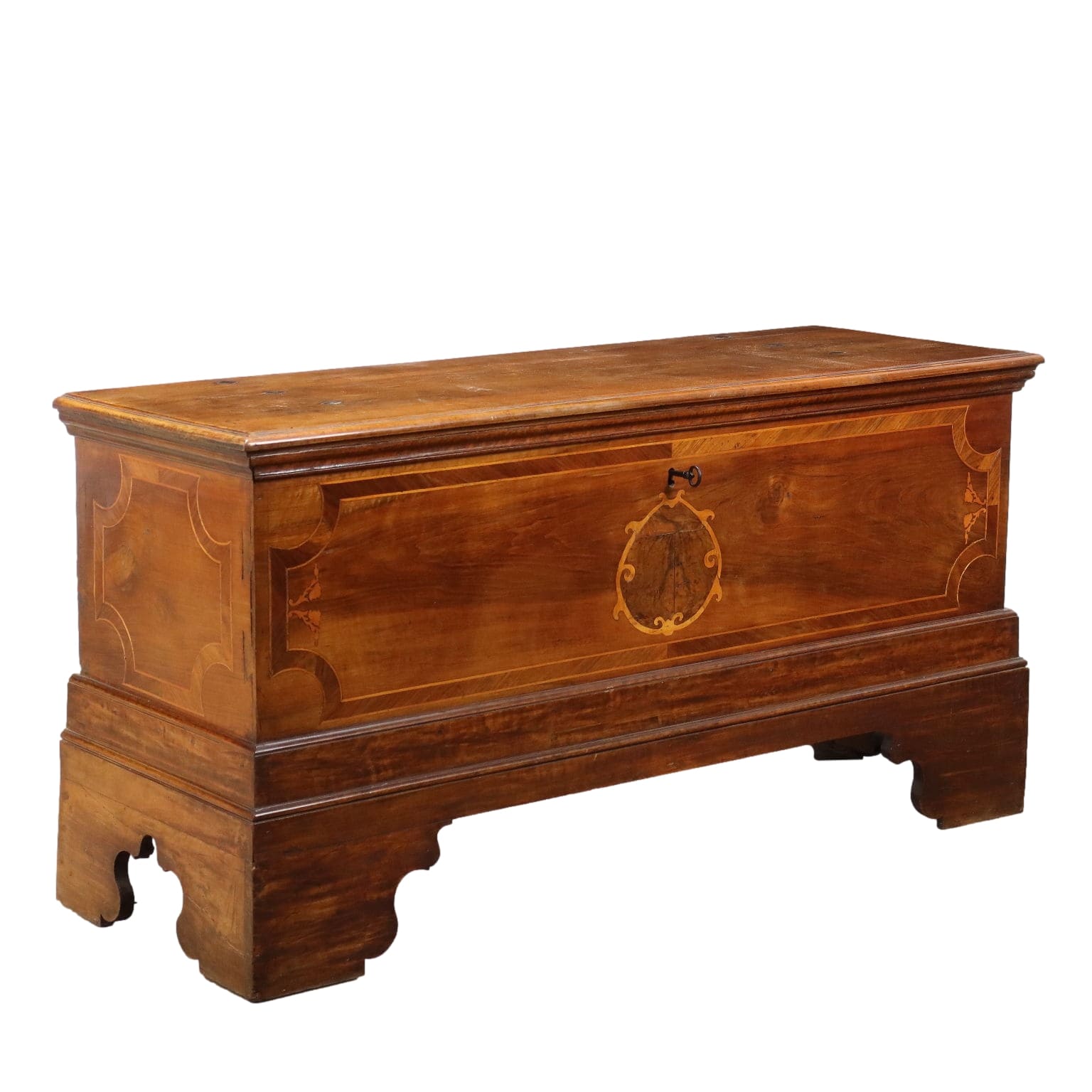 Cassapanca in noce, fronte e fianchi con filettature e intarsi in acero, radica di noce e noce. Piedi a mensola, schienale e fondo in rovere. Italia, seconda metà XIX Secolo.
