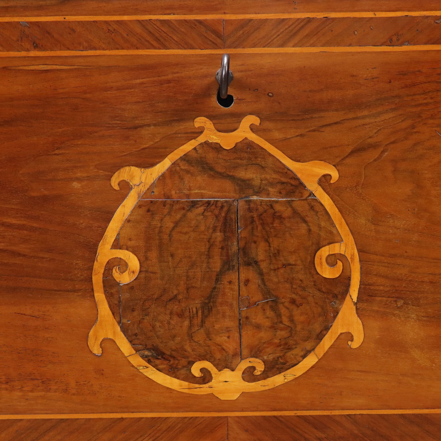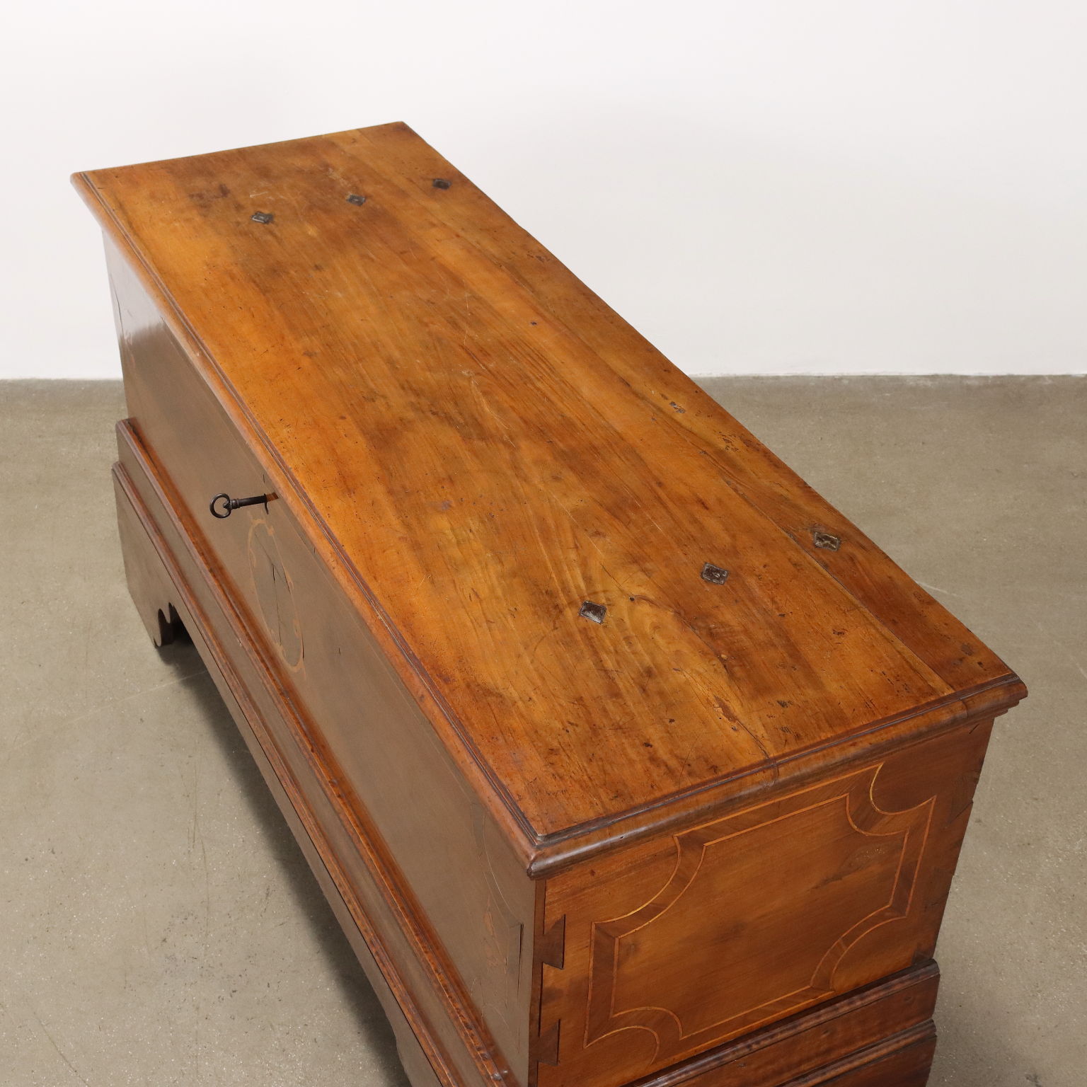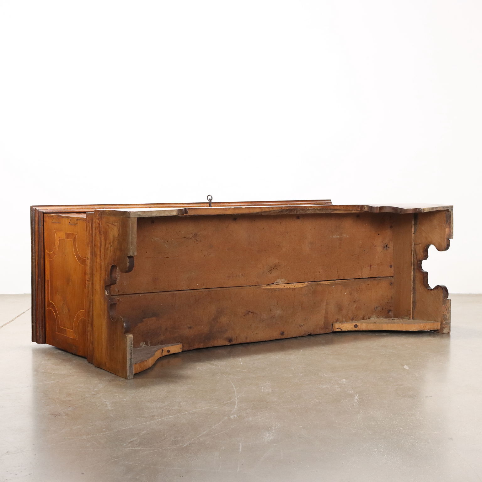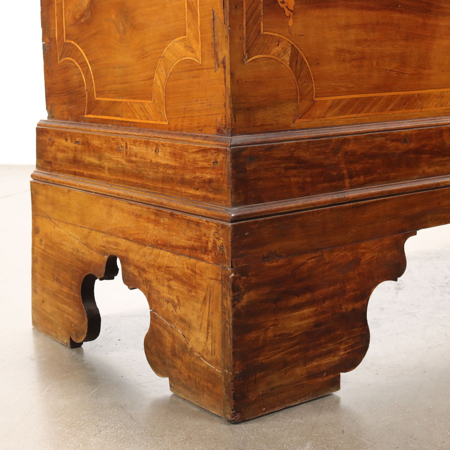 Cassapanca in noce, fronte e fianchi con filettature e intarsi in acero, radica di noce e noce. Piedi a mensola, schienale e fondo in rovere. Italia, seconda metà XIX Secolo.