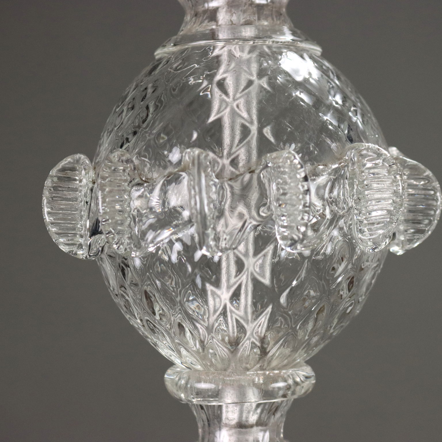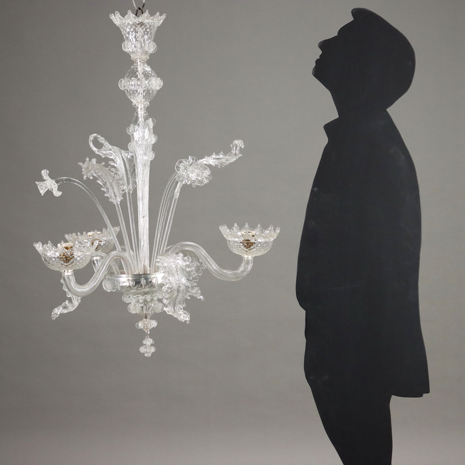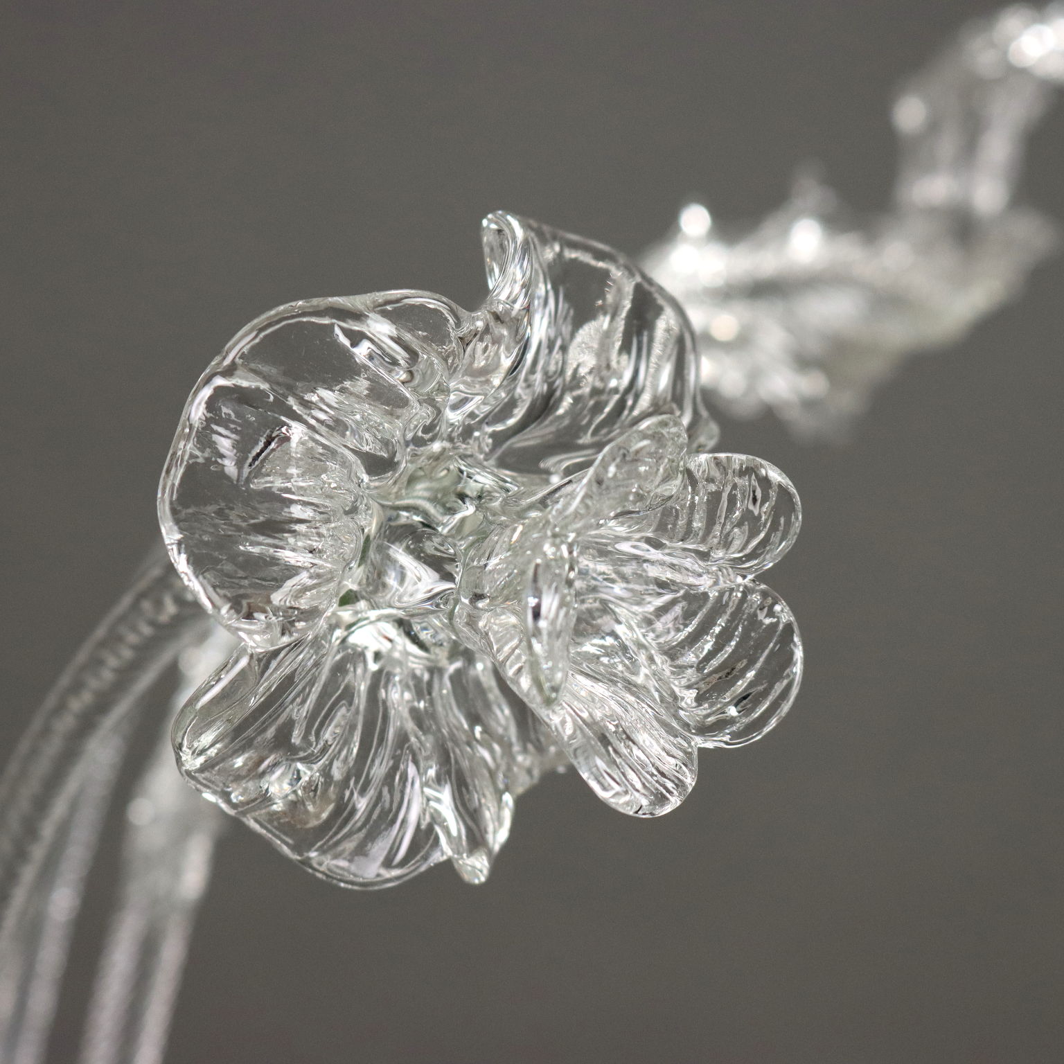Lampadario Veneziano in vetro soffiato a tre luci sorrette da braccia mosse, fusto centrale adornato da foglie, fiori e pendenti. Italia, inizio XX Secolo.