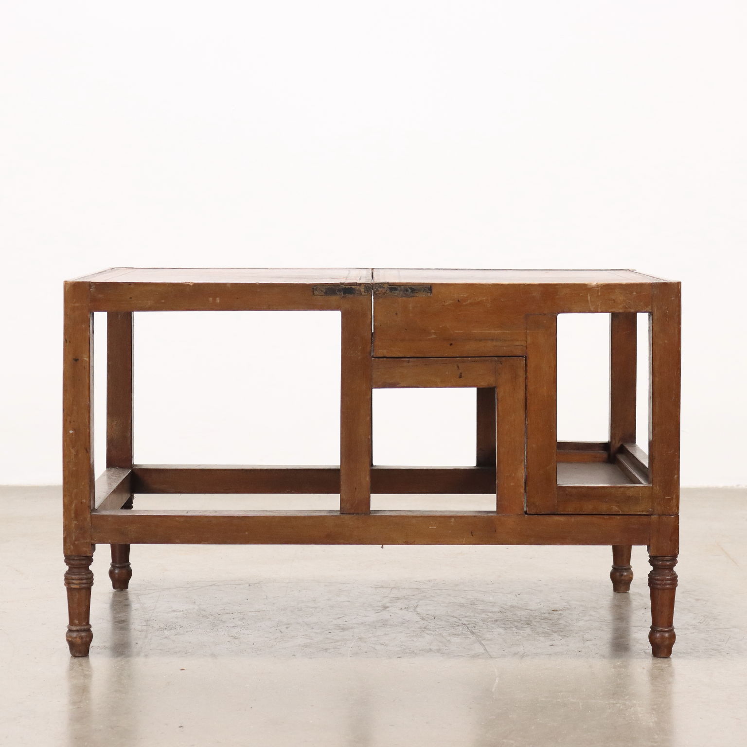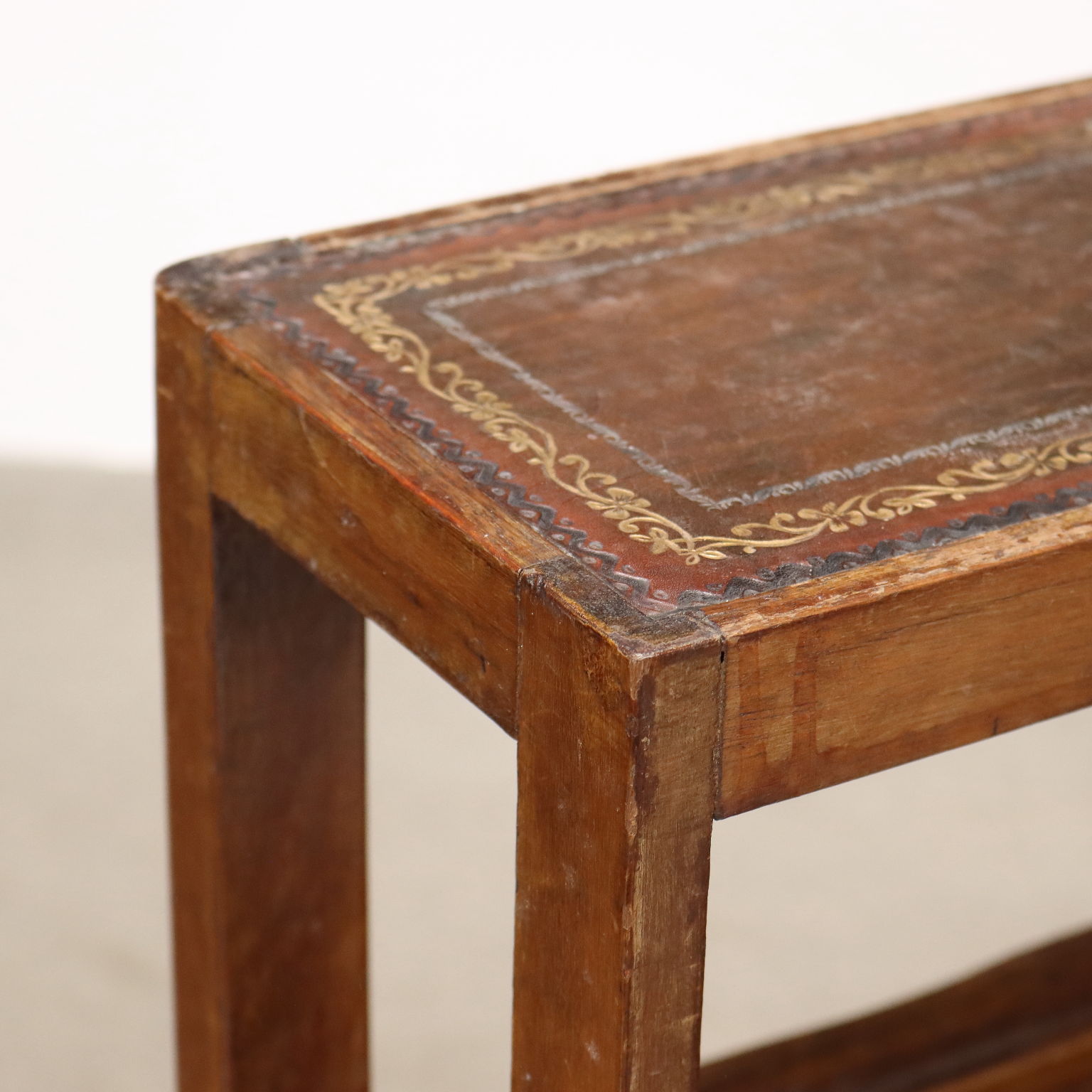 Scaletta richiudibile inglese, fine del '900. Realizzata in mogano coi piani rivestiti in pelle lavorata a "marocchino" con bordure dorate. Chiusa si presenta come un panchetto coi piani comunque finiti in pelle, piedi torniti.