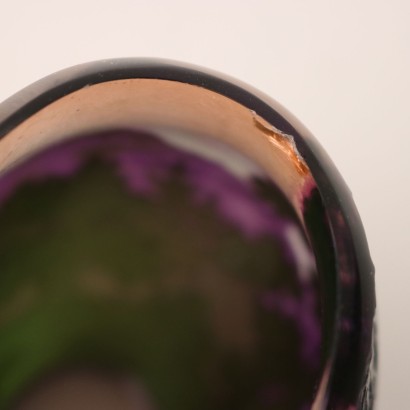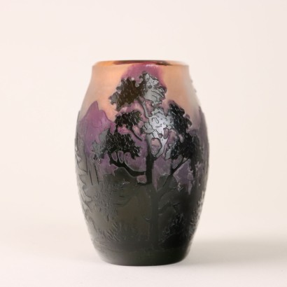 Vaso in vetro policromo decorato con paesaggio a tutto campo. Vaso ottenuto aggiungendo lamelle di vetro colorato quando il vetro è ancora incandescente. In seguito, una volta modellato e ricotto, il vaso viene inciso e decorato.
