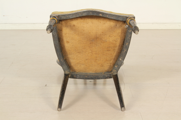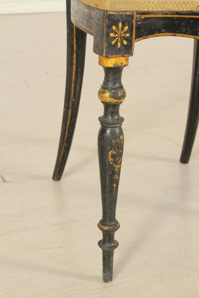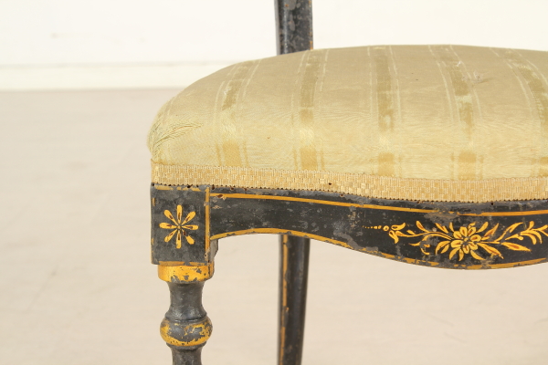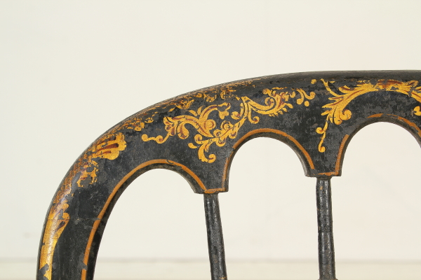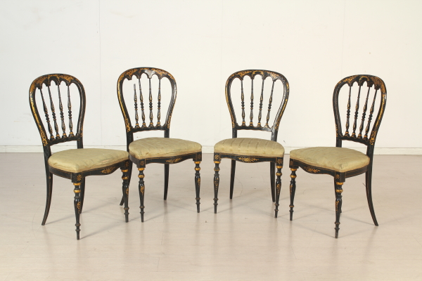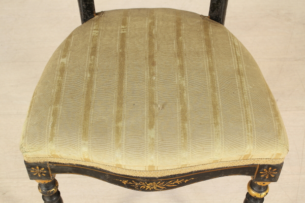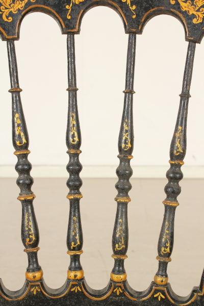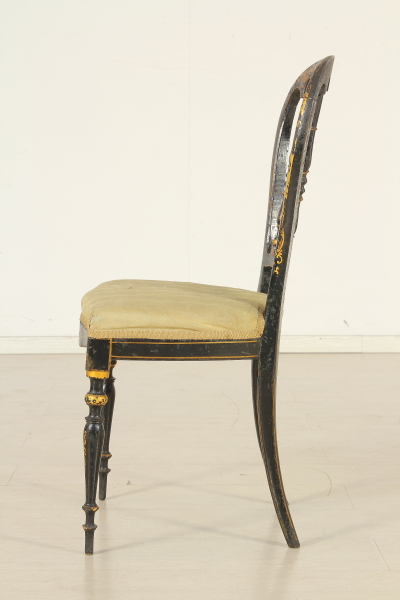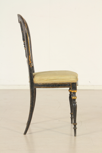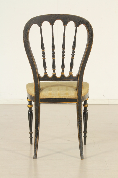 Rette da gambe tornite, presentano schienale a giorno con torniture. Struttura interamente laccata nera con dorature. Seduta imbottita.