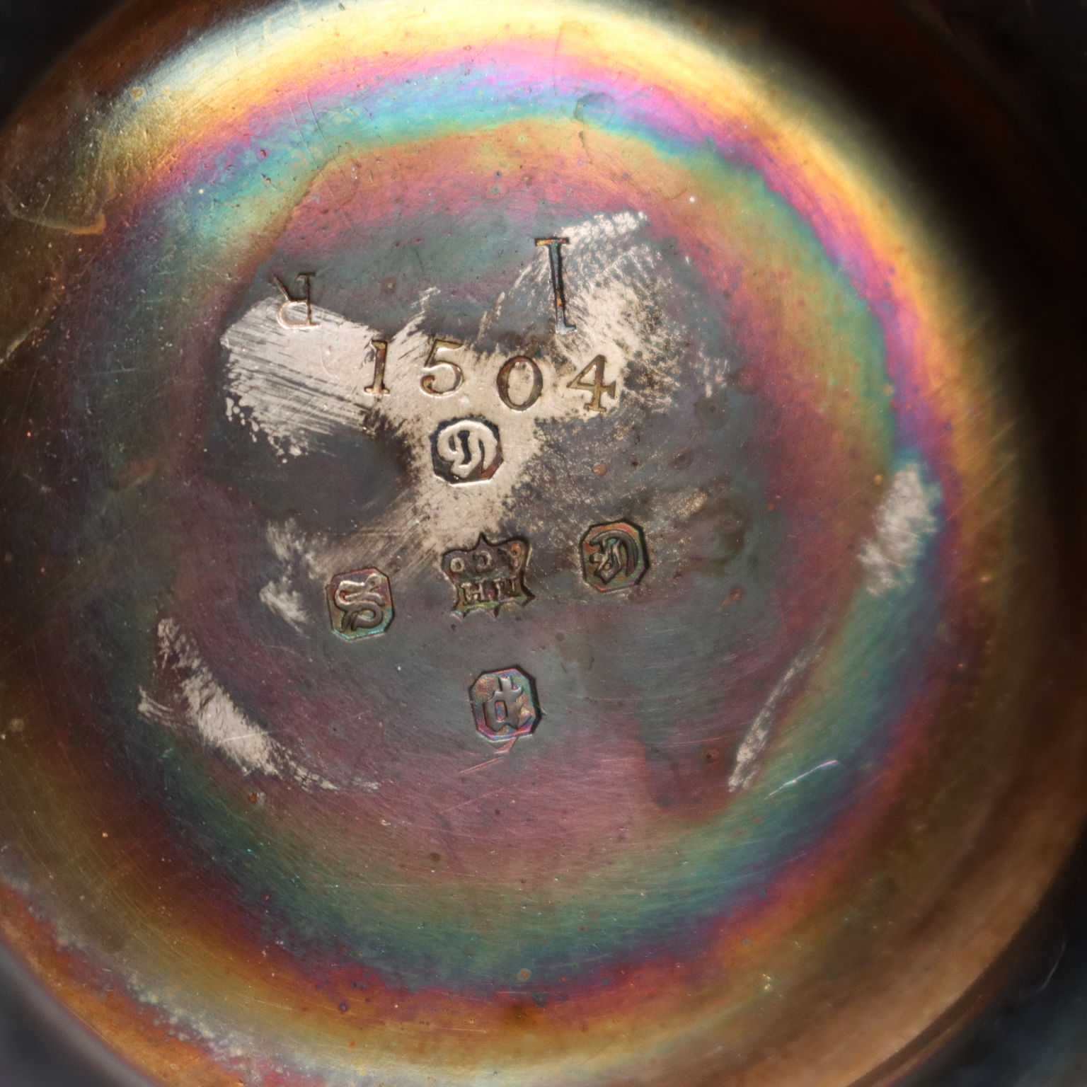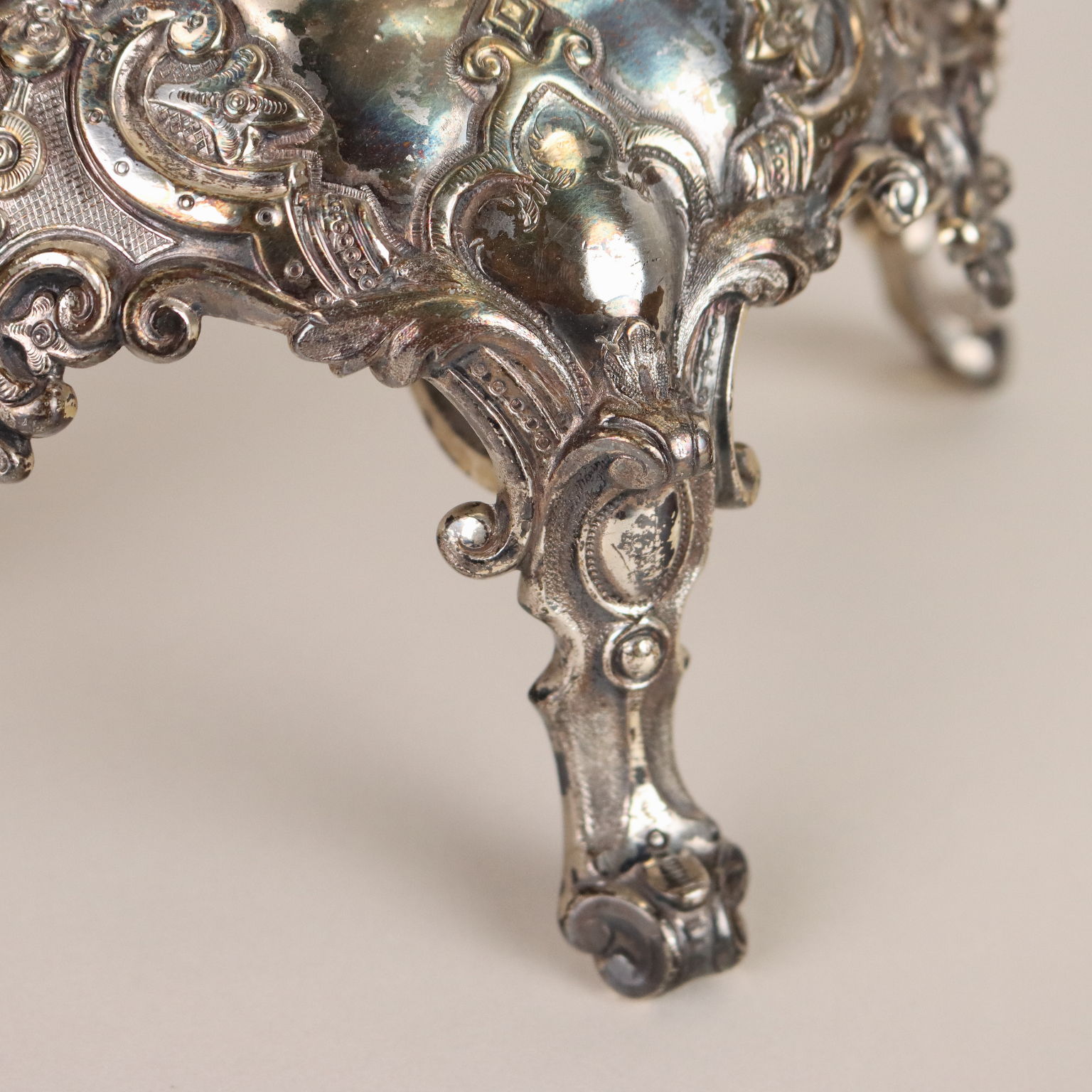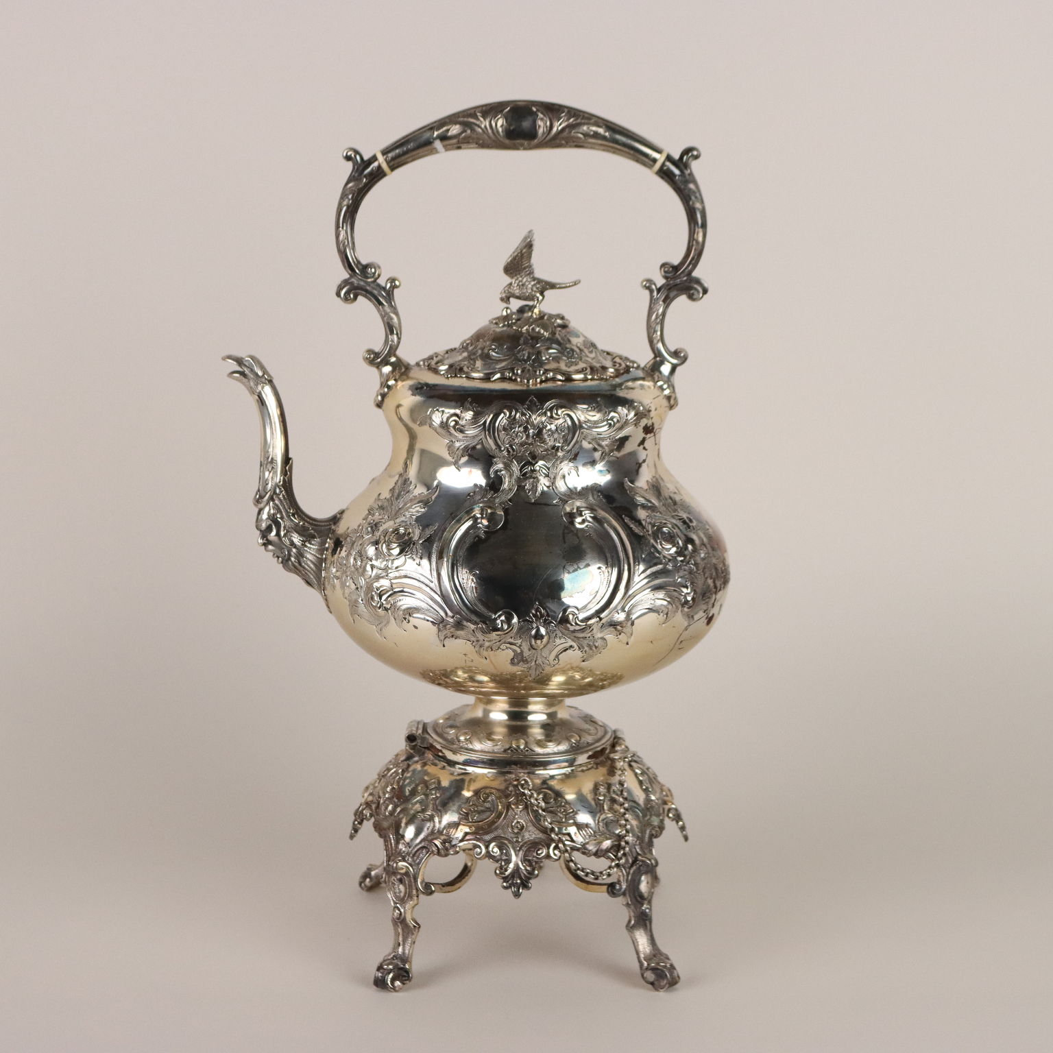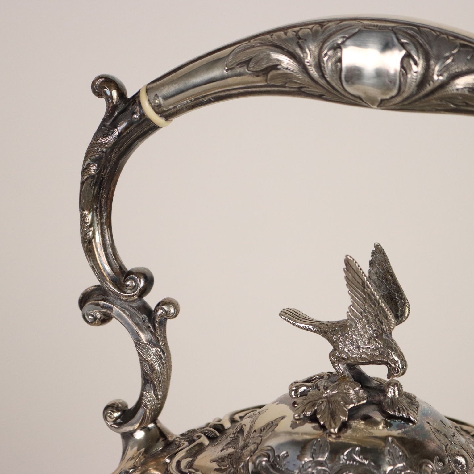 Bollitore in metallo argentato, sbalzato e inciso a volute fogliacee e fiori. Presa raffigurante rapace, manico con inserti in osso e beccuccio con mascherone a rilievo e testa di uccello. Meccanismo di ribaltamento funzionante. Marchi della manifattura incussi sotto la base.