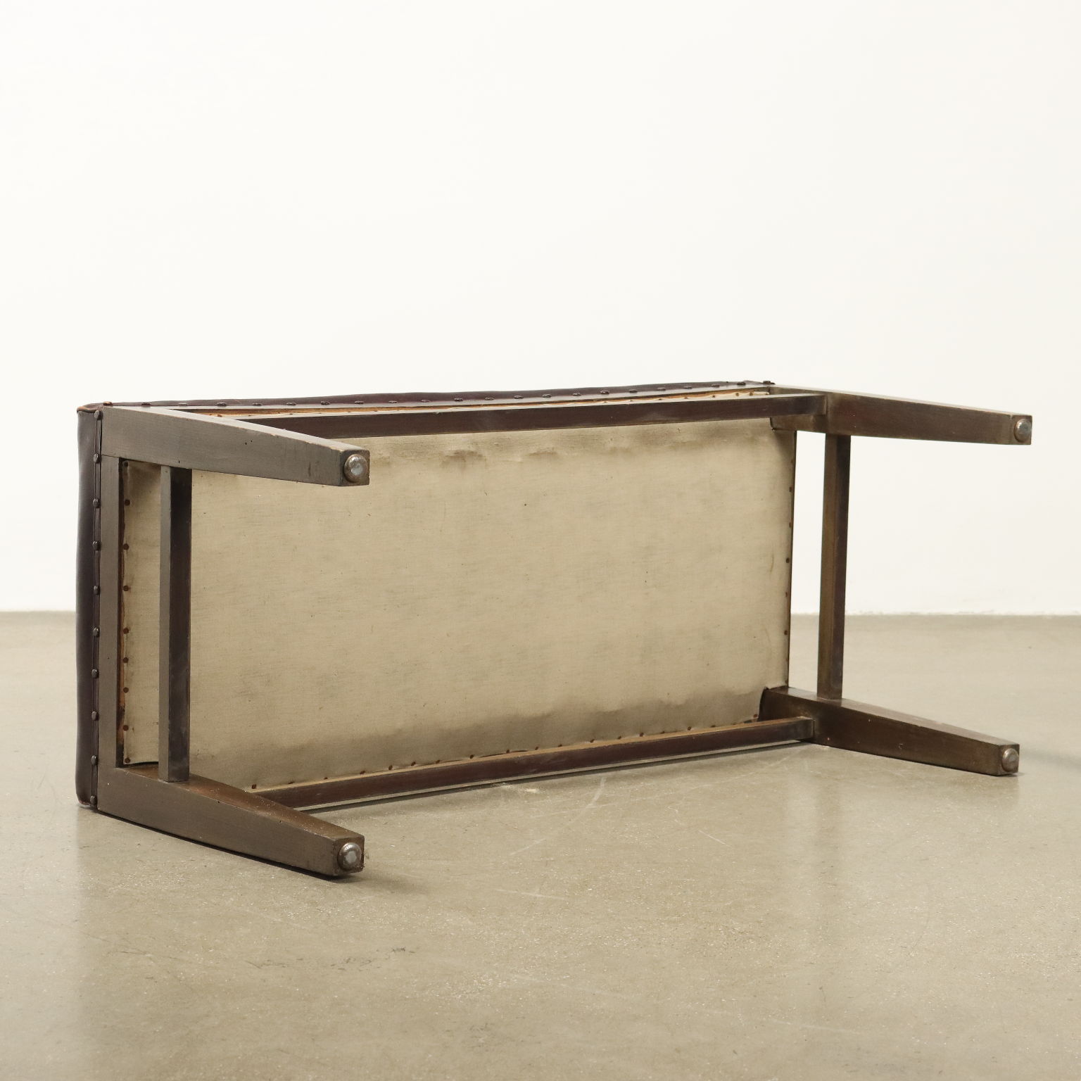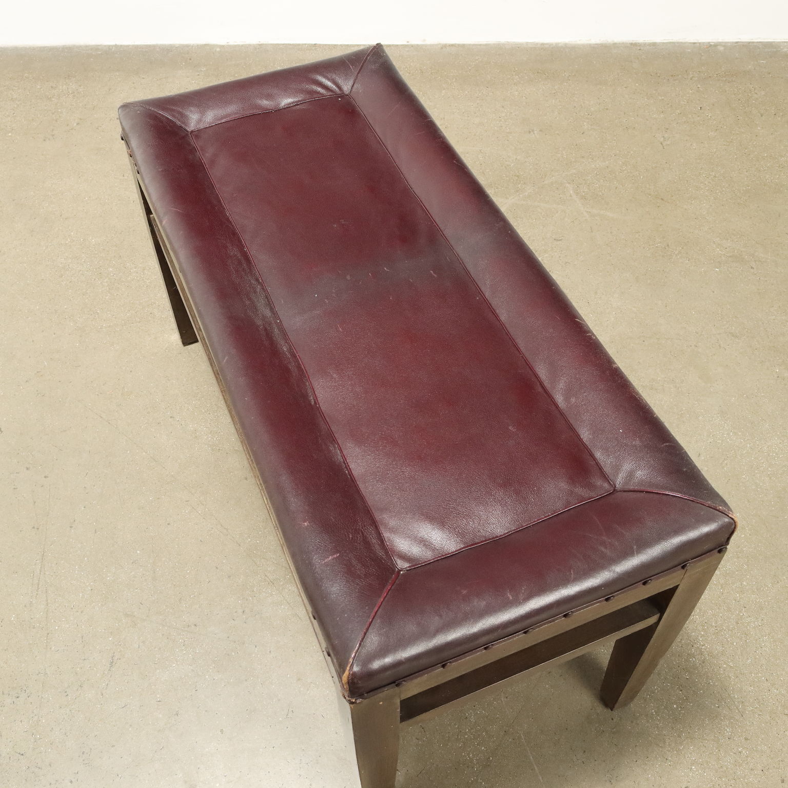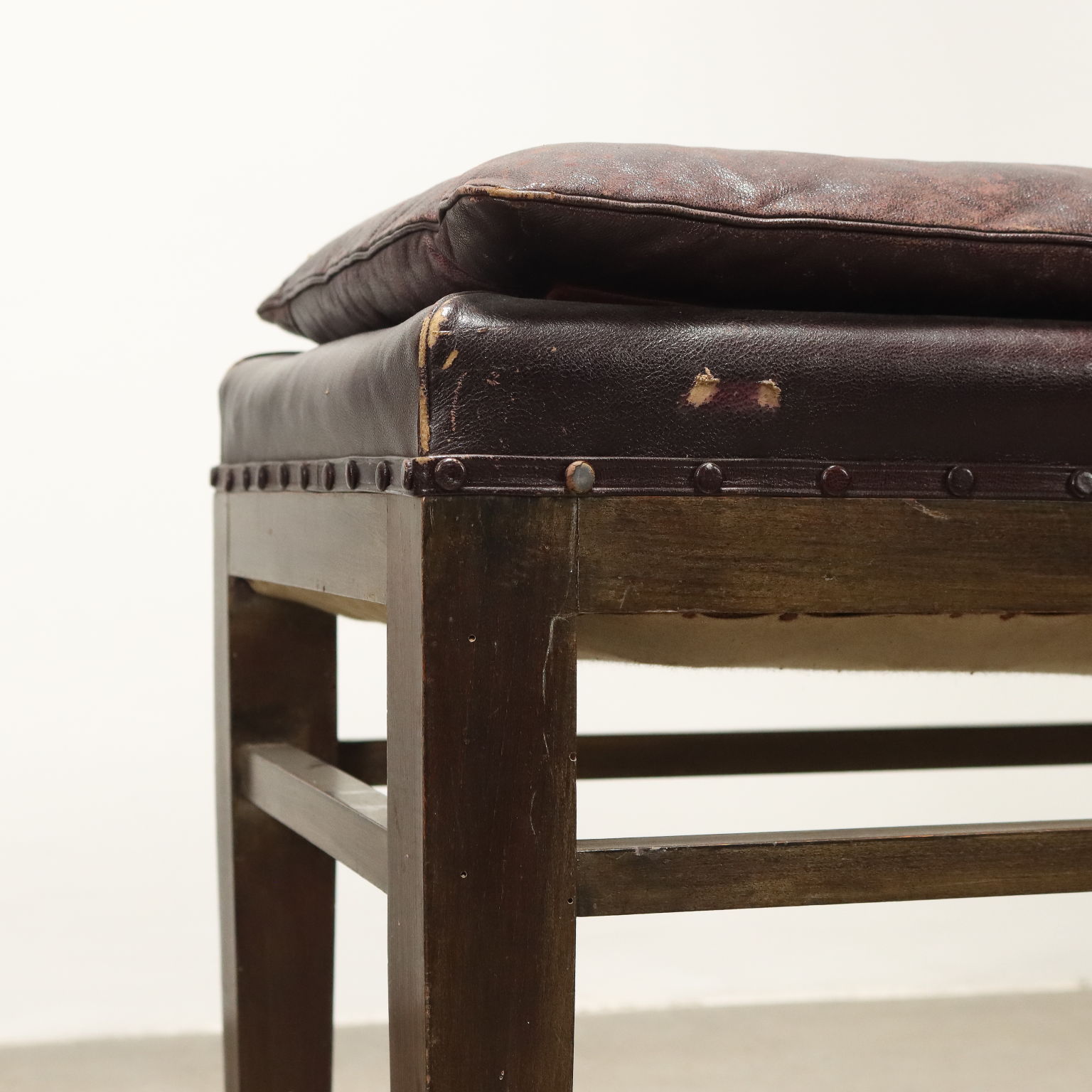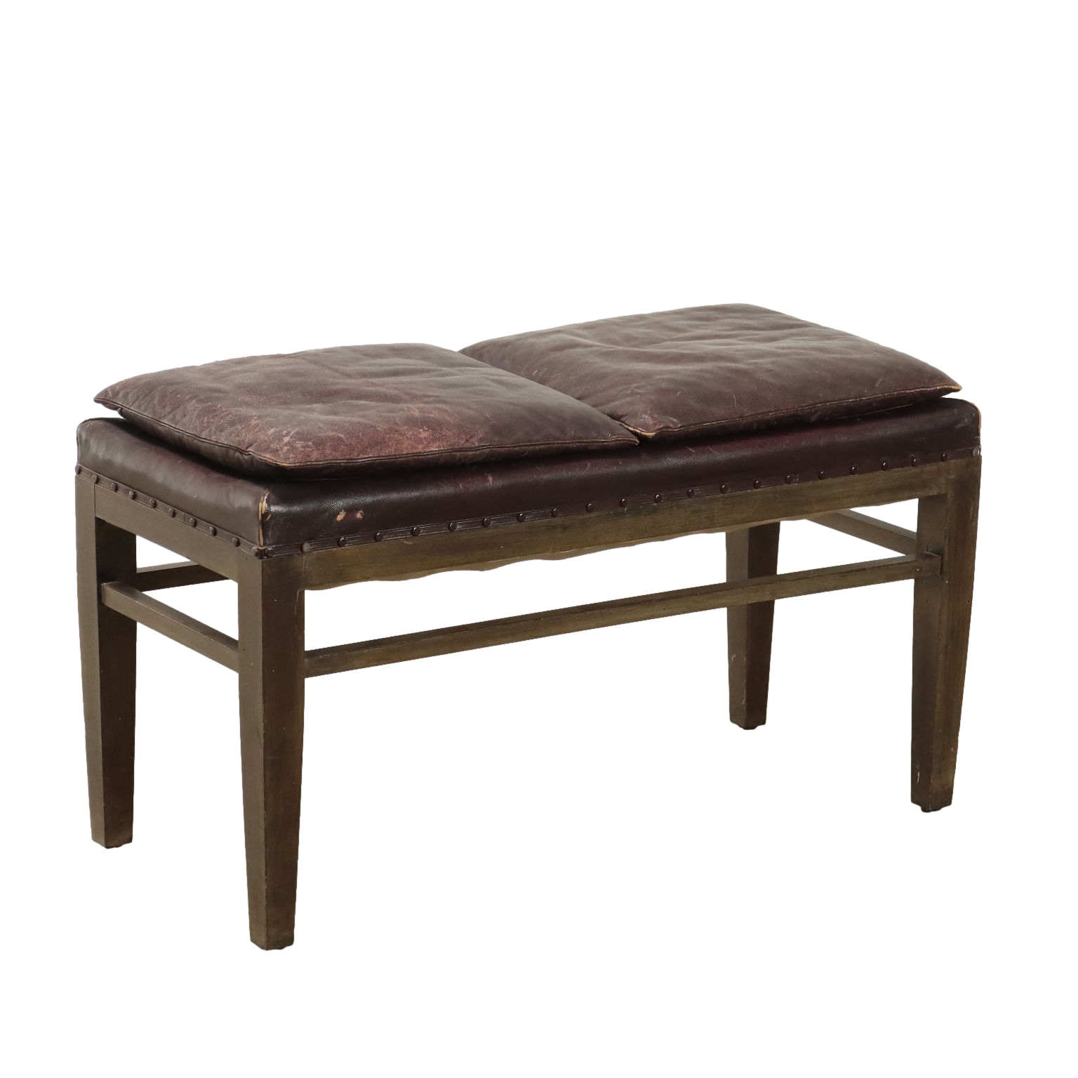 Panchetto, struttura in legno di faggio tinto, imbottitura e molle e cuscini in appoggio in espanso, rivestimento in similpelle.