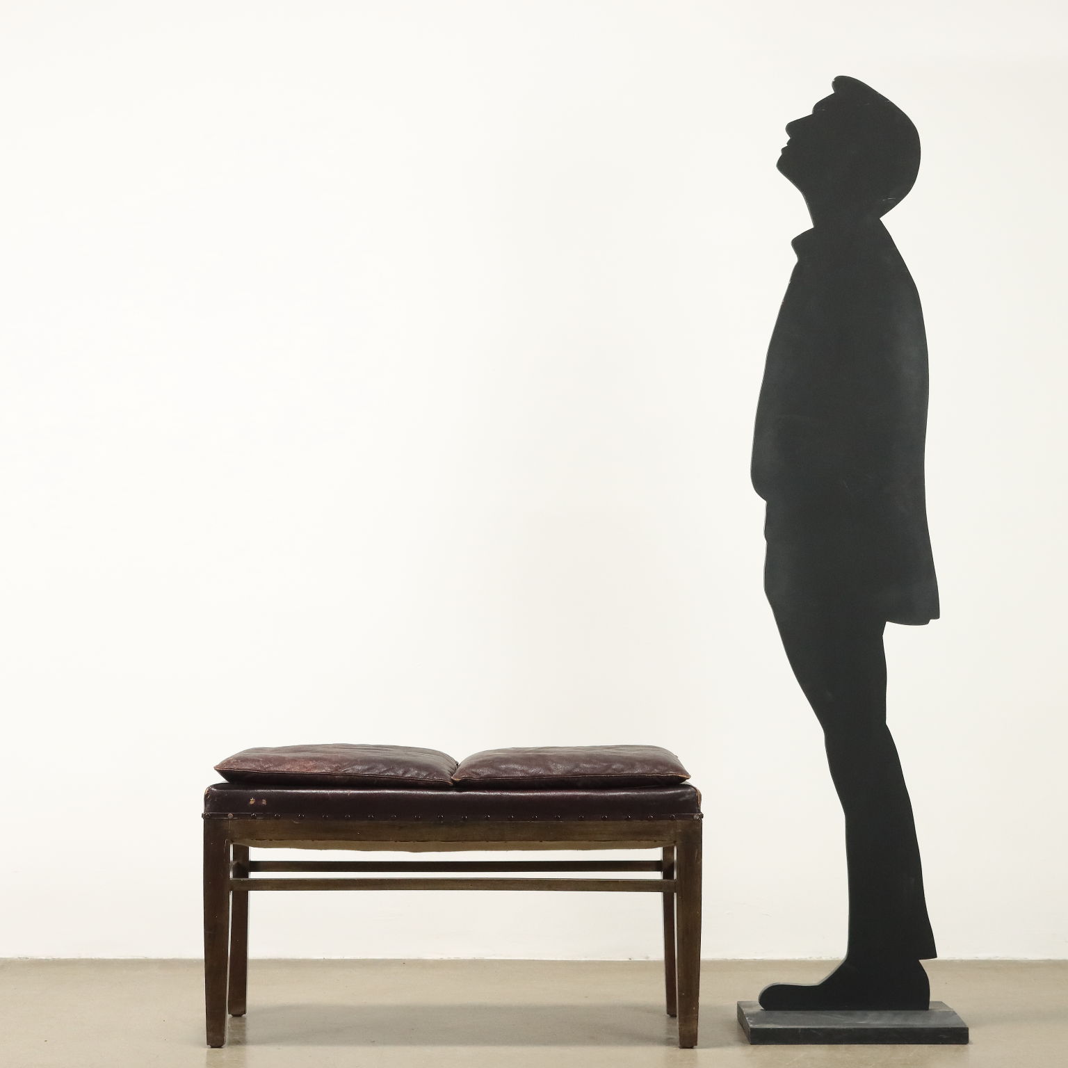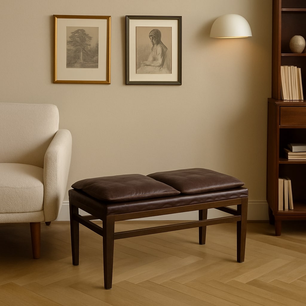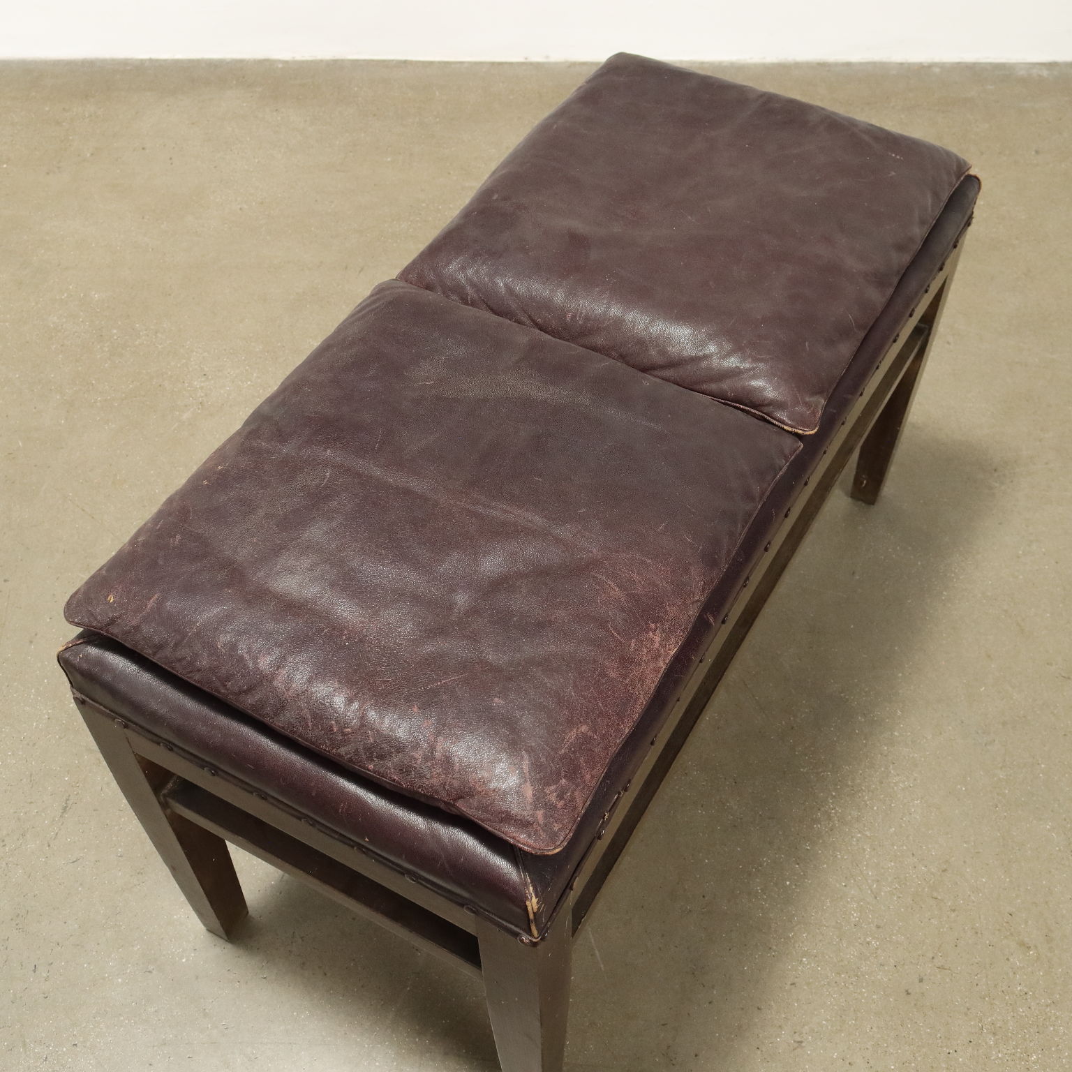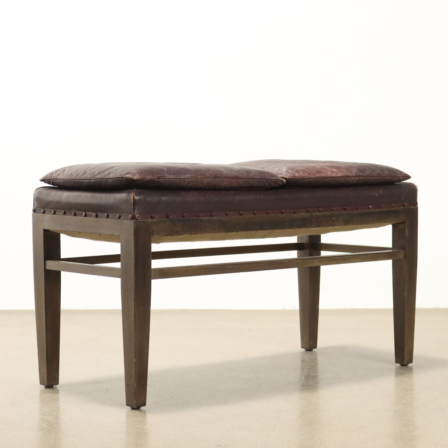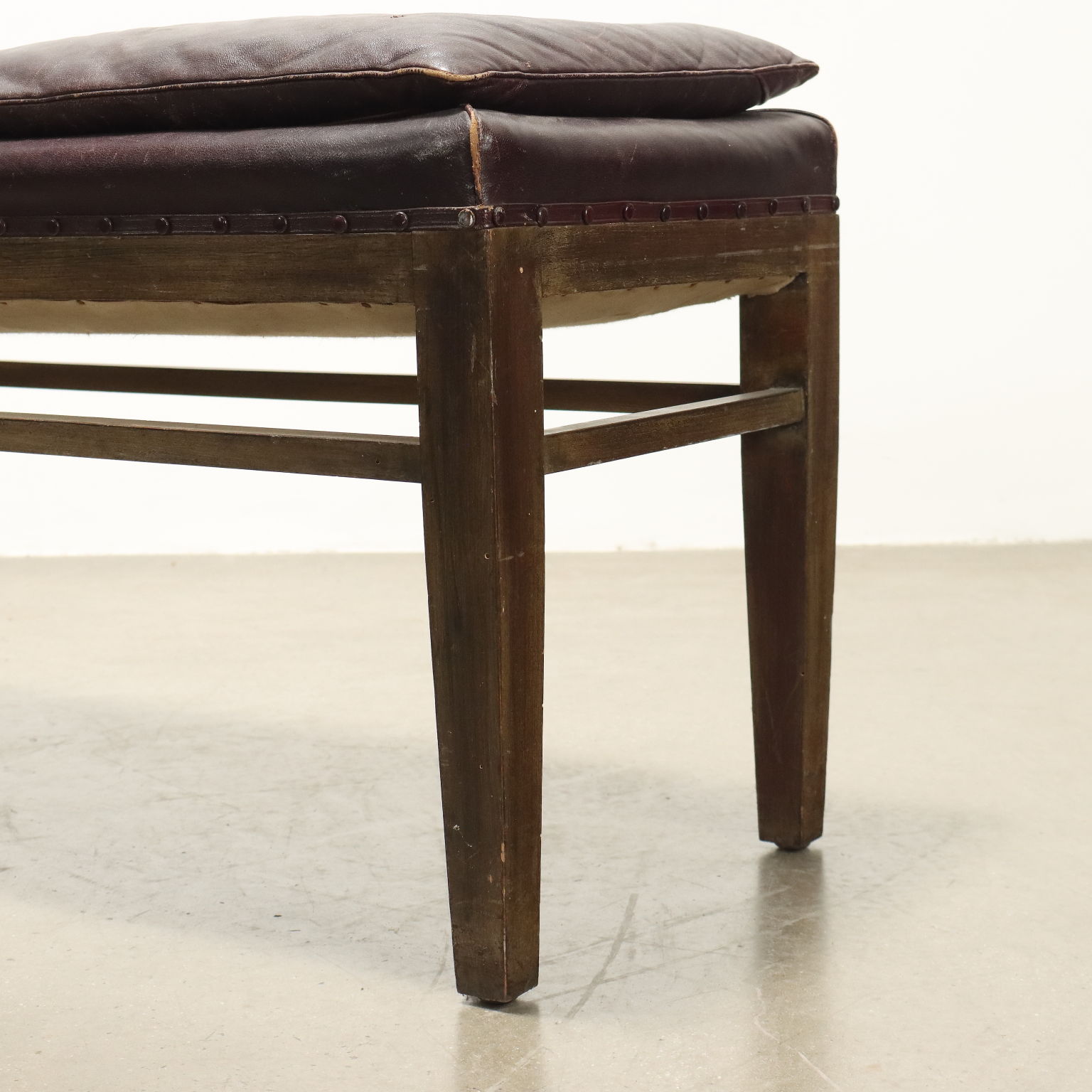 Panchetto, struttura in legno di faggio tinto, imbottitura e molle e cuscini in appoggio in espanso, rivestimento in similpelle.