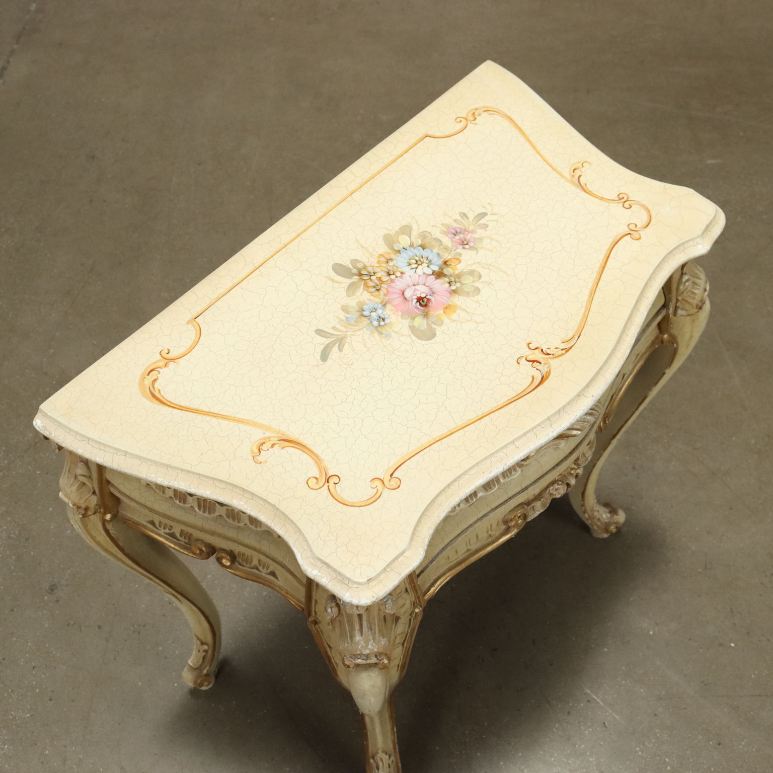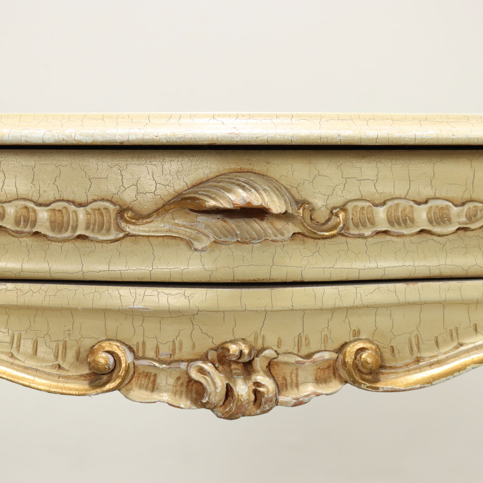 Coppia di comodini in stile Barocchetto Veneziano, faggio intagliato, laccato e dipinto. Cadute di materiale. Italia, XX Secolo.
