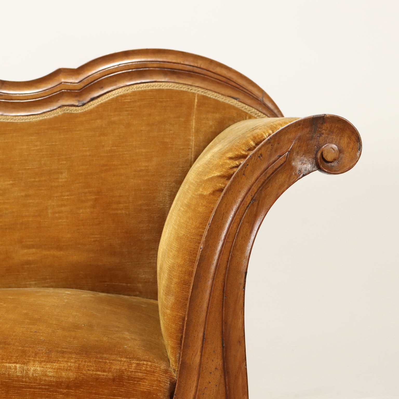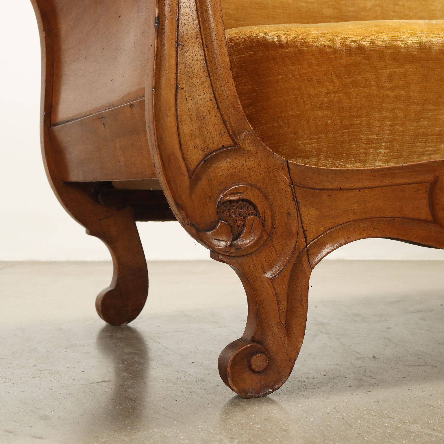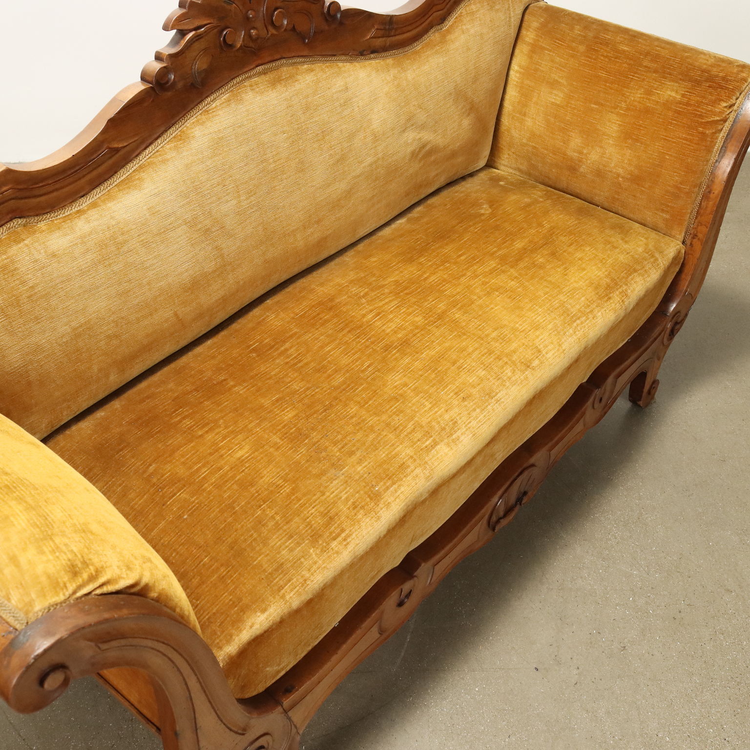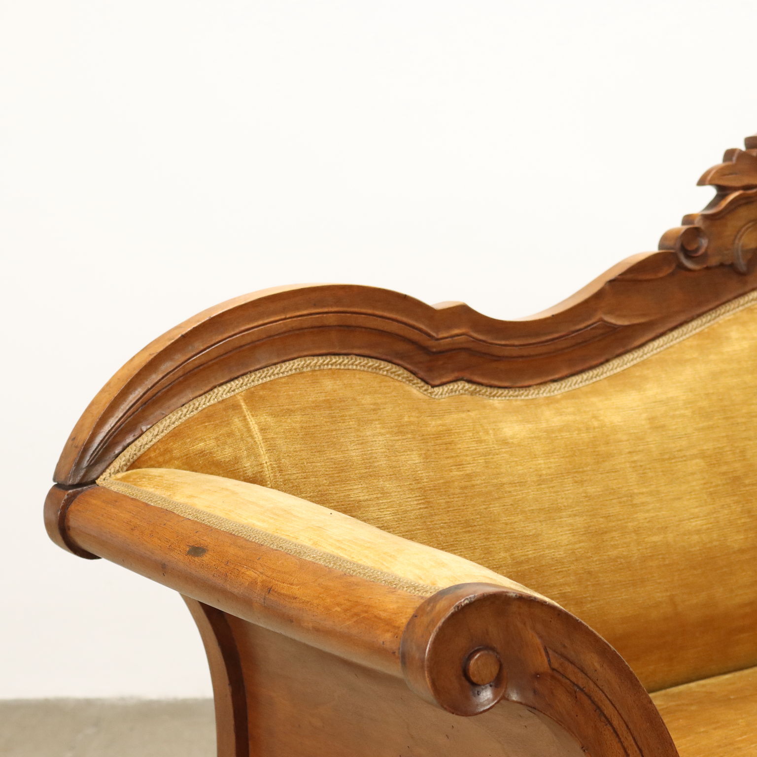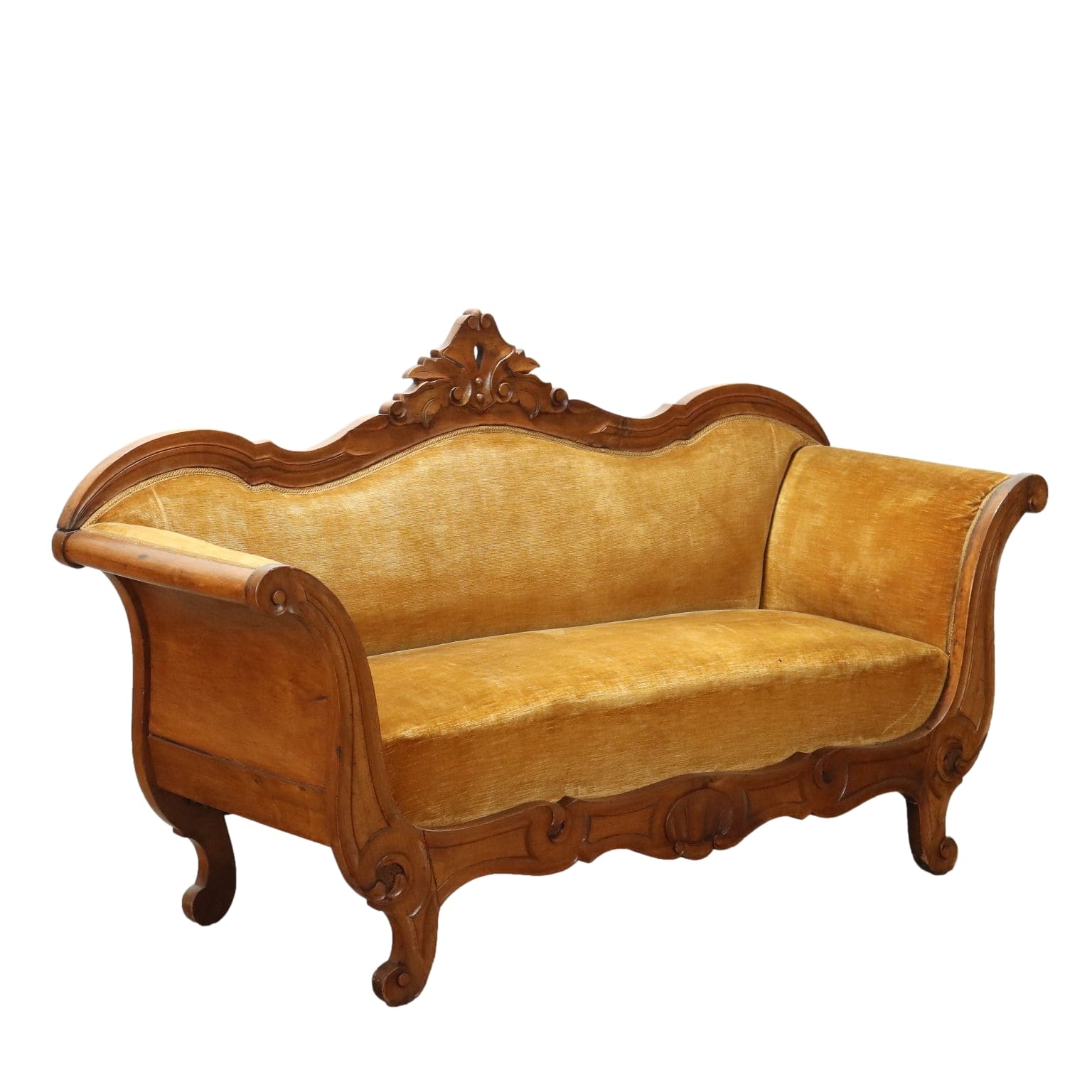 Divano Luigi Filippo in noce, intagli a volute e riccioli culminanti con cimasa a intagli fogliacei, schienale, braccioli e seduta imbottiti. Italia, metà XIX Secolo.