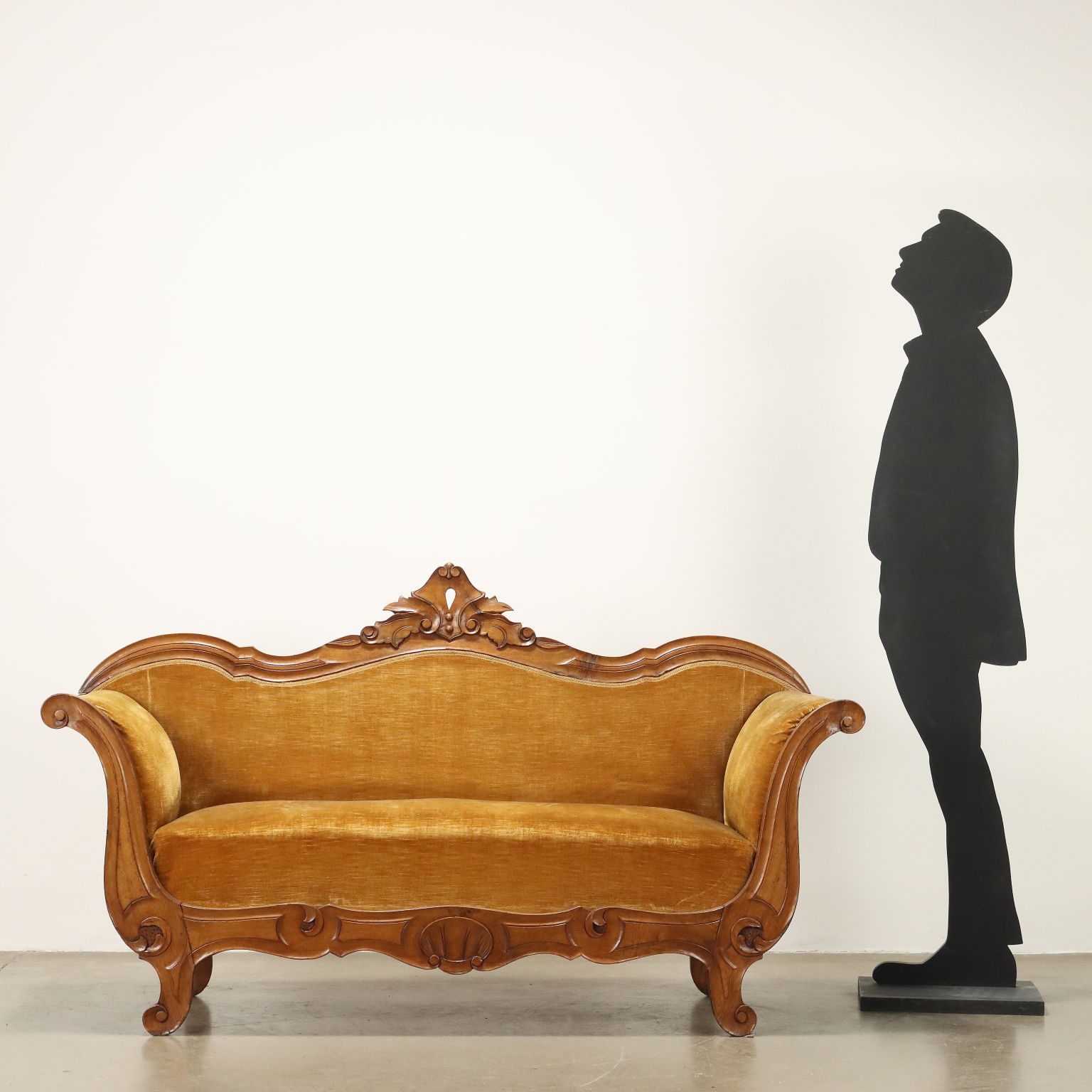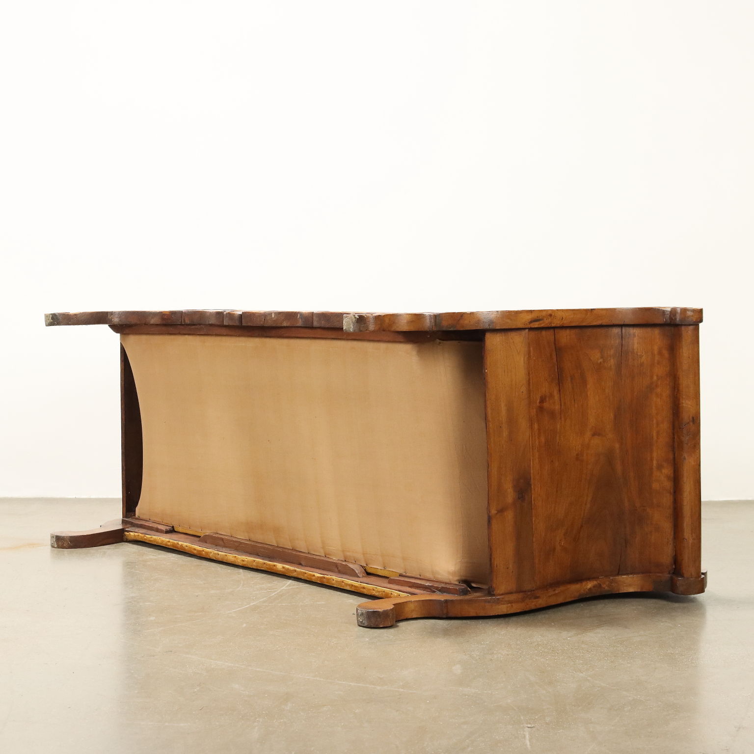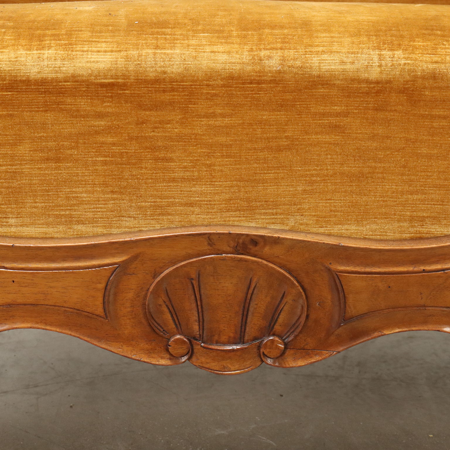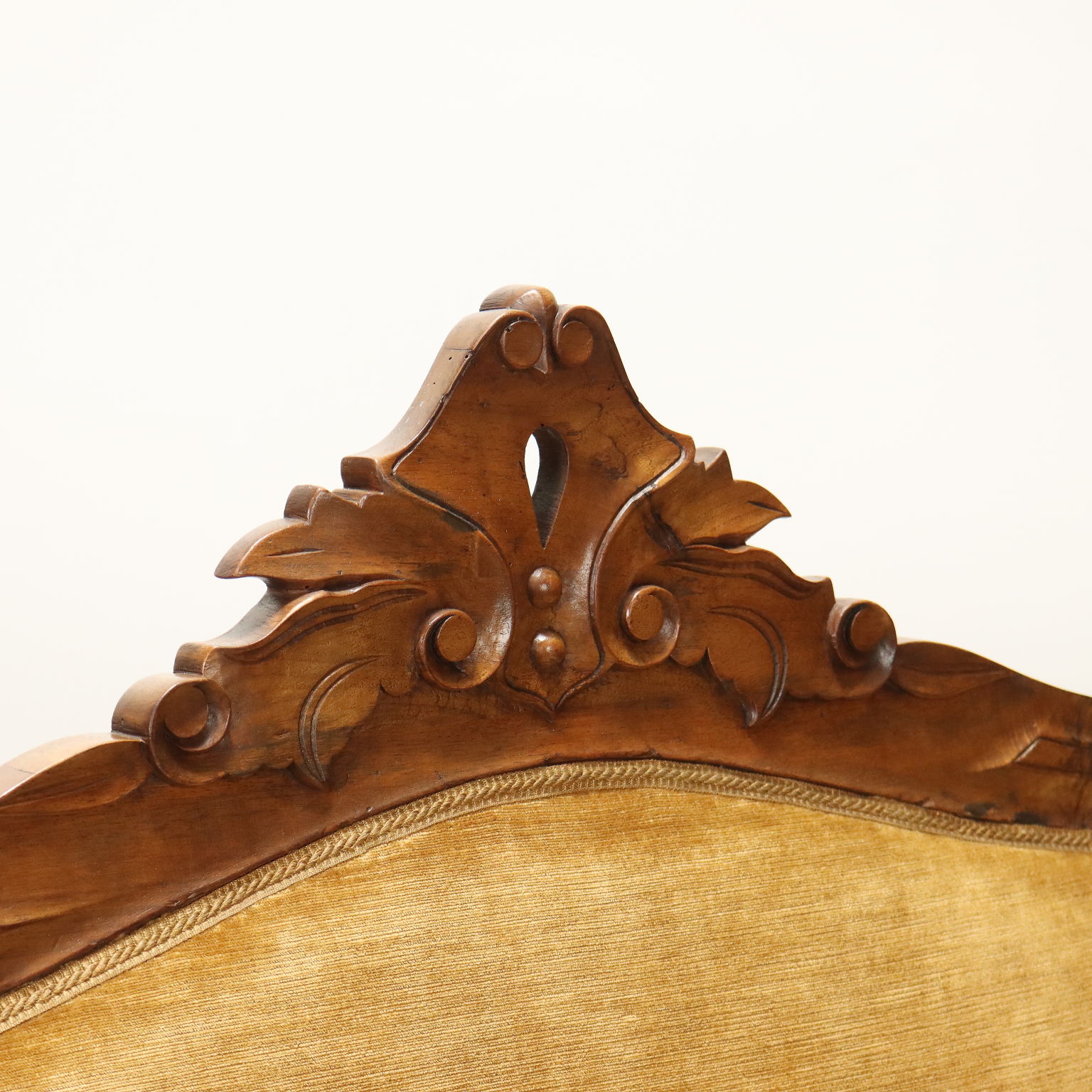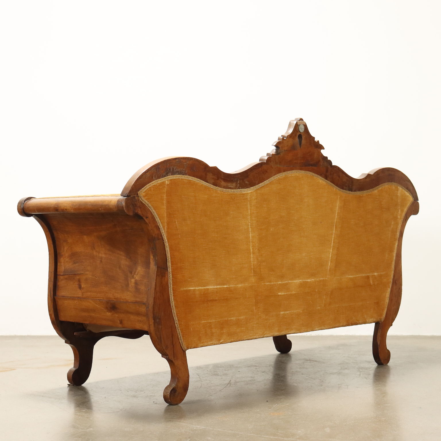 Divano Luigi Filippo in noce, intagli a volute e riccioli culminanti con cimasa a intagli fogliacei, schienale, braccioli e seduta imbottiti. Italia, metà XIX Secolo.
