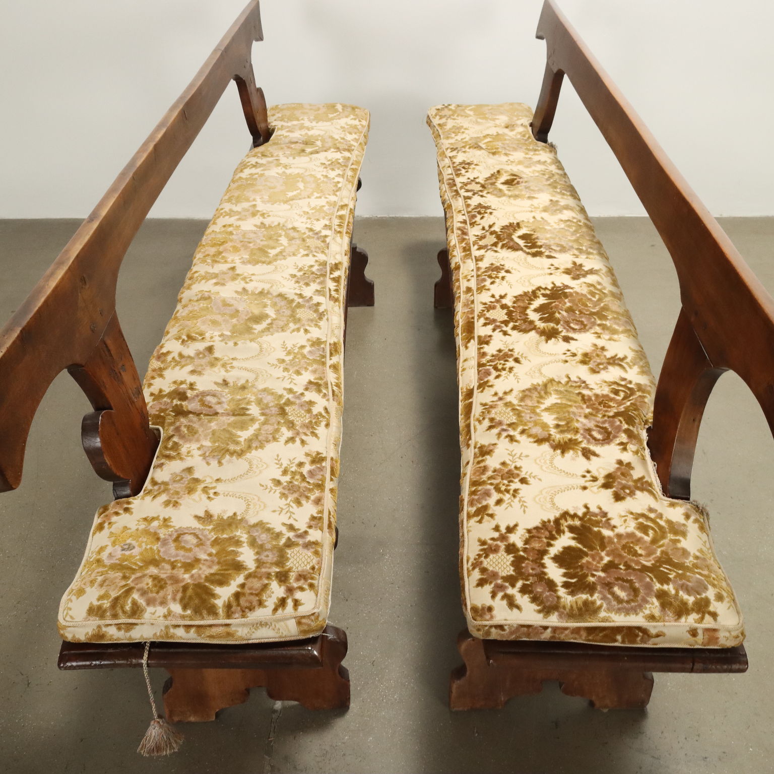 Coppia di panche in noce, schienale a giorno, seduta sorretta da gambe a doppia mensola unite da traverse. Modifiche. Cuscini damascati. Italia, XVIII Secolo.