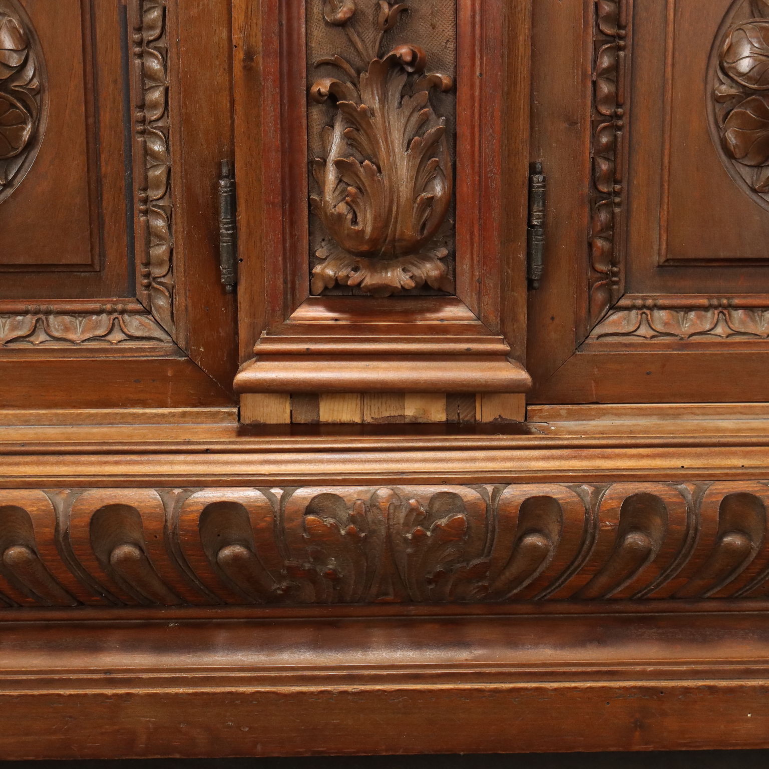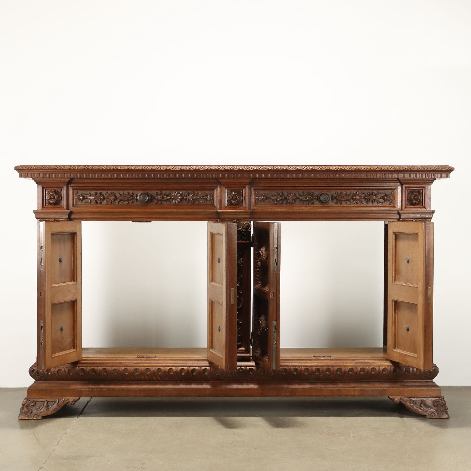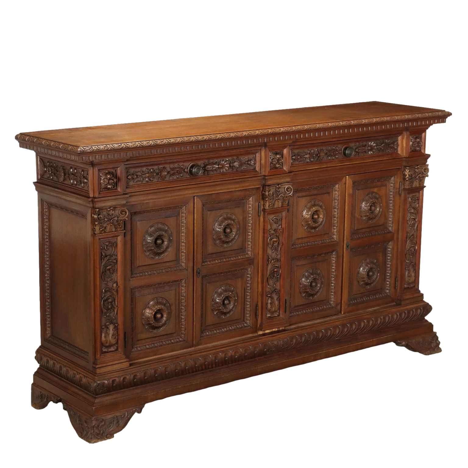 Credenza in stile Barocco in noce riccamente intagliata a motivi fogliacei, fiori e riccioli. Fronte a quattro ante pannellate con rosone centrale, sormontate da coppia di cassetti nella fascia sotto piano. Piedi a mensola. Interni in rovere, schienale mancante. Italia, fine XIX Secolo.