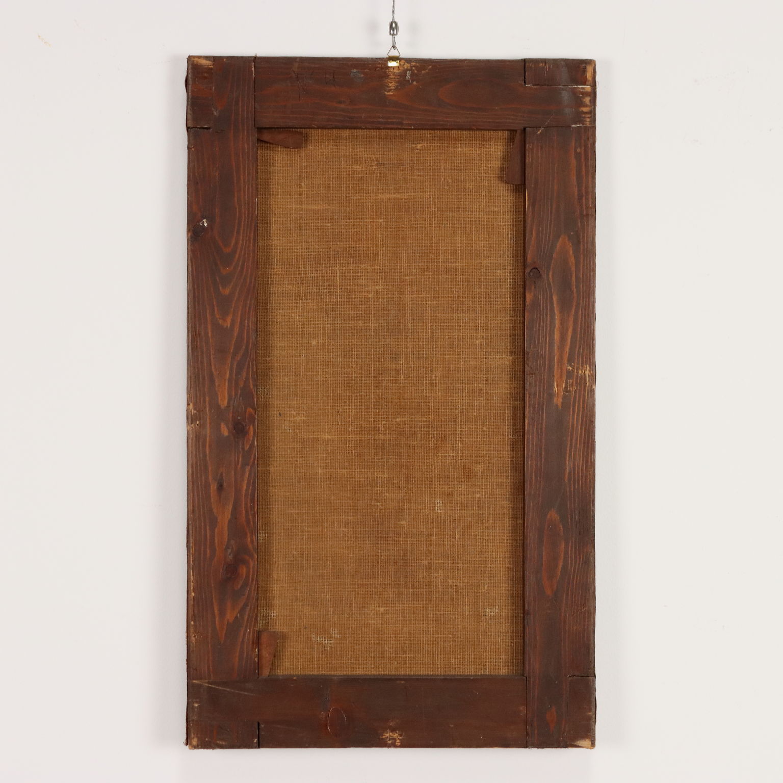 Olio su tela. Frammento di dipinto più grande, l' opera inquadra lo scorcio di una campagna innevata, su pendici montuose sotto cime aguzze; sul sentiero in prossimità di alcuni casolari dal tetto spiovente, transitano due figure di viandanti, con cane al seguito. Il dipinto risulta restaurato e ritelato.
