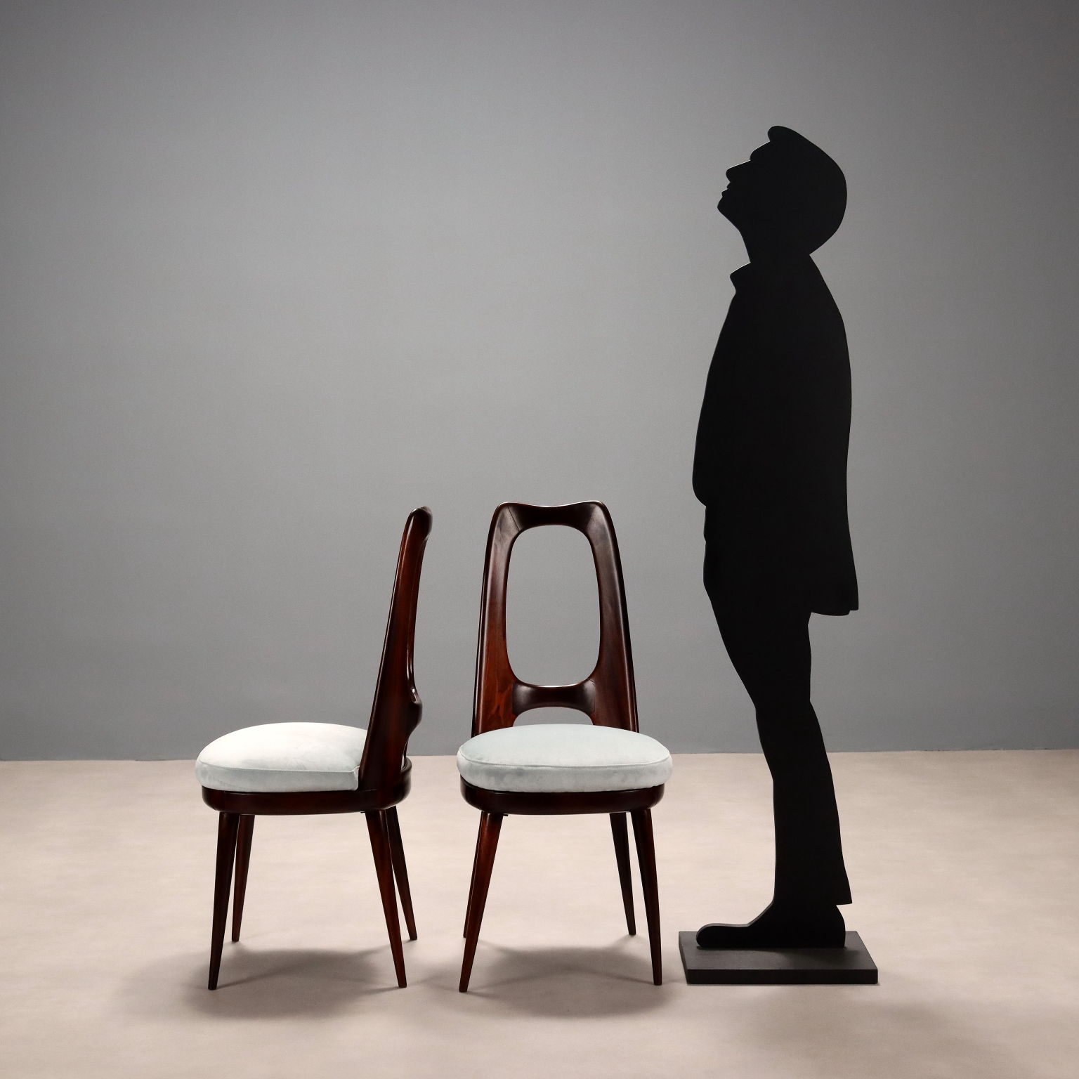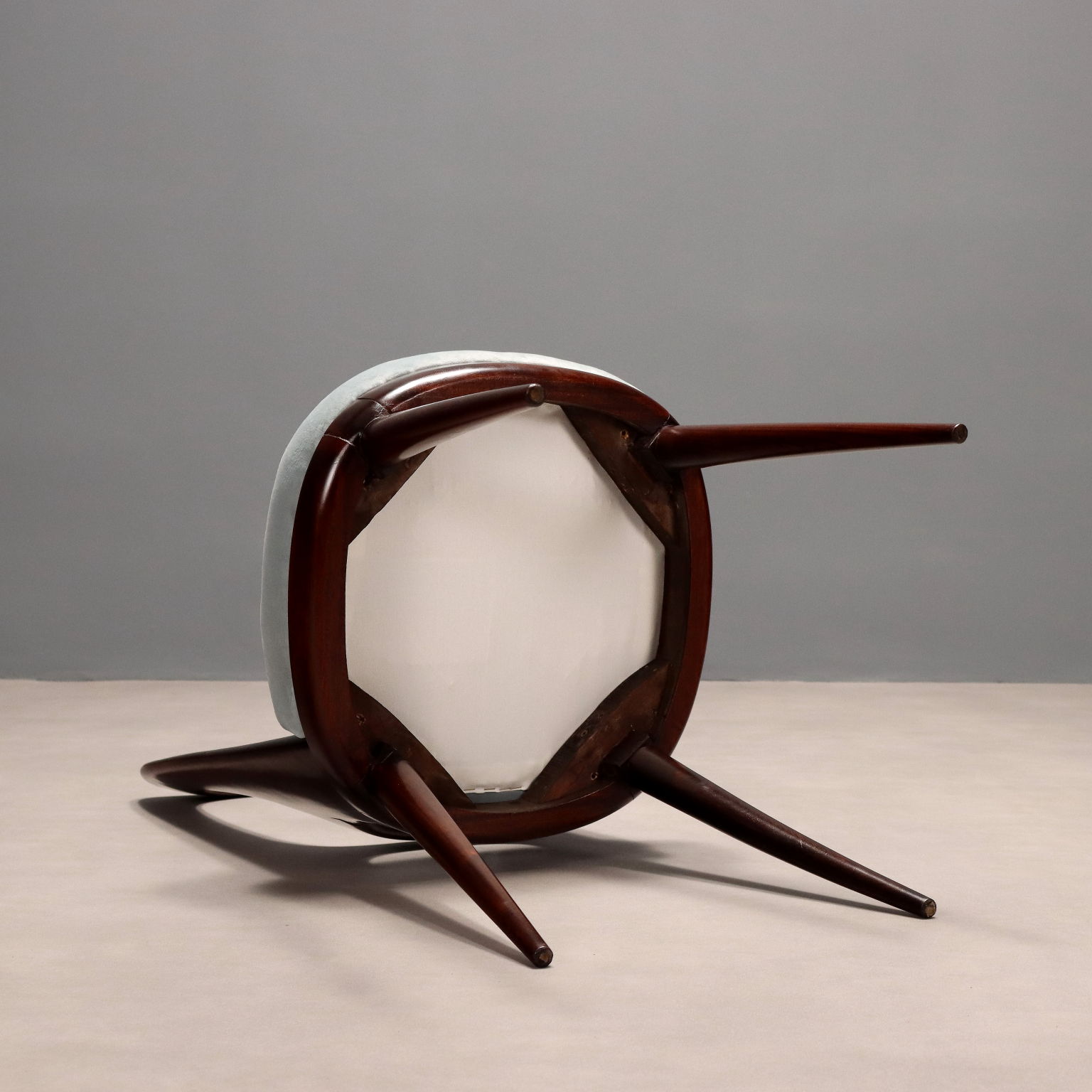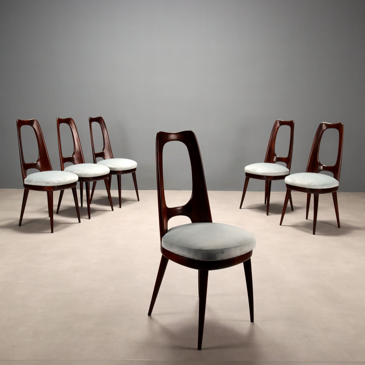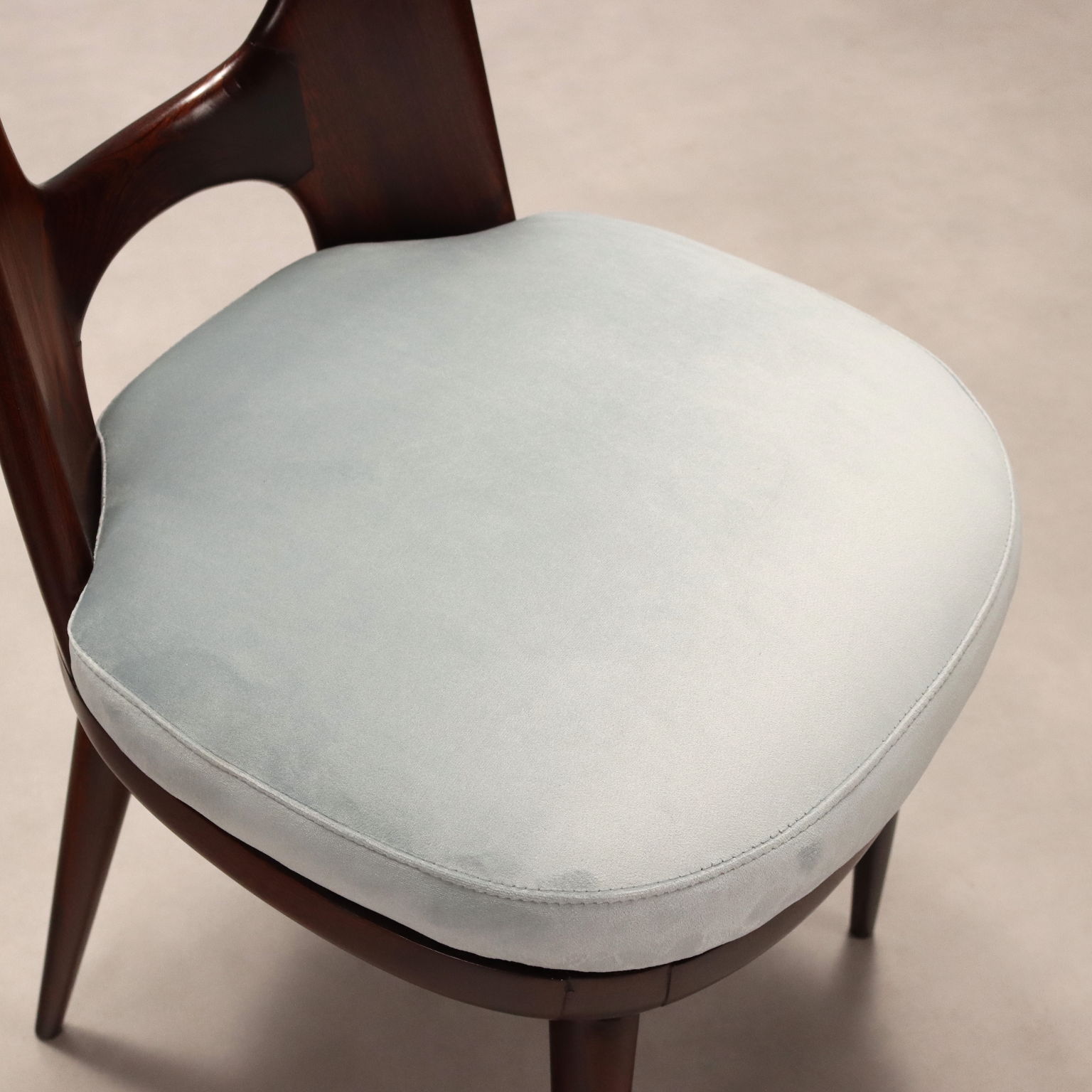 Set di sedie vintage di manifattura italiana con elegante struttura a vista in legno di mogano tinto, seduta rinnovata con imbottitura a molle e rivestimento in velluto nei toni dell'azzurro. In condizioni molto buone.