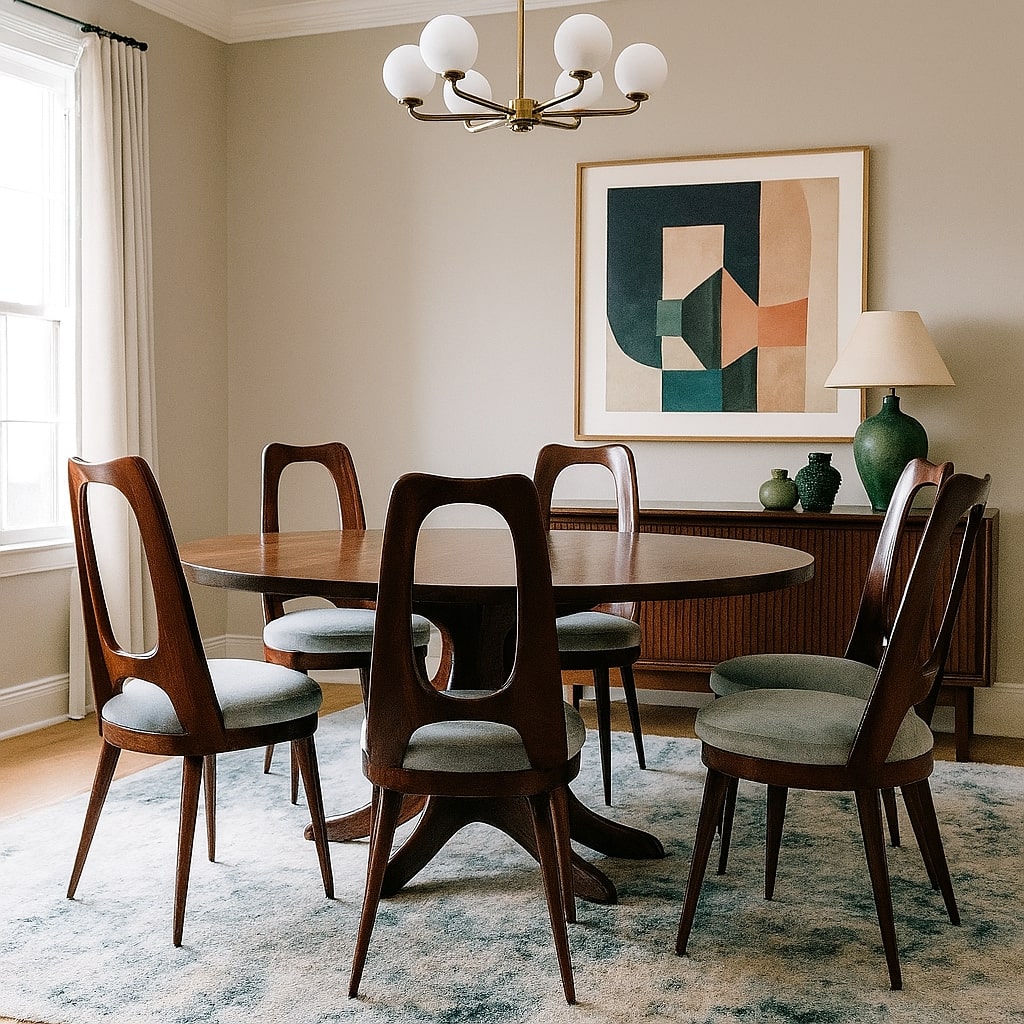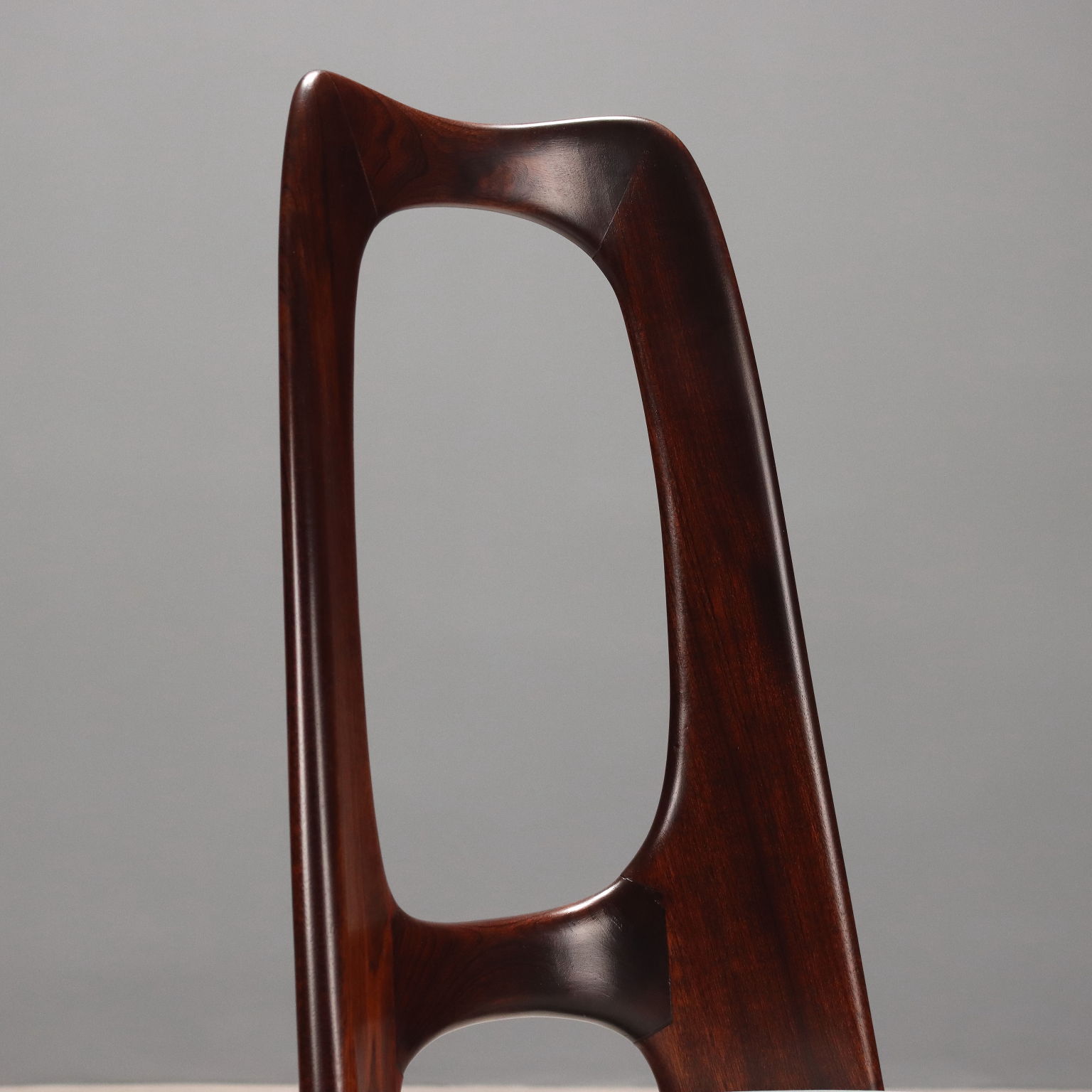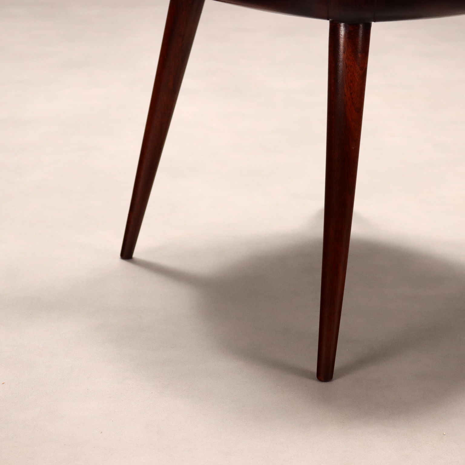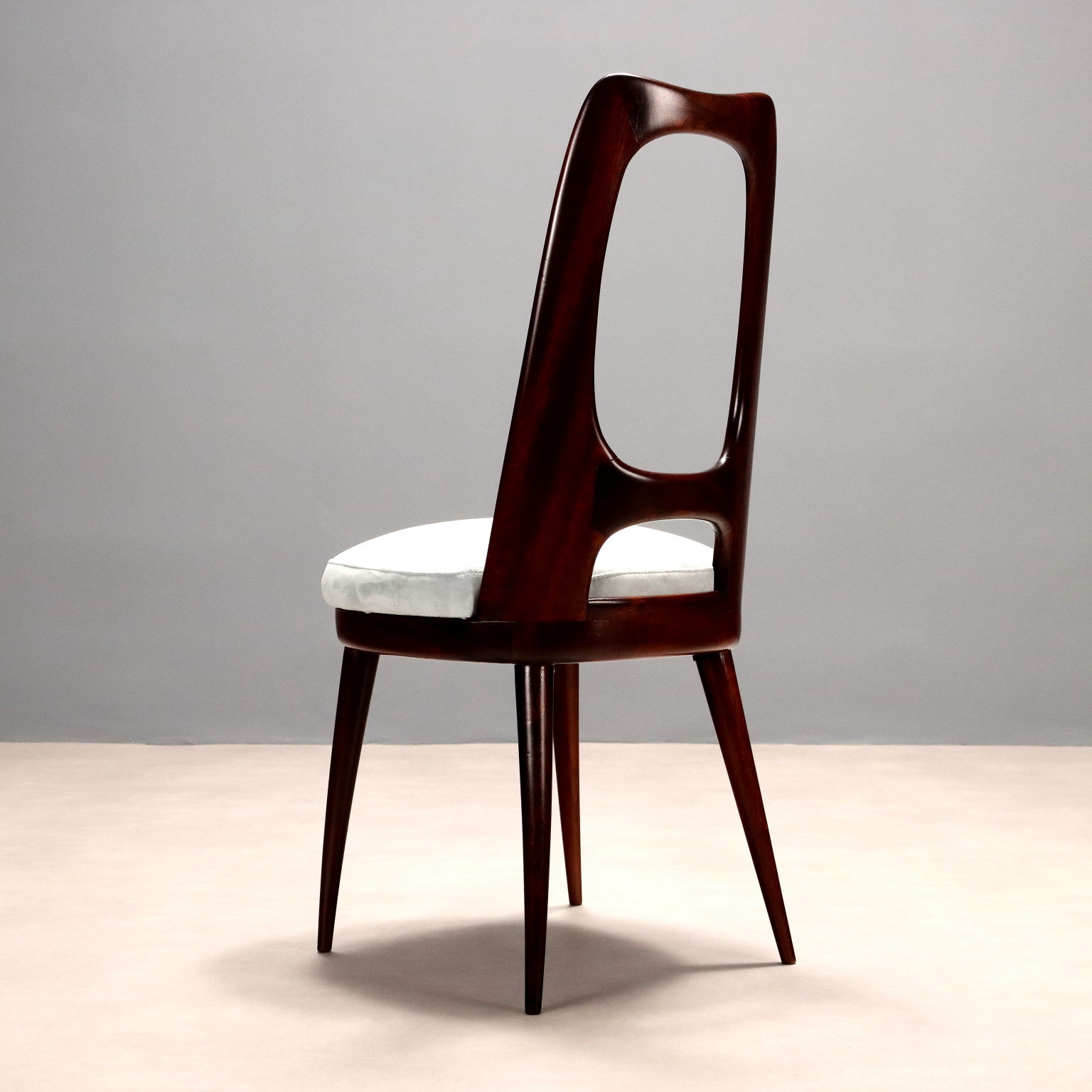 Set di sedie vintage di manifattura italiana con elegante struttura a vista in legno di mogano tinto, seduta rinnovata con imbottitura a molle e rivestimento in velluto nei toni dell'azzurro. In condizioni molto buone.