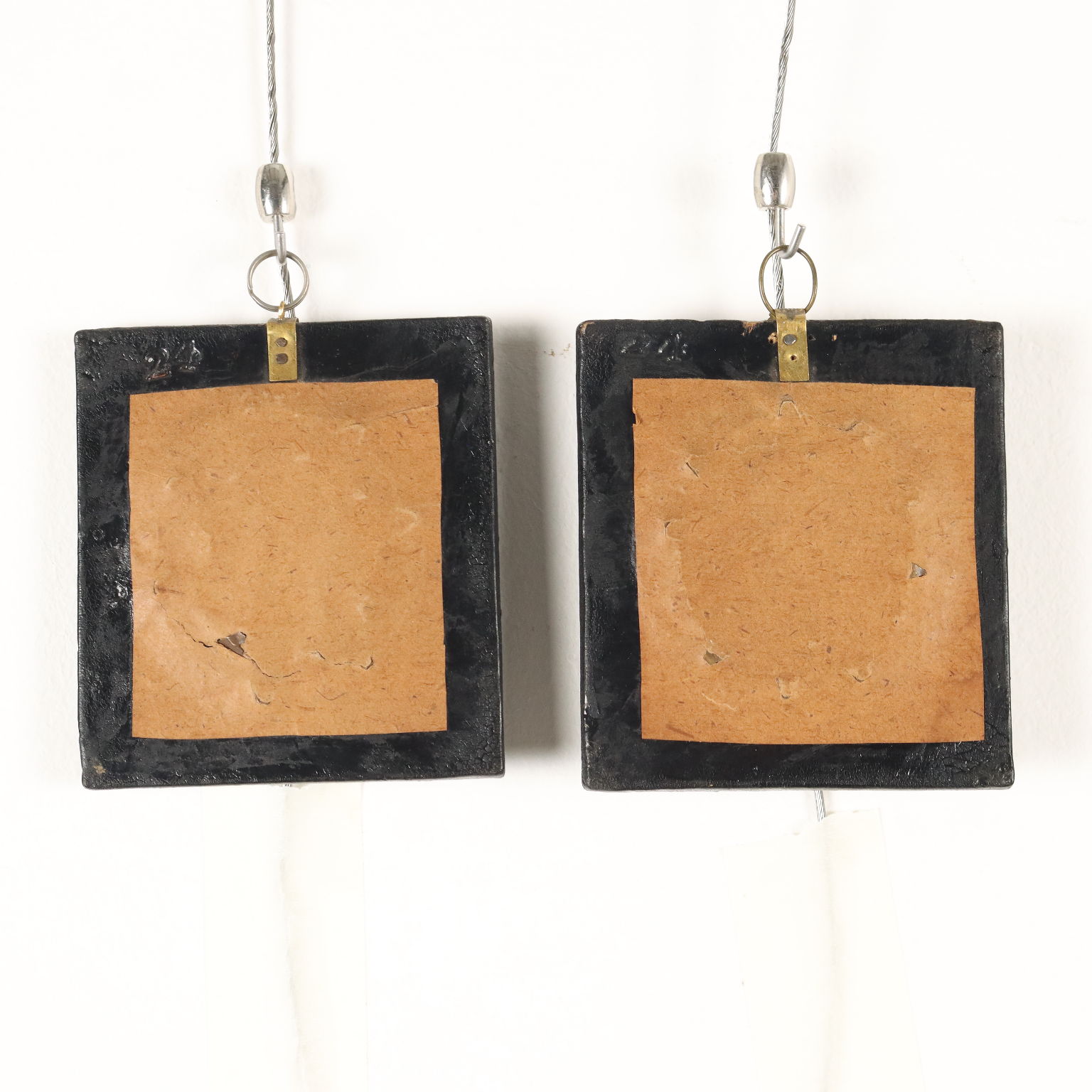 Olio su placche di metallo. Le miniature propongono due ritratti di Augusta di Baviera (1788 -1851), duchessa di Leuchtenberg e vice regina d'Italia come consorte del viceré Eugenio di Beauharnais, figliastro di Napoleone Bonaparte; benché Milano fosse la capitale del regno, la coppia amava risiedere nella Villa Reale di Monza, presso la quale si ritrovano diversi spazi dedicati alla regina. I ritratti sono presentati in cornici in legno ebanizzato con profilatura in metallo dorato.