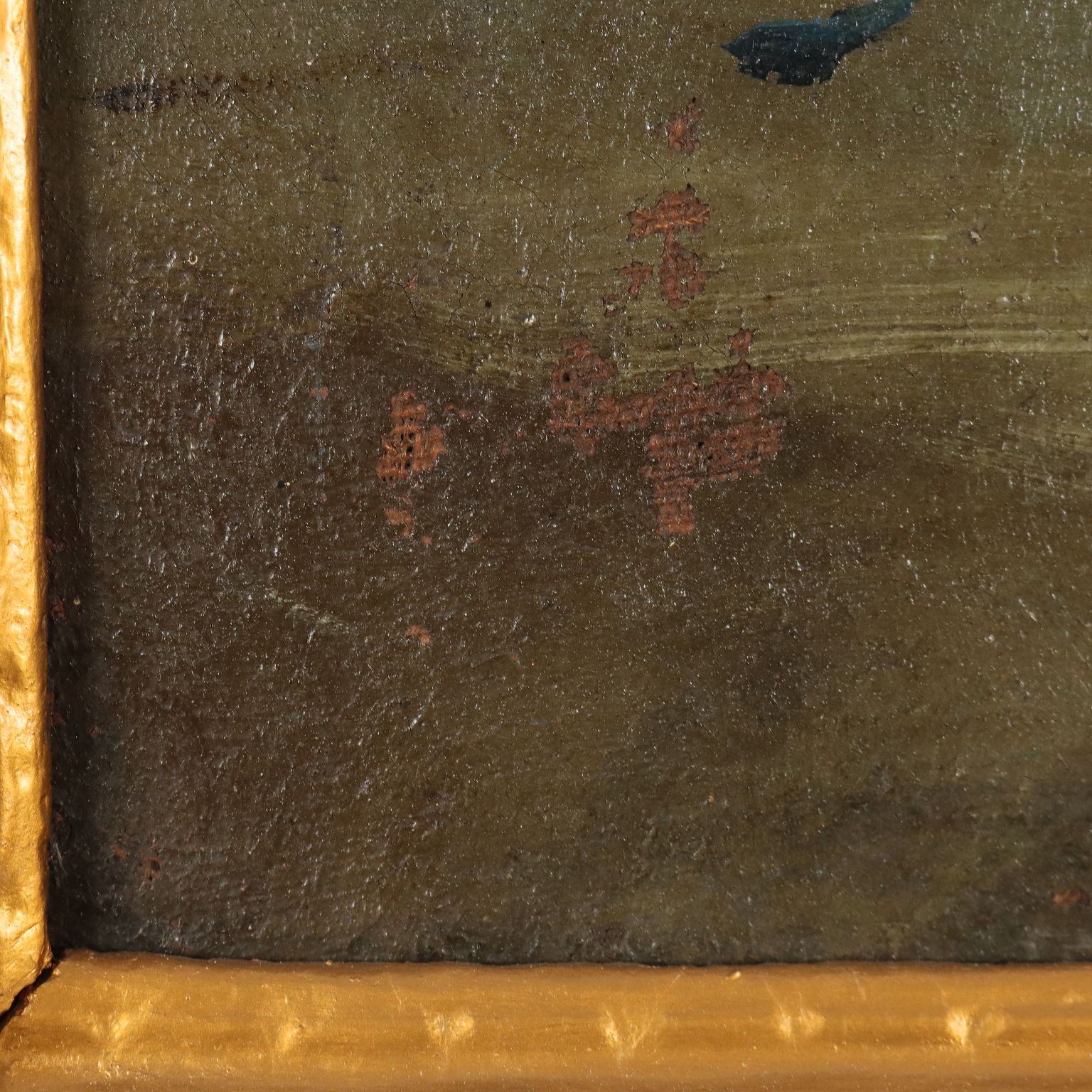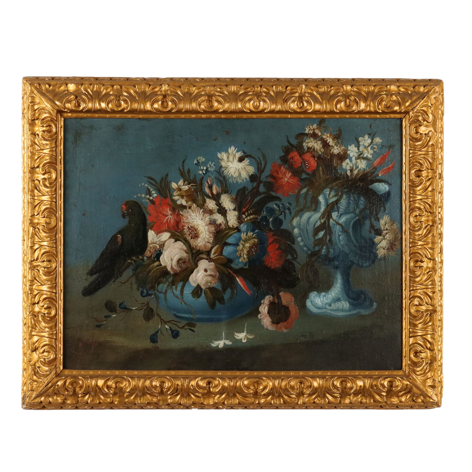 Olio su tela. Vivace composizione naturalistica di fiori multicolori in vasi di ceramica azzurra, che richiamano il color cielo dello parte superiore dello sfondo, il quale sfuma poi nella parte inferiore in un colore terroso; sulla sinistra spicca per l' inconsueto colore scuro un pappagallino. Il dipinto presenta lievi cadute di colore, diffuse soprattutto nello sfondo. È presentato in cornice coeva ridorata.