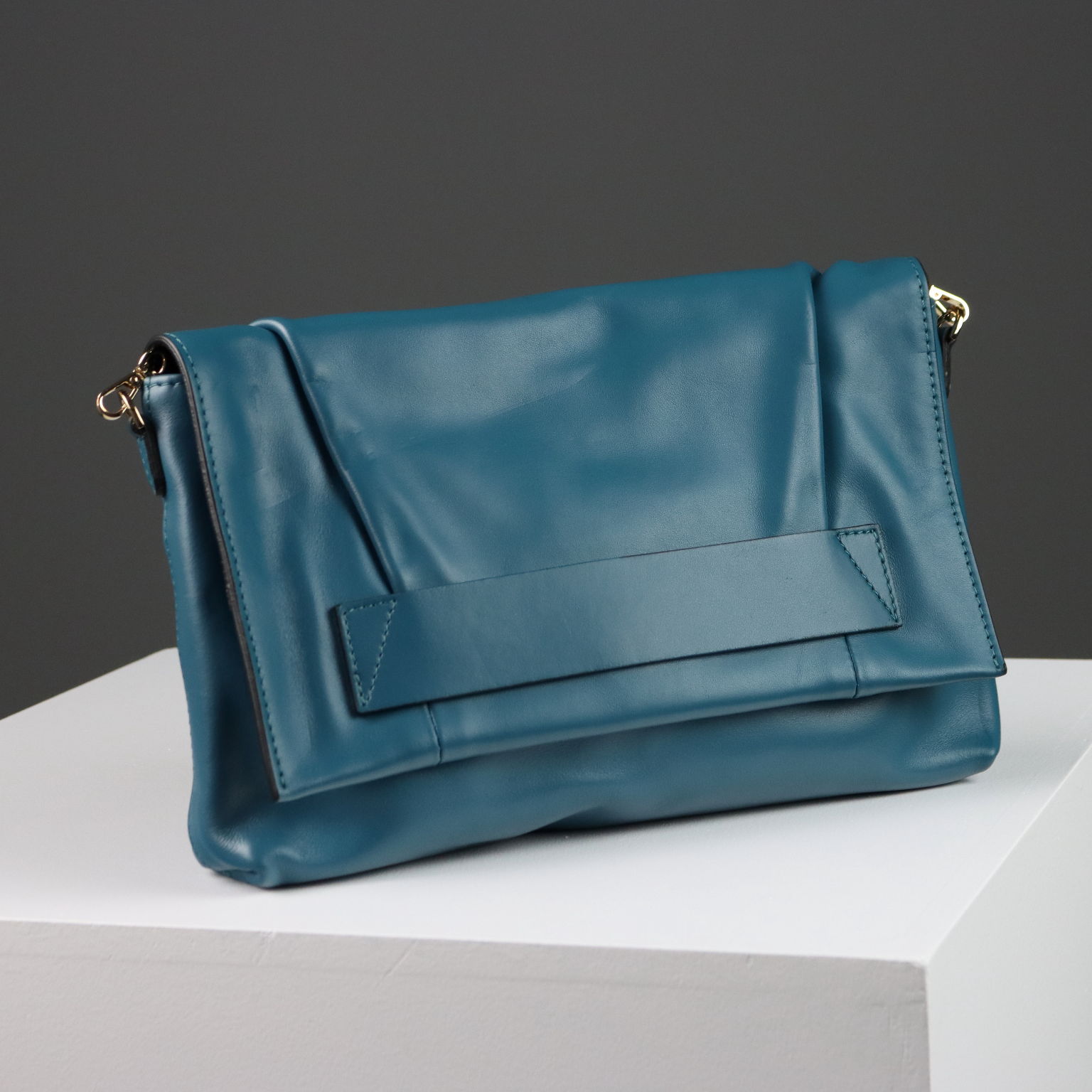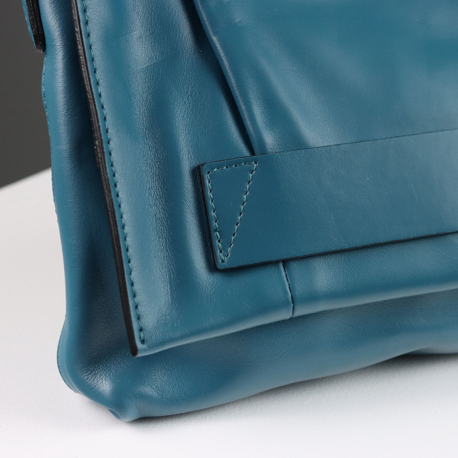 Pochette in pelle tonalità ottanio, con patta a chiusura calamitata. Presenta una tracolla in pelle e catenella removibile. L'articolo può quindi essere portato a tracolla o a mano, grazie all'apposita fascia applicata sul fronte. All'interno presenta una tasca con cerniera e due tasche più piccole. Presenta lievissimi segni sul pellame, dati dalla conservazione.