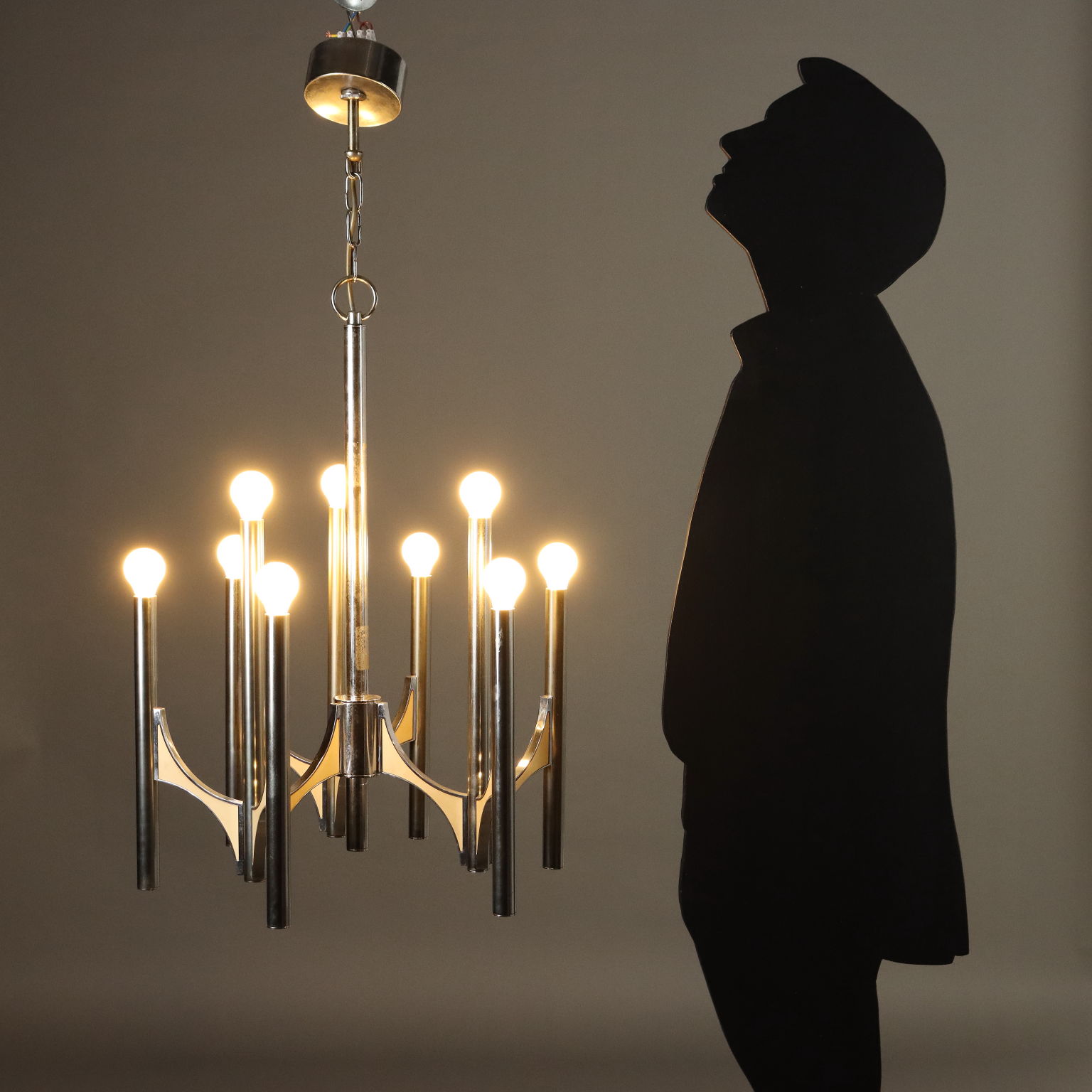 Lampadario a 9 punti luce, alluminio e ottone cromati, inserti in metallo smaltato.