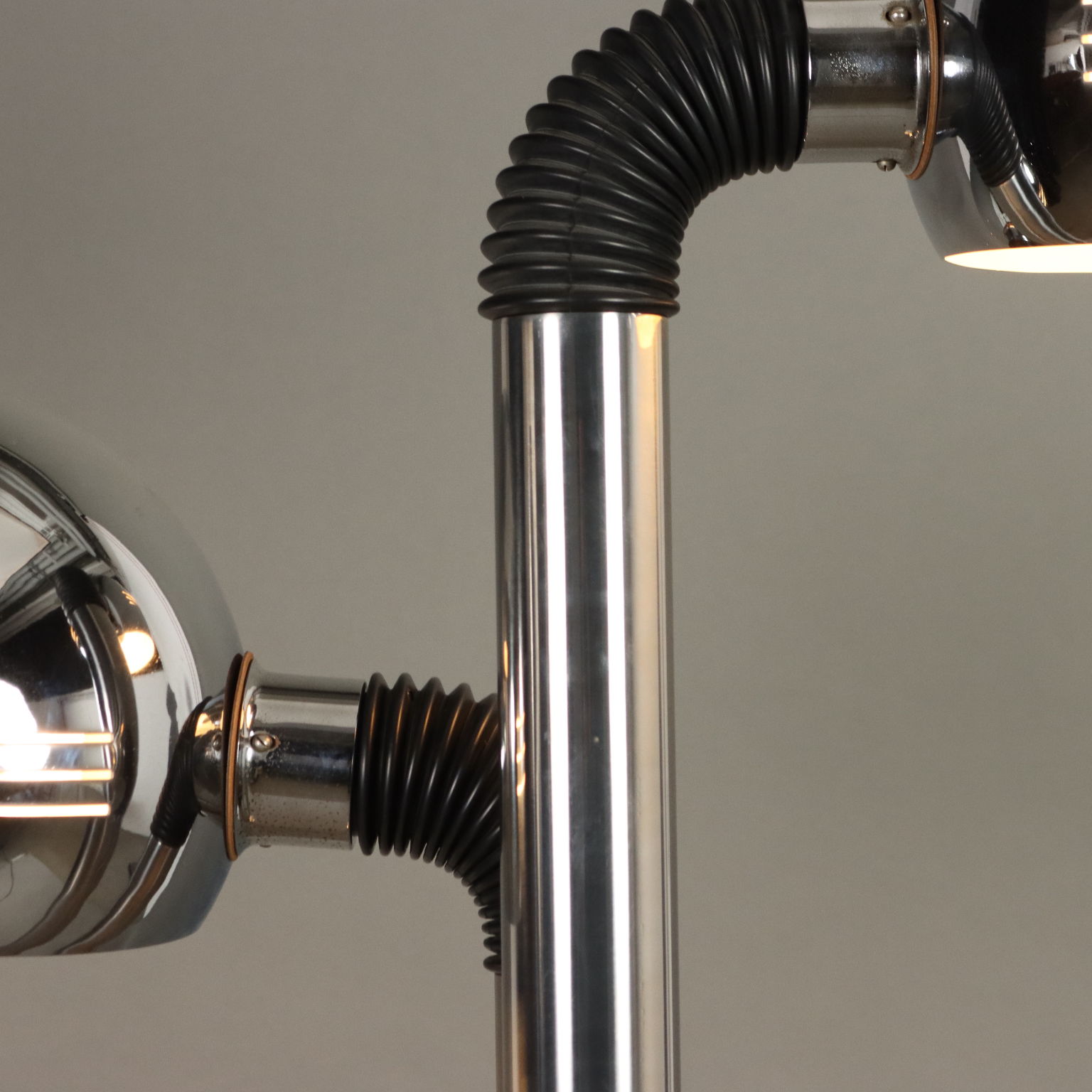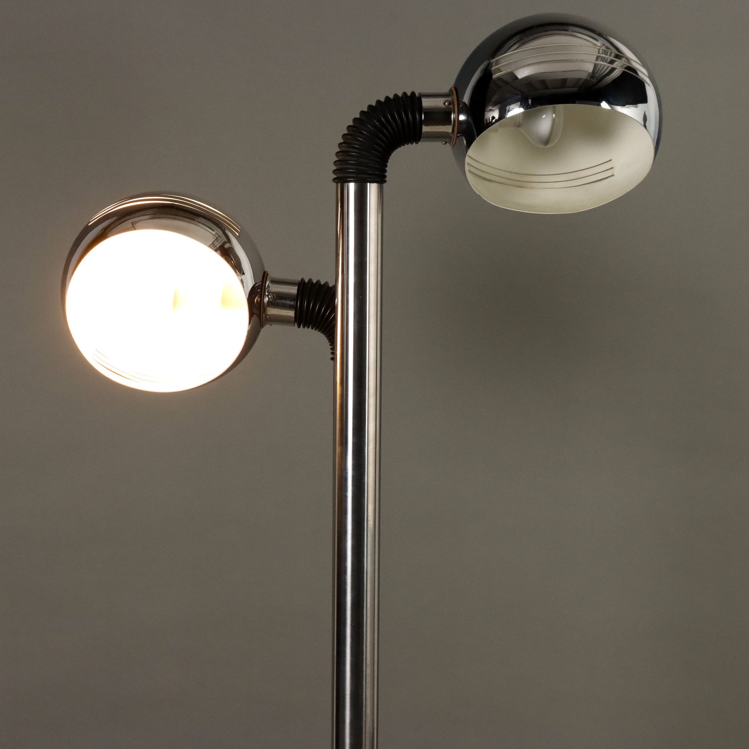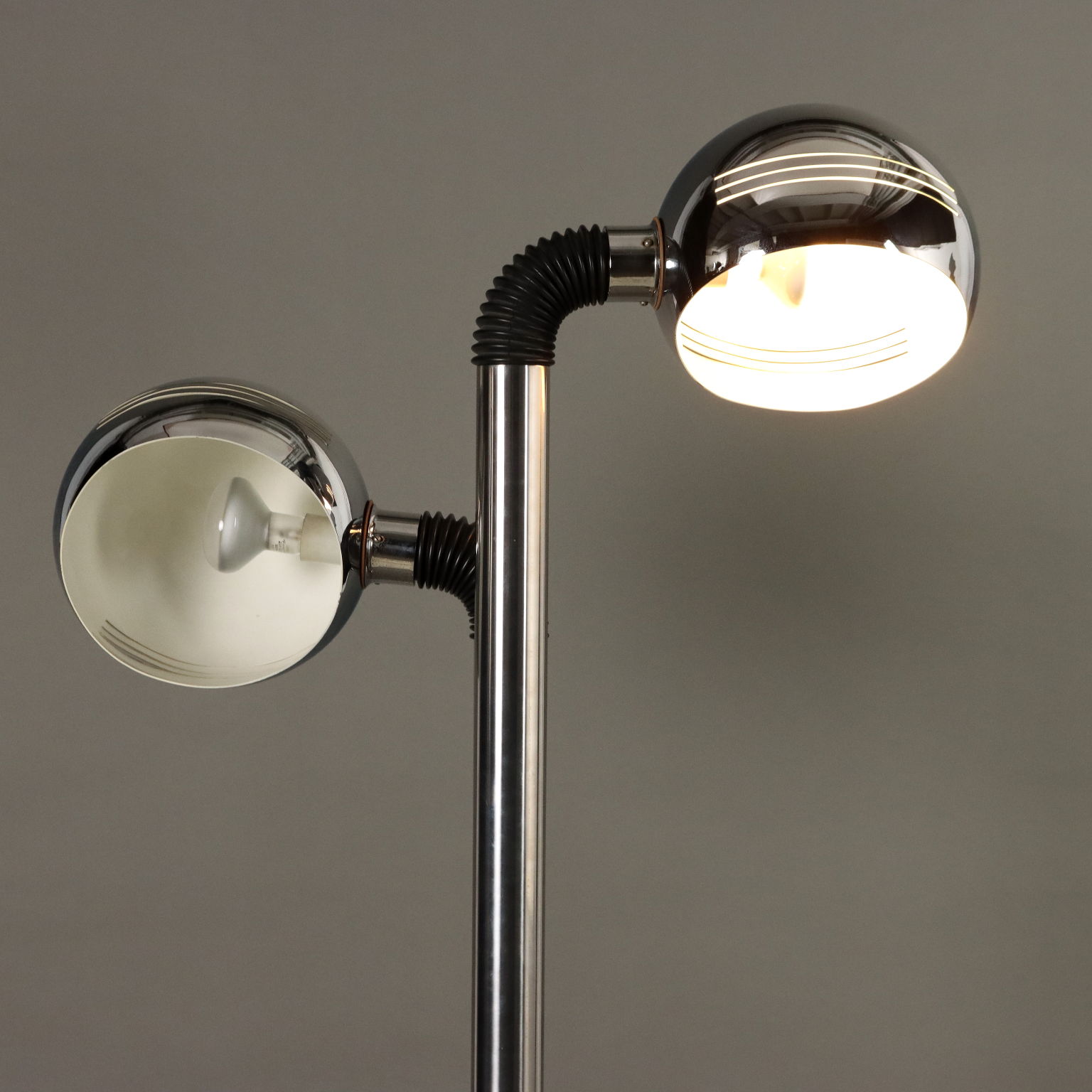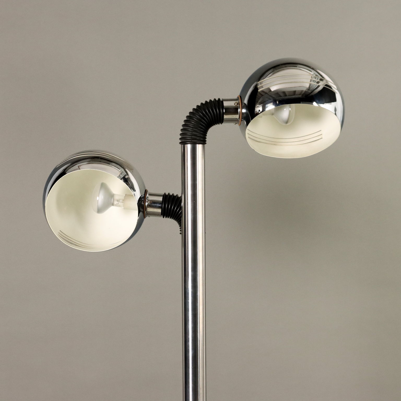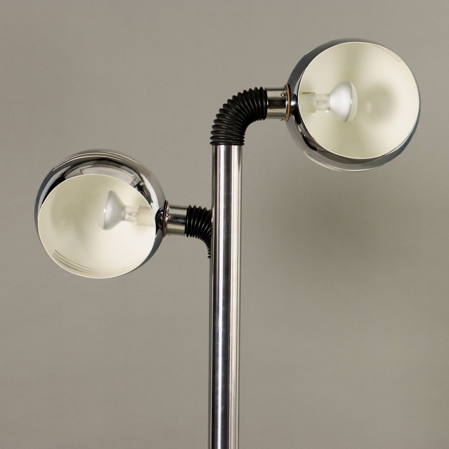 Lampada da terra con 2 punti luce ad inclinazione regolabile e calotta orientabile, base in metallo cromato, struttura in alluminio cromato.