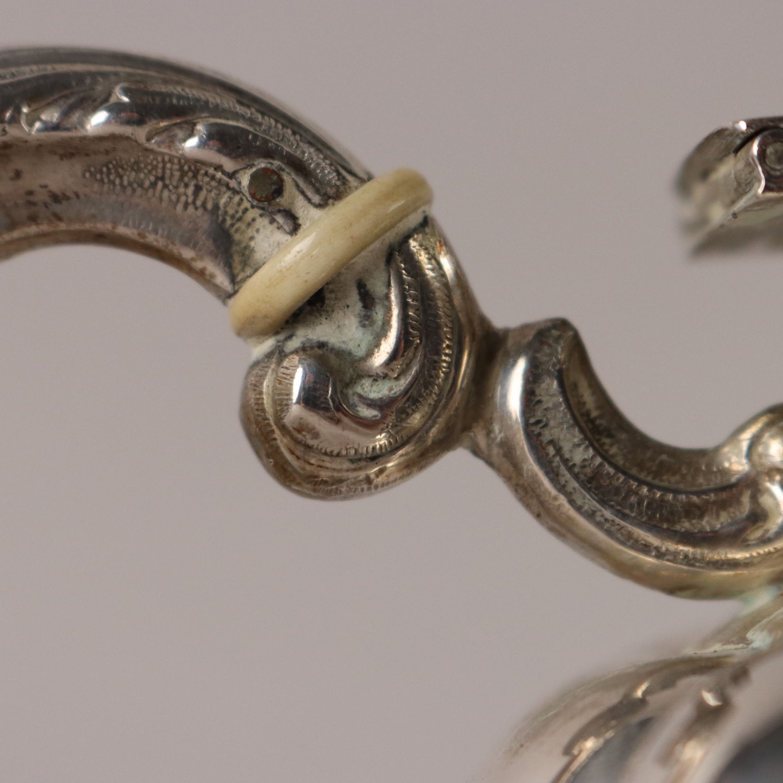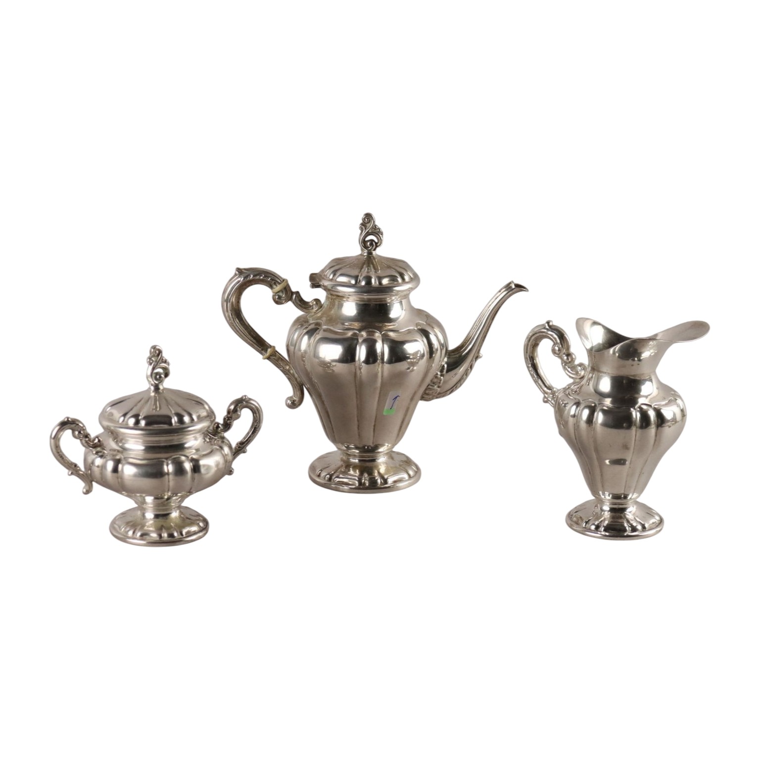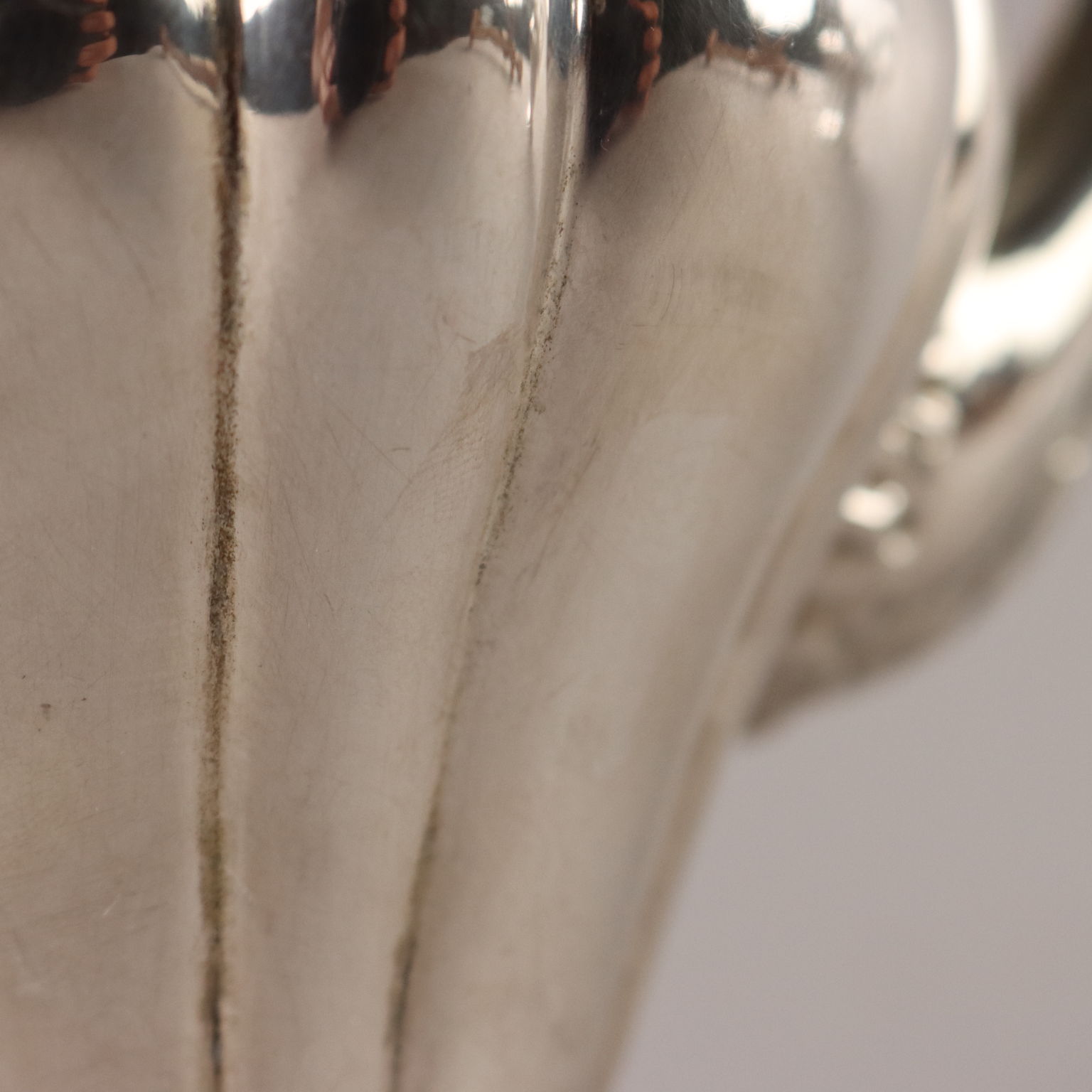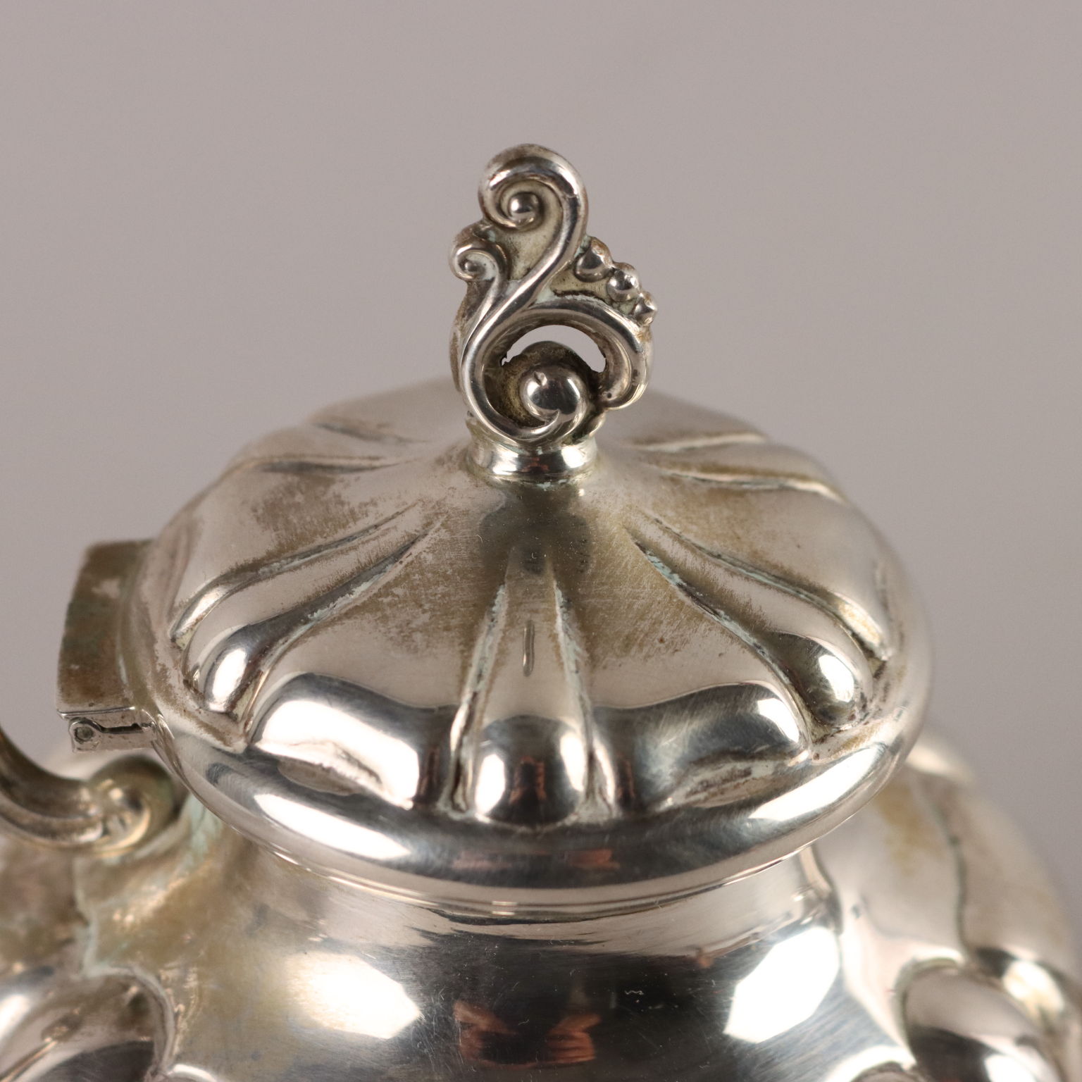 Servizio da caffè in argento sbalzato con bisellature e decori a volute fogliacee. Marchi dell'argento incussi sotto la base. Grammi 613.