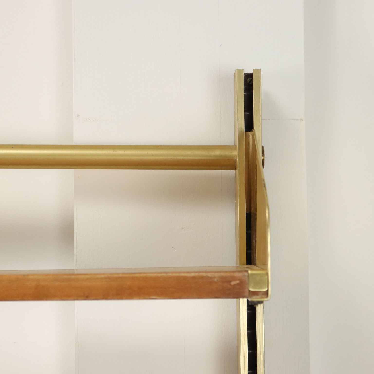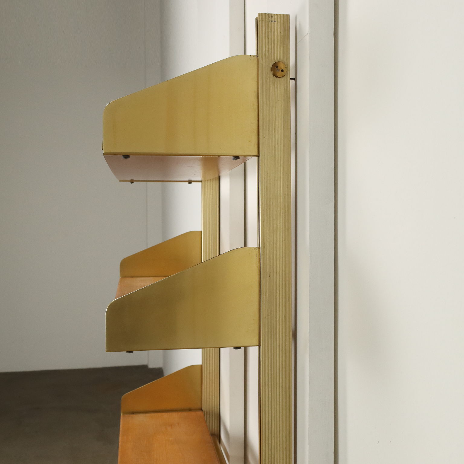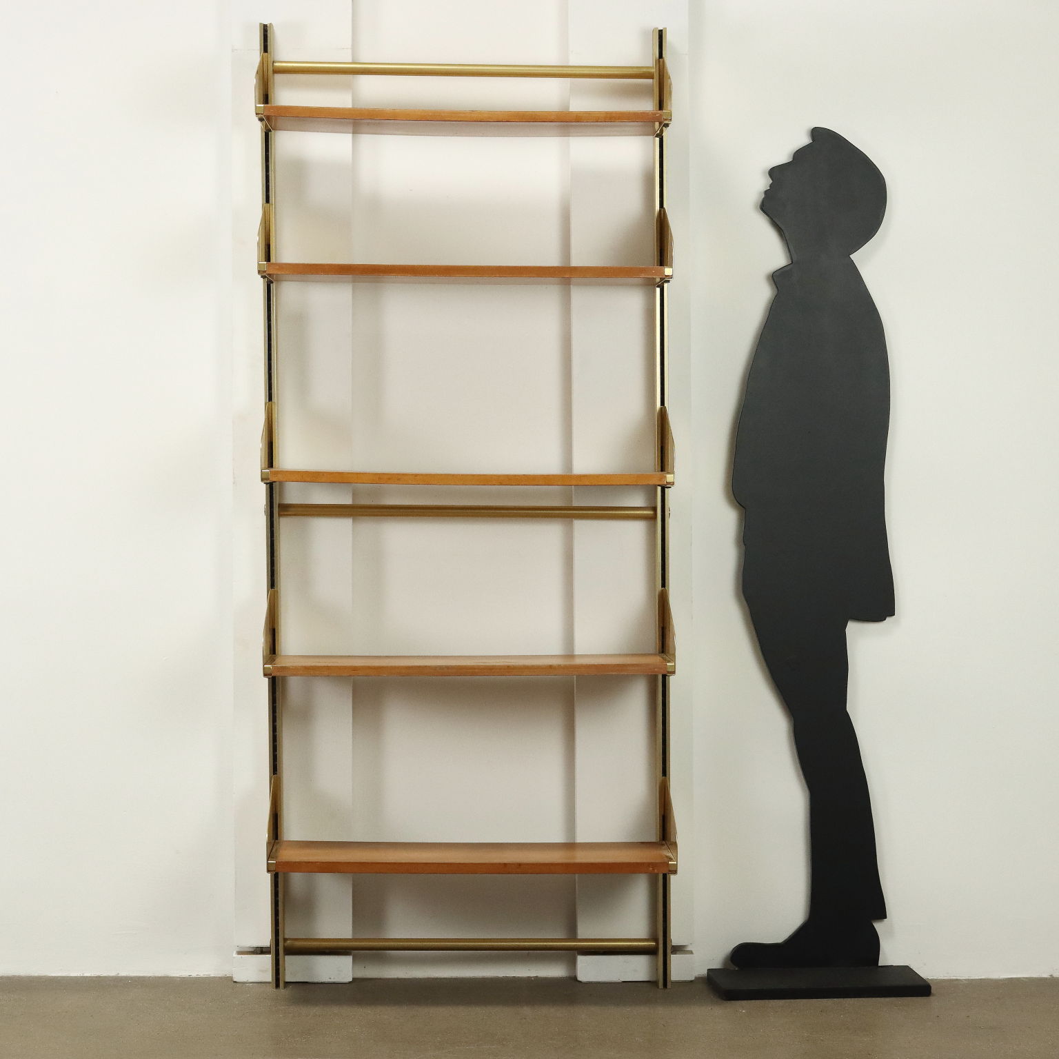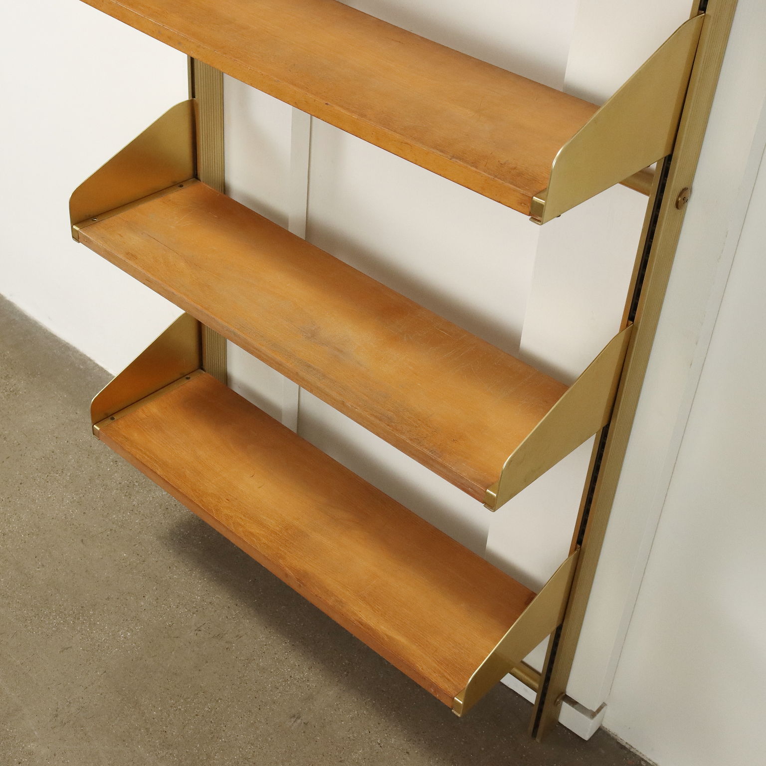 Libreria a parete, con ripiani a posizione regolabile, montanti e supporti ripiani in alluminio ottonato, legno impiallacciato mogano.