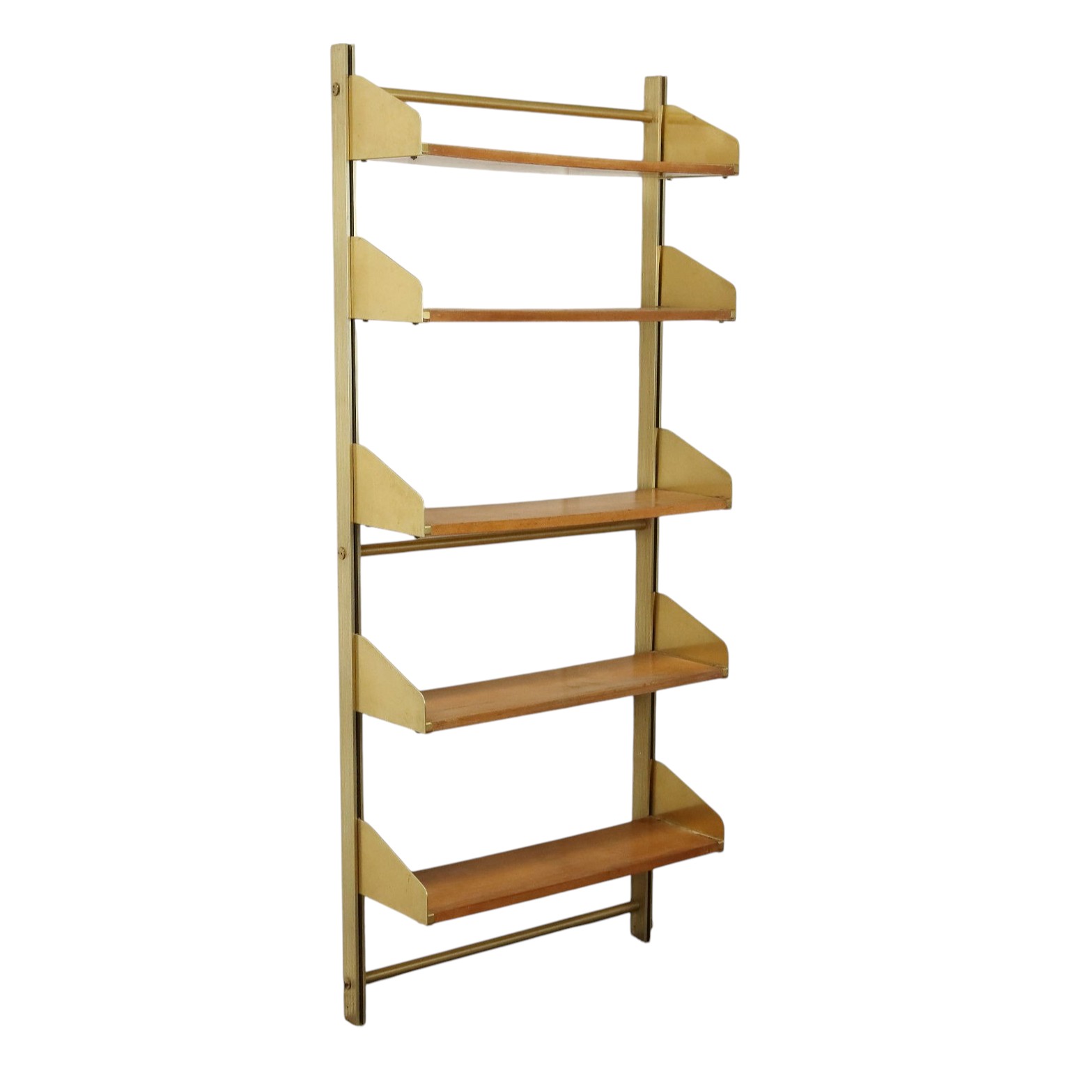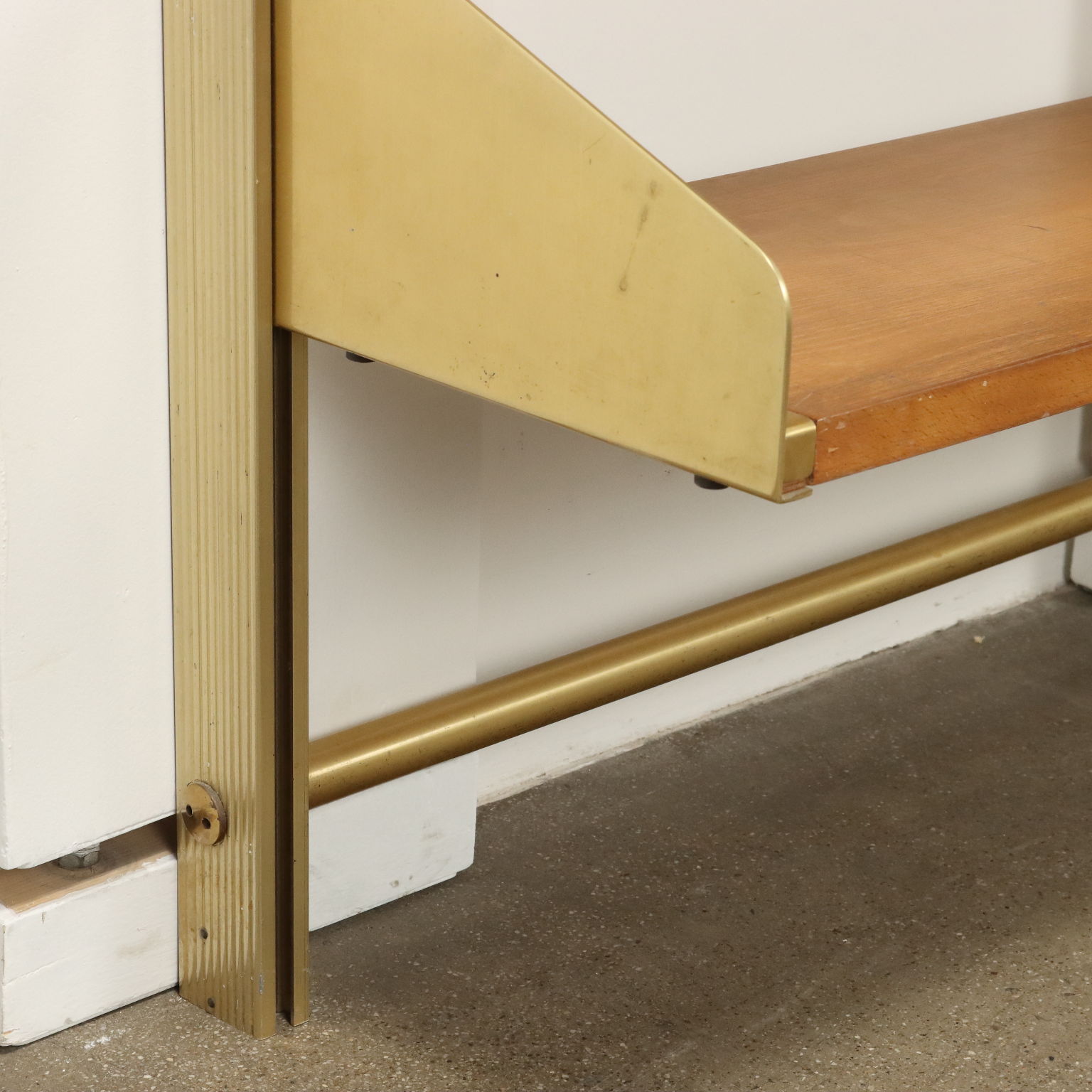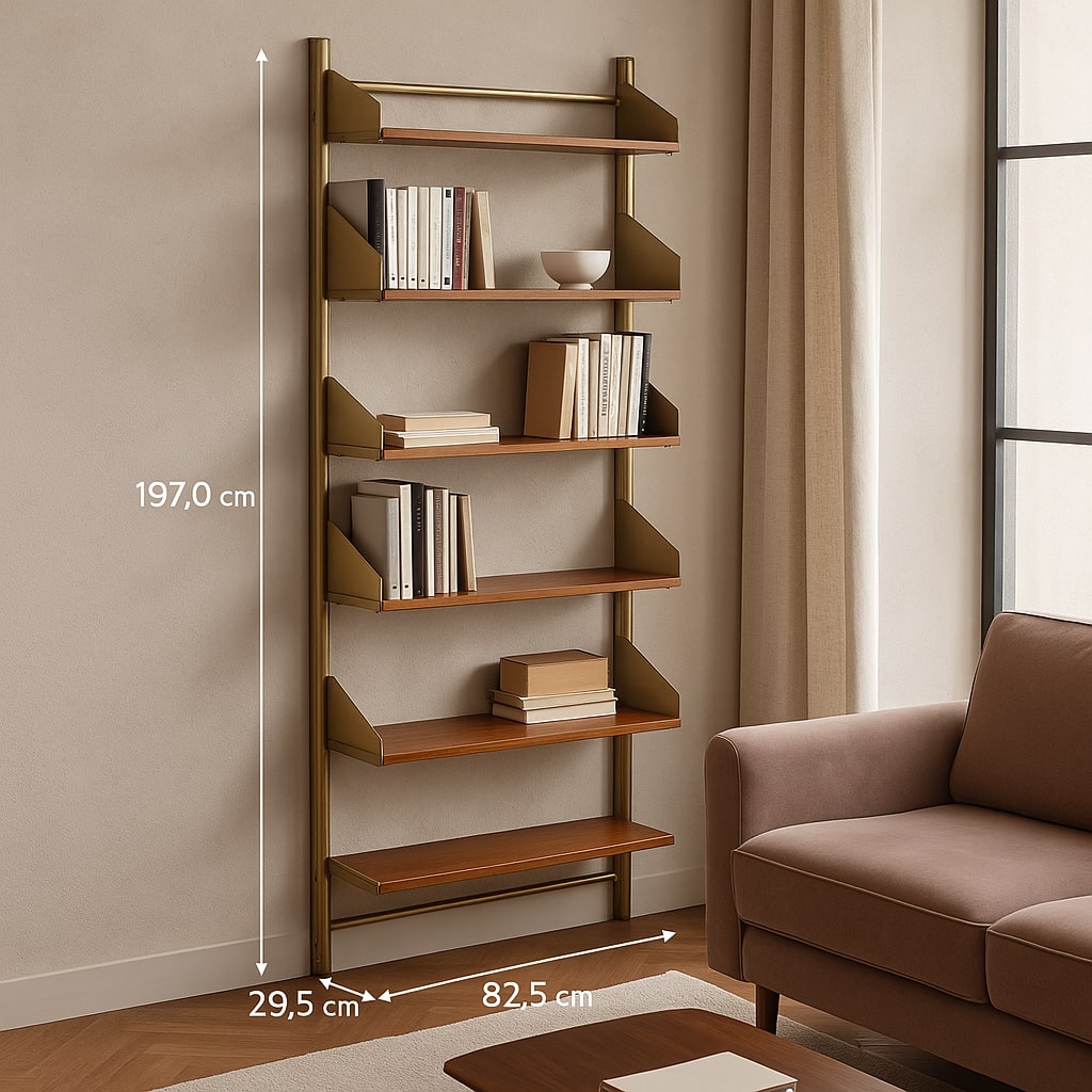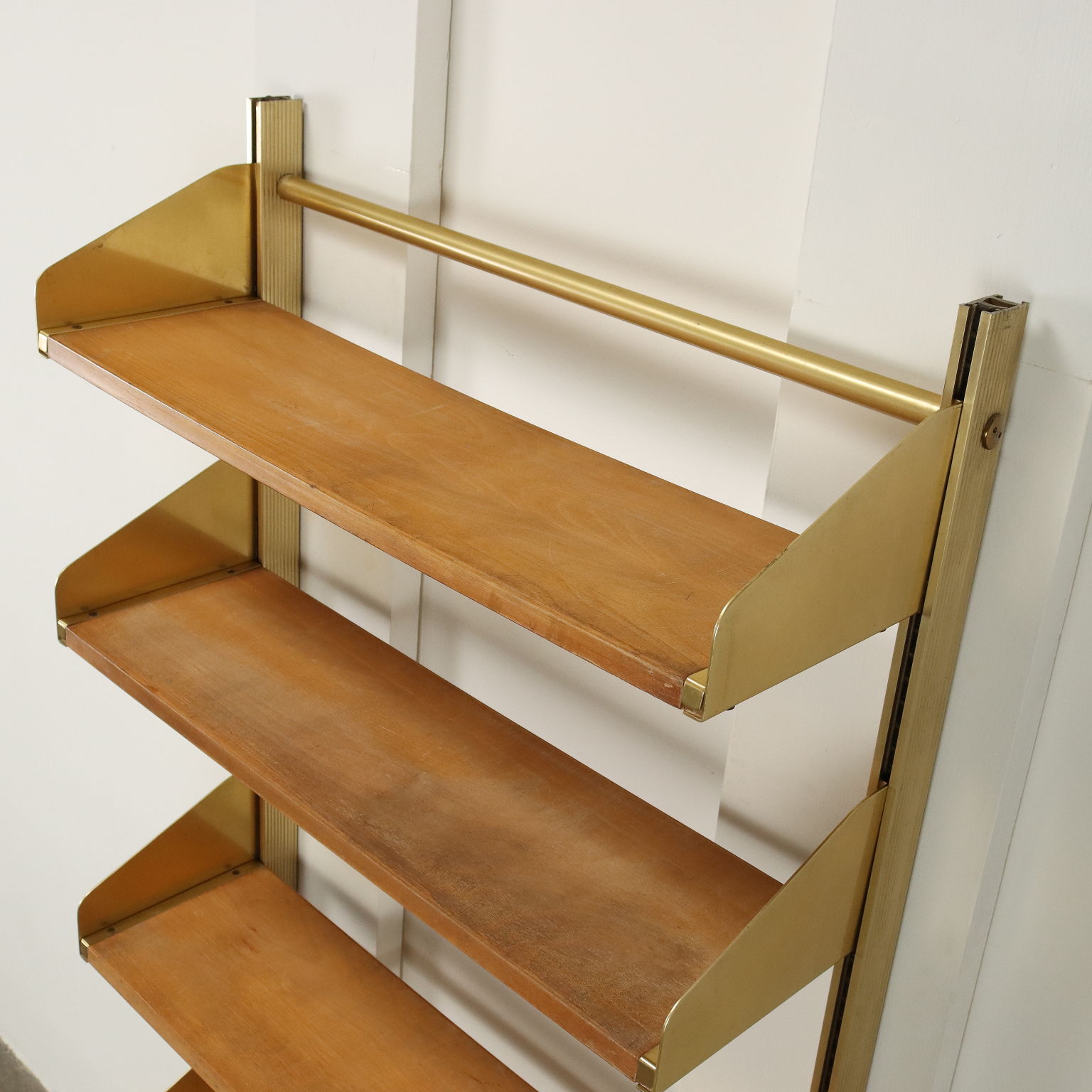 Libreria a parete, con ripiani a posizione regolabile, montanti e supporti ripiani in alluminio ottonato, legno impiallacciato mogano.