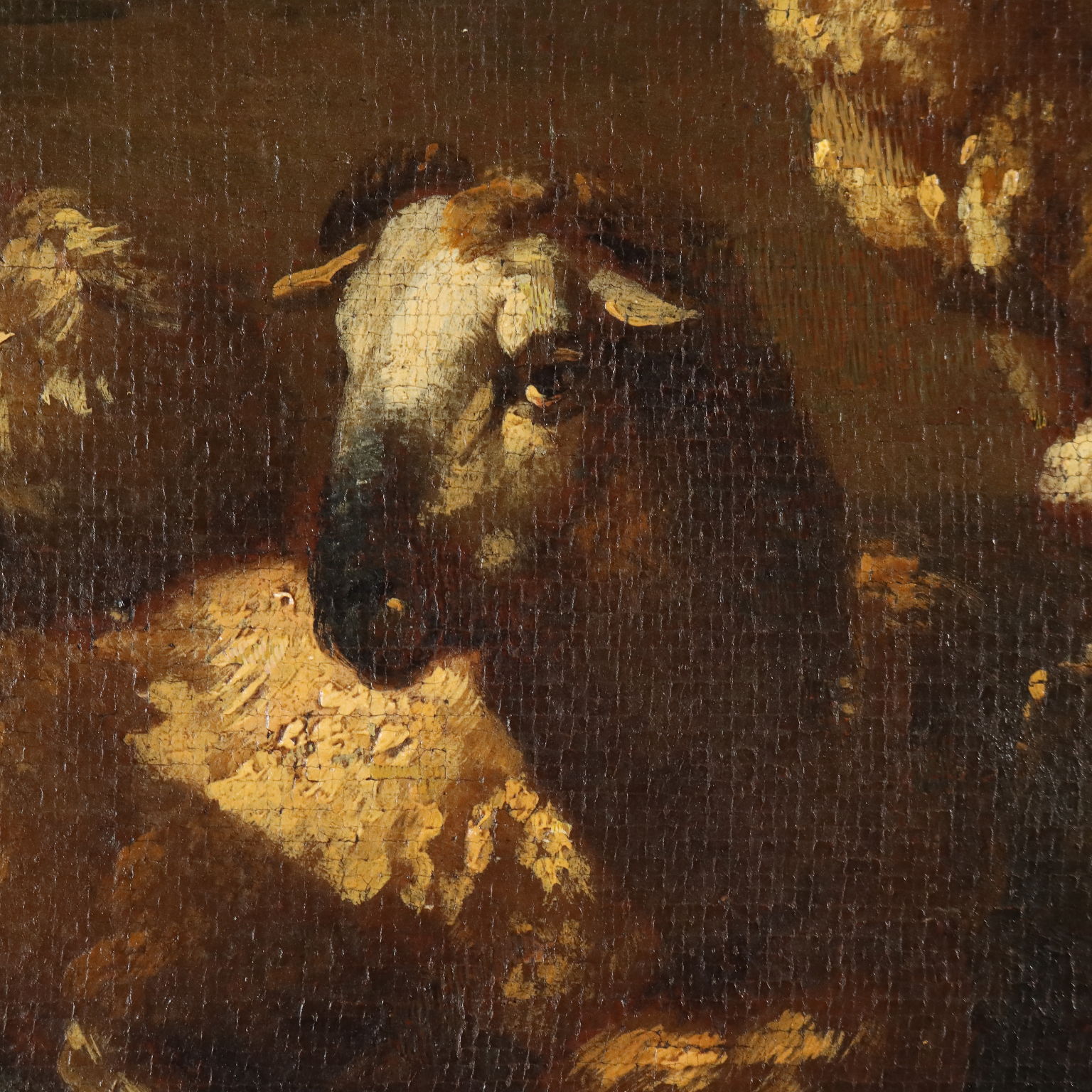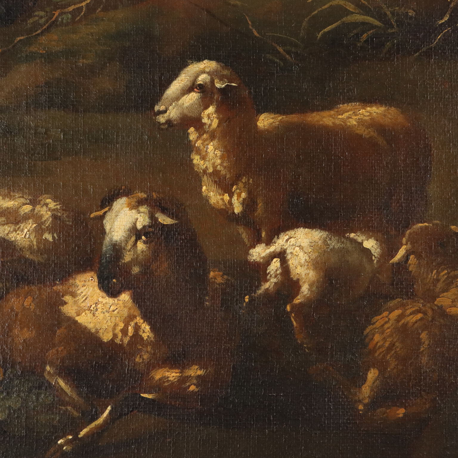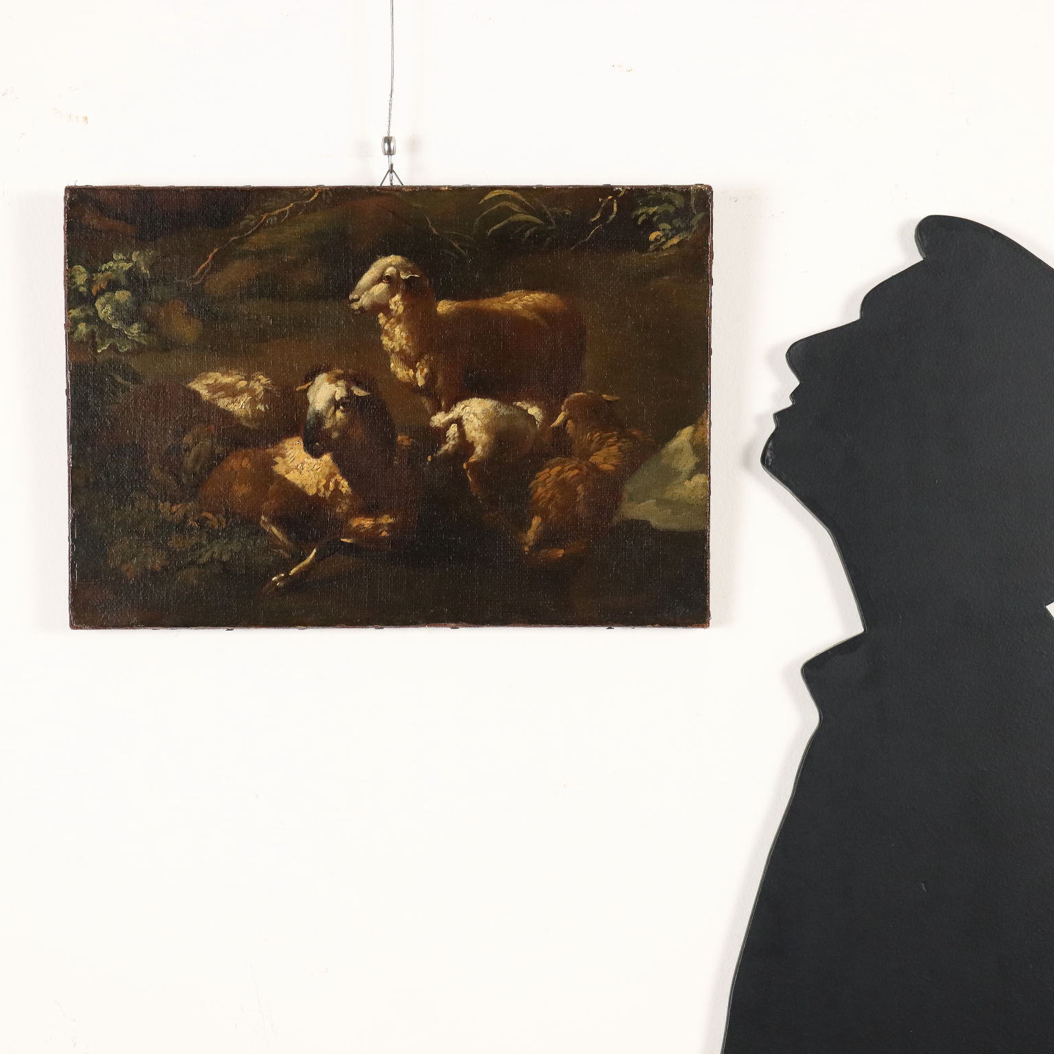 Olio su tela. L'opera presenta un gregge di pecore a riposo , nella campagna. L' accuratezza nel dipingere gli animali colloca l 'opera vicina alla produzione di Philip Peter Roos, noto come Rosa da Tivoli (1655 -1706 ca.): originario di Francoforte ma trasferitosi poi a Roma, ove rimase sino alla morte, questo artista fu attivissimo soprattutto come pittore di animali, ripresi in primo piano su sfondi paesistici ed eseguiti con colore ricco e intensi effetti di luce. Il grande successo che ebbe e la conseguente ampissima produzione (a volte a discapito della qualità delle opere), giustificano la frequente attribuzione a tale pittore e alla sua cerchia di opere dal soggetto e dalla tecnica pittorica vicine alla sua, come quella qui presentata. Peraltro l'opera è stata precedentemente attribuita anche al Londonio. Il dipinto è stato restaurato e ritelato.