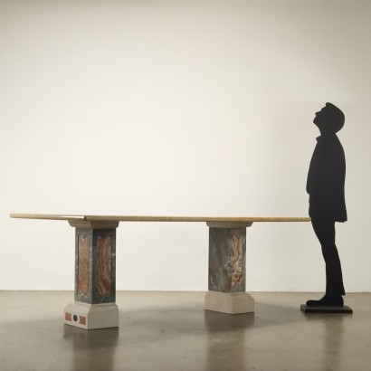 Grande tavolo in marmo; due balaustri reggono un piano in marmo bianco Carrara lastronato in giallo, i montanti sono due plinti con marmi a commesso, base bianca con inserti in rosso Verona e nero, plinti in grigio Bardiglio con inserti in alabastro fiorito.