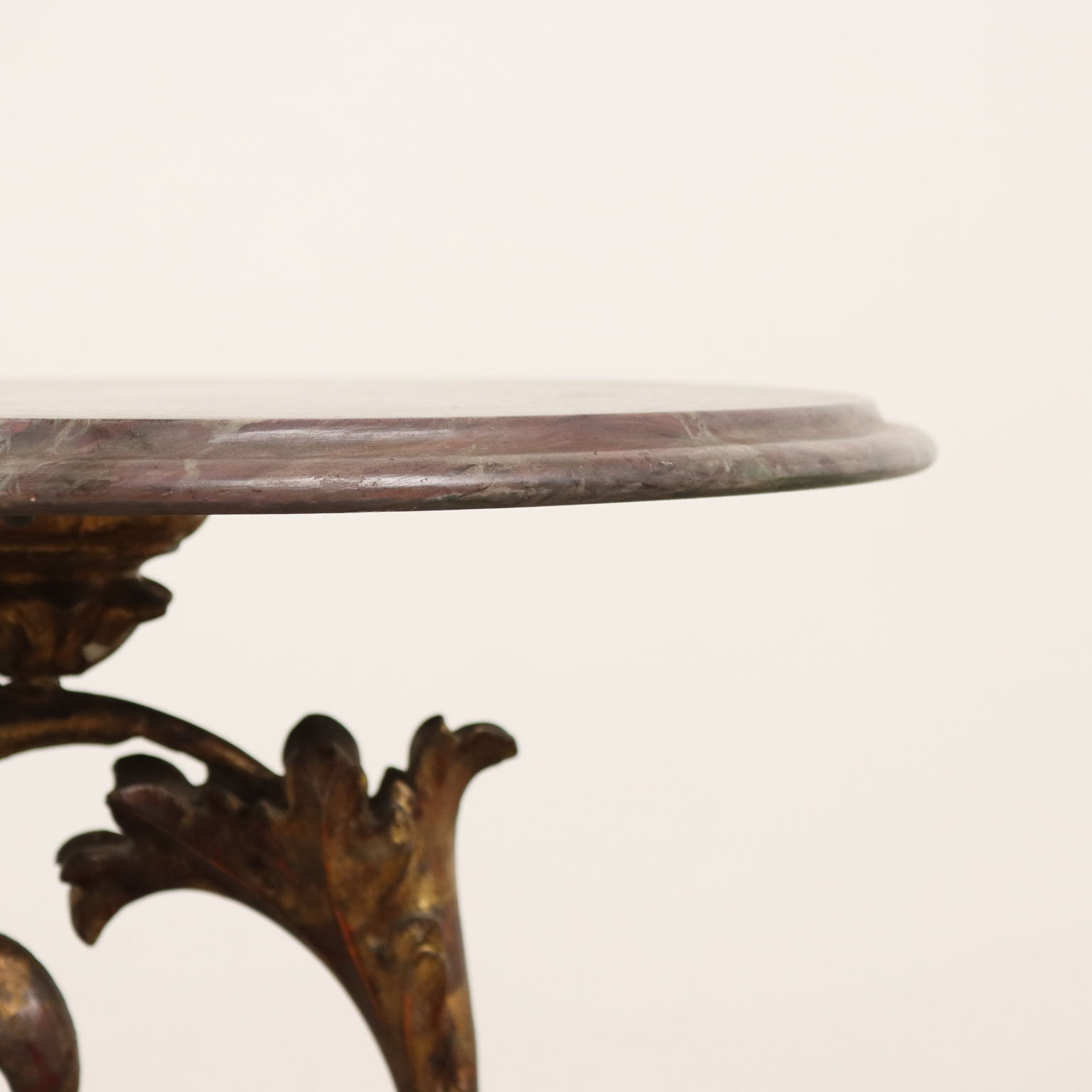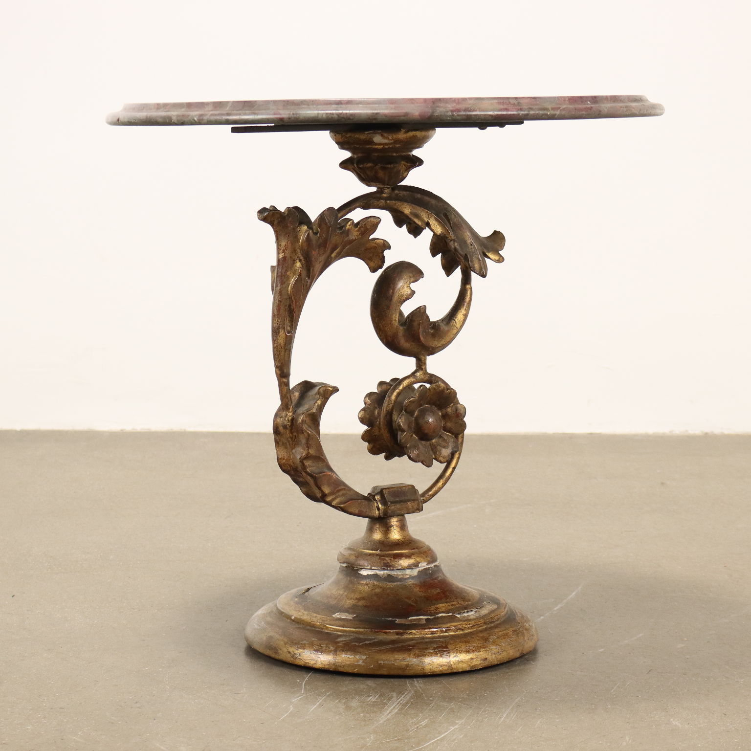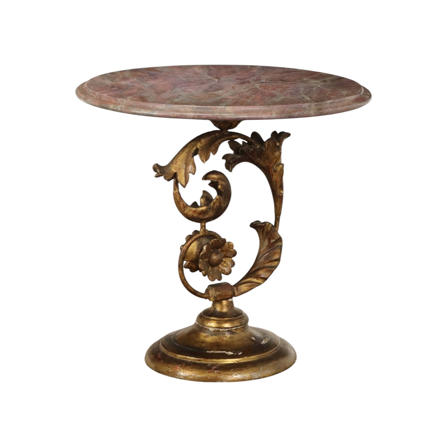 Tavolino con piano in legno dipinto a finto marmo sorretto da intaglio in ferro e legno dorati a mecca raffigurante foglie e fiori. Italia, XIX Secolo.