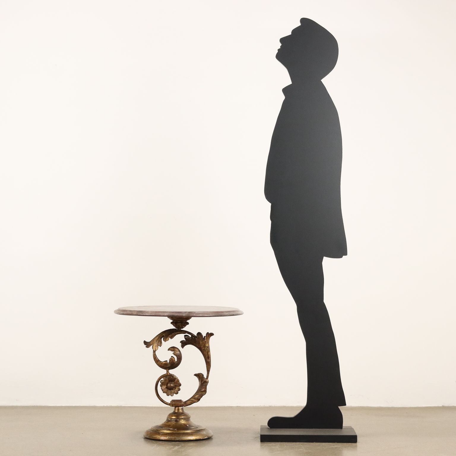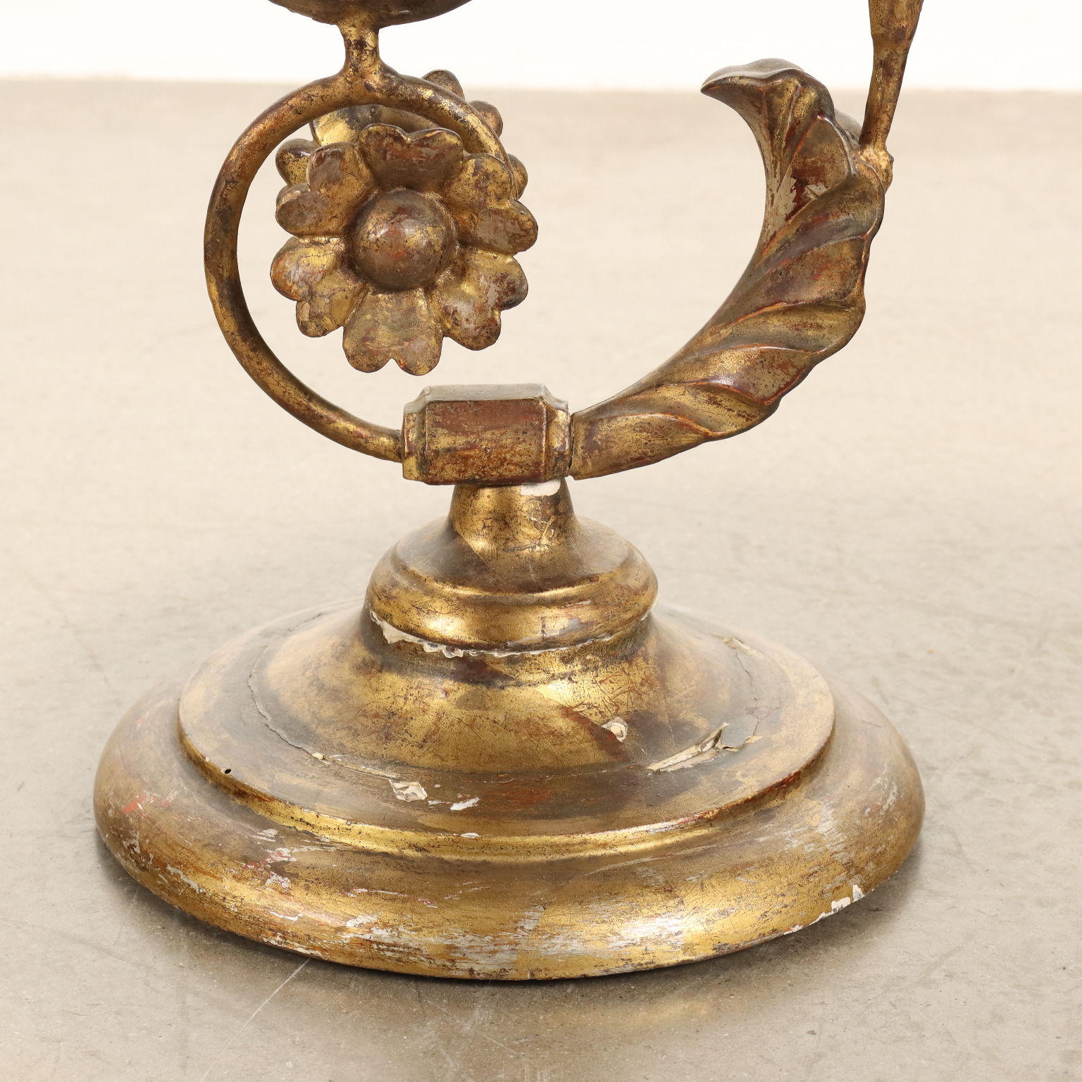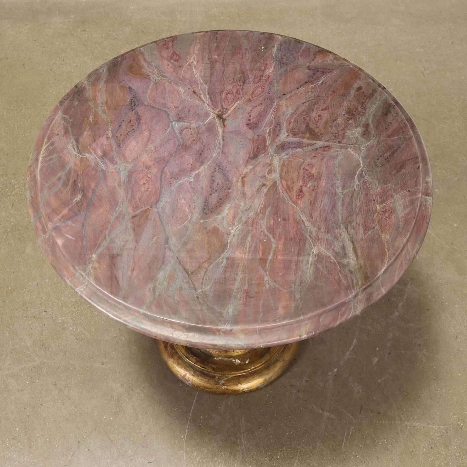 Tavolino con piano in legno dipinto a finto marmo sorretto da intaglio in ferro e legno dorati a mecca raffigurante foglie e fiori. Italia, XIX Secolo.
